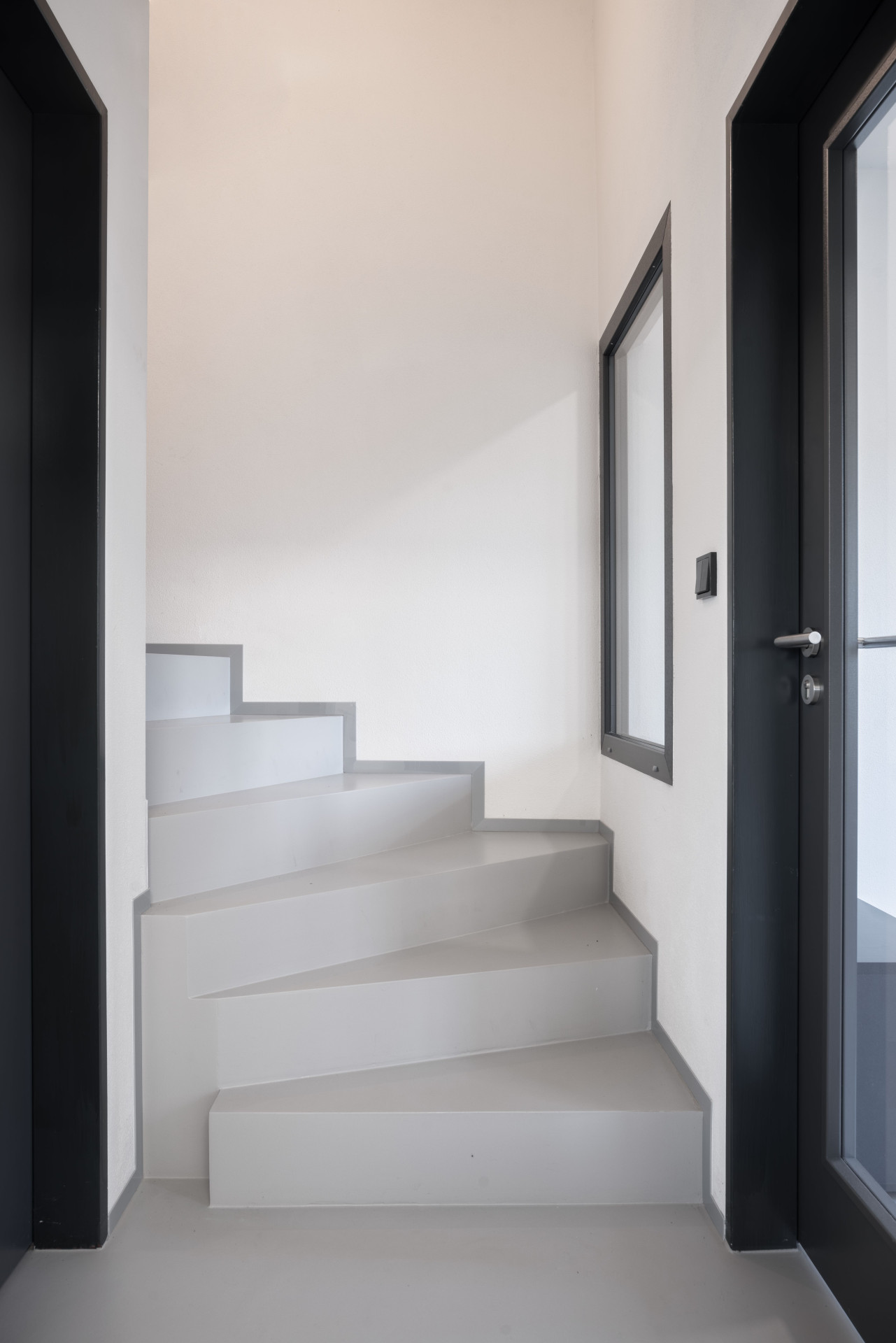 Pro zajištění optimální světlé výšky muselo dojít k vybourání těžkého železobetonového stropu a následnému vložení dvojice nových stropních konstrukcí z oceli – kanceláře totiž zaujímají spodní dvě patra, horní podlaží patří bytové jednotce s novým malým balkonem, odkud je po původním ocelovém schodiště přístupná také střecha s výhledy do kraje. Veškeré nové konstrukce jsou sjednoceny černým nátěrem.