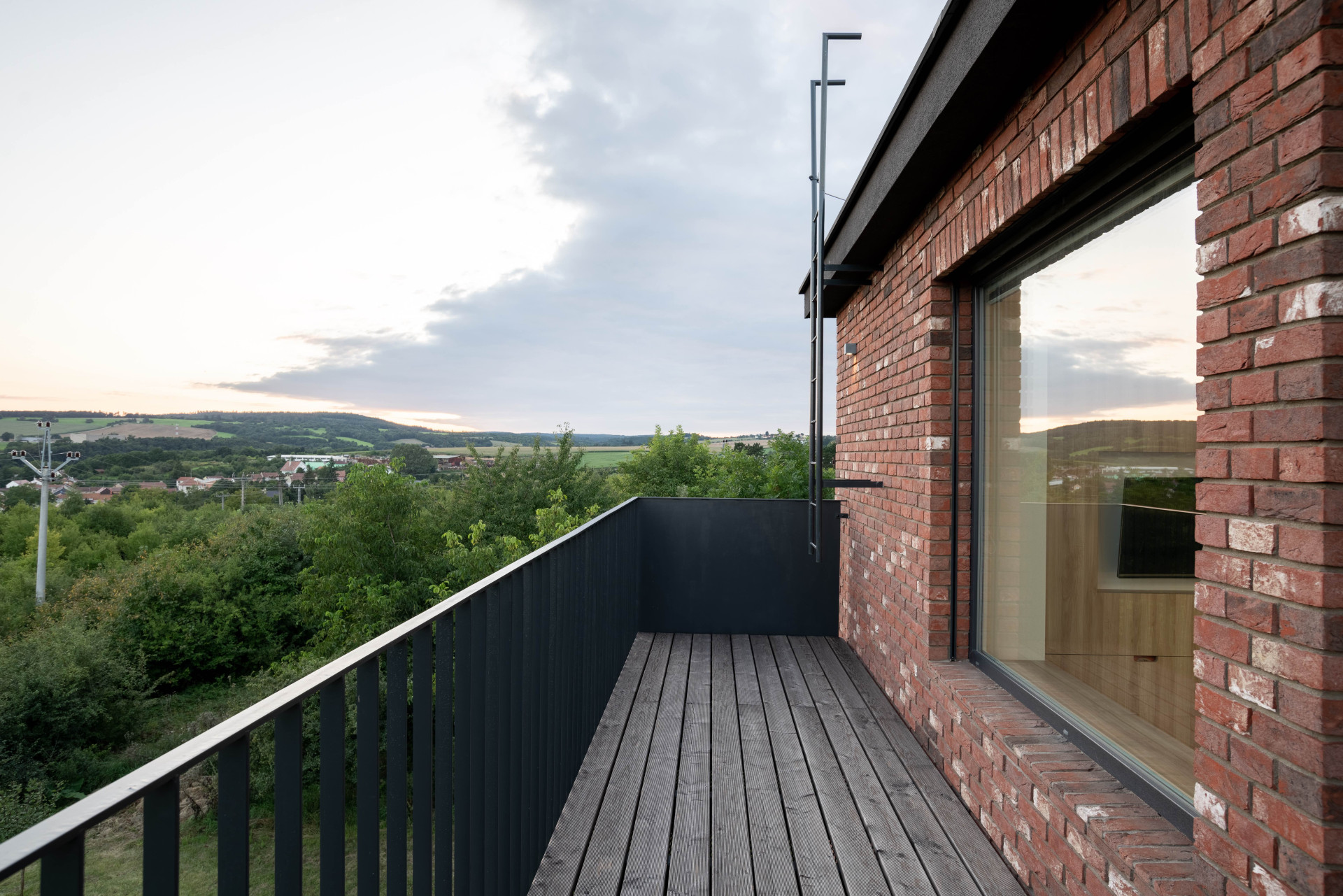 Na kancelář v přízemí architekti navázali dřevěnou vstupní terasou pro zajištění přímého kontaktu mezi interiérem a exteriérem. „Postupně by měla zahrada znovu ‚kontrolovaně‘ zarůst a trafostanice by se tak vrátila zpátky do své původní polohy – sama stárnoucí v zeleni u křižovatky a shlížející dolů na pole, lesy i město,“ dodávají architekti.