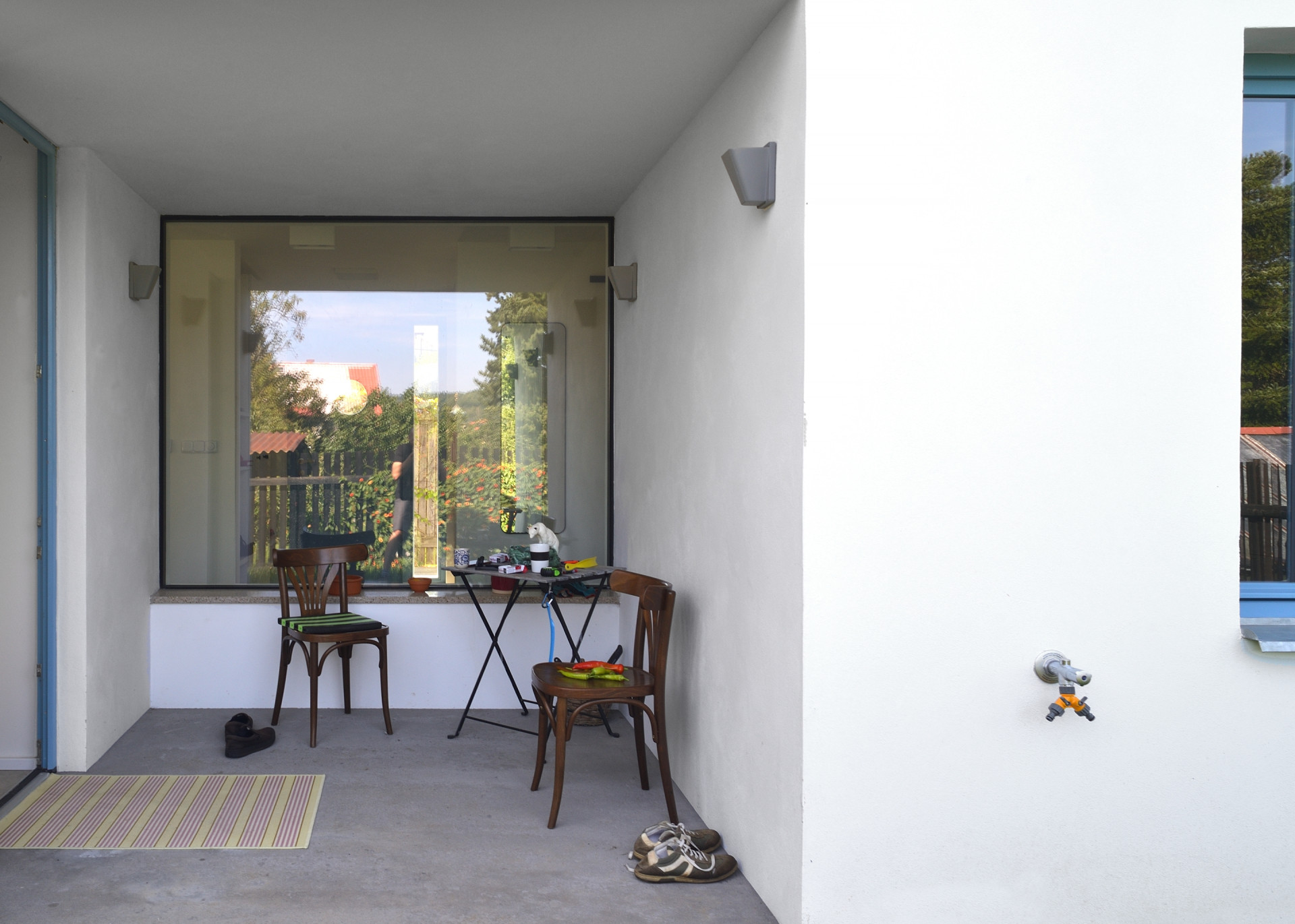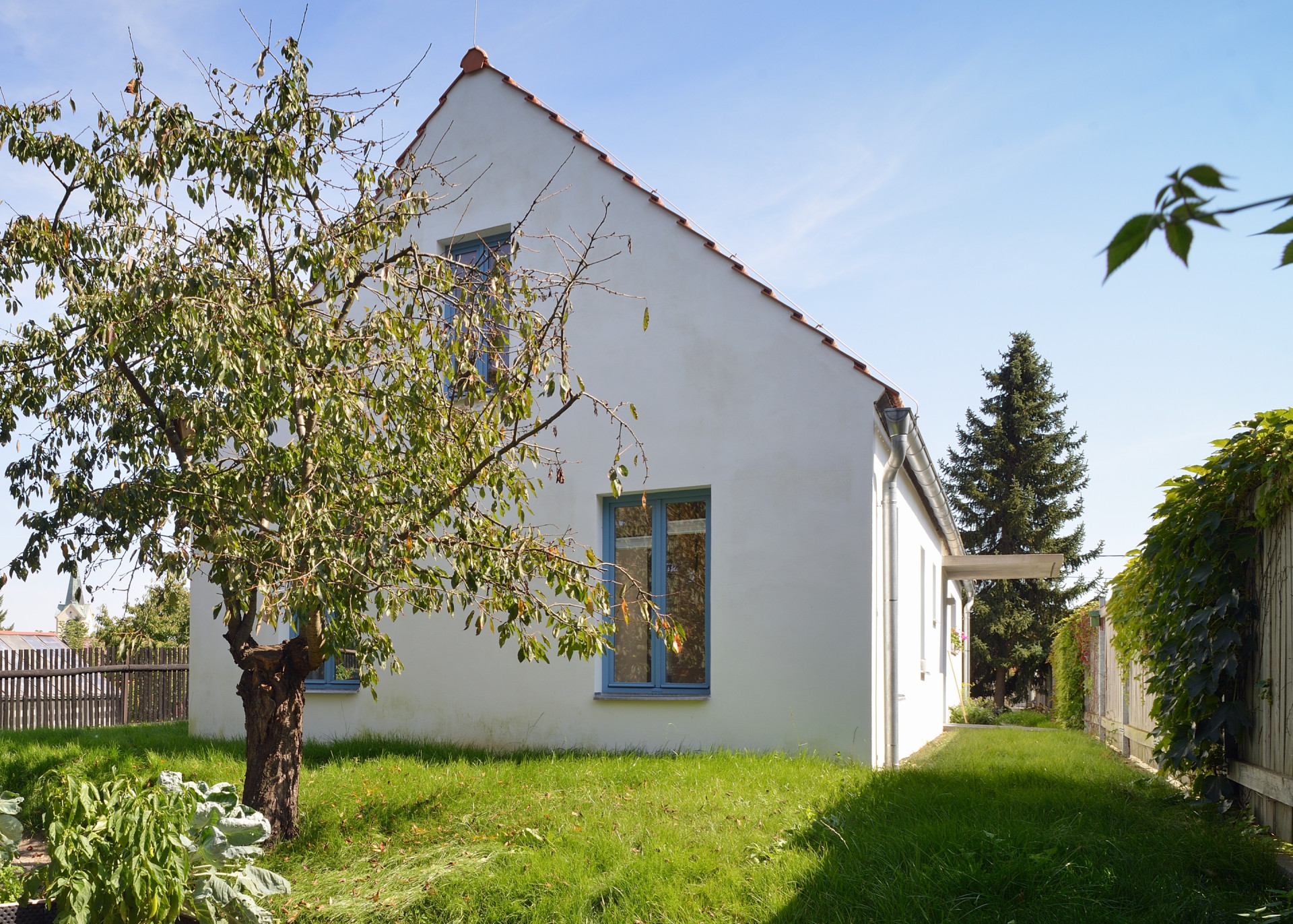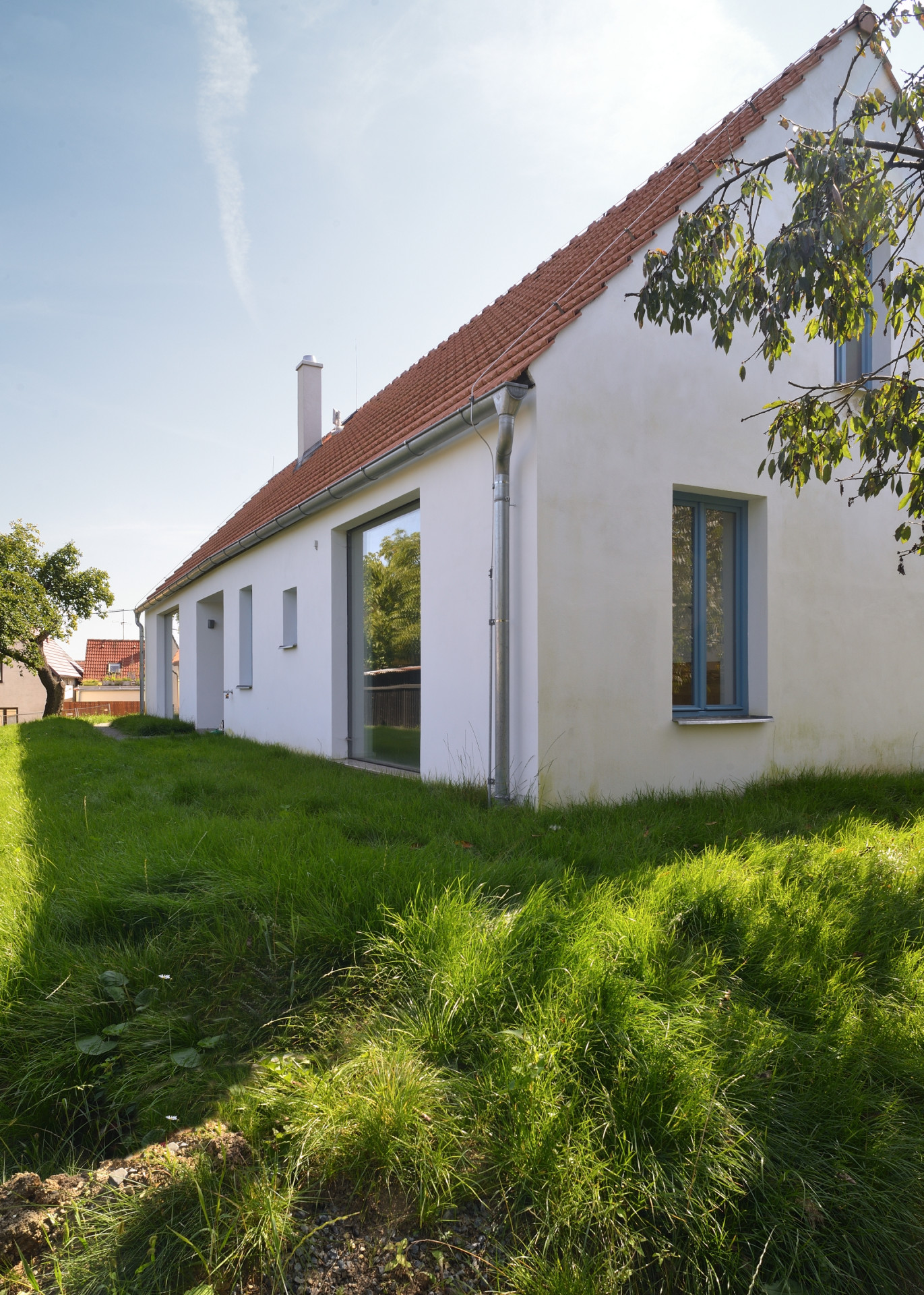 Po vzoru sousedních domů je stavba postavena na obdélníkovém půdorysu se sedlovou střechou bez přesahů, kterou kryje klasická pálená taška. Hladkou bílou omítku rozjasňují okna ve světle modrých rámech. Se zahradou je dům vizuálně propojen díky velikým fixně zaskleným oknům použitým jak v převýšeném obytném prostoru, tak i v ložnici nebo u malé zastřešené terasy.