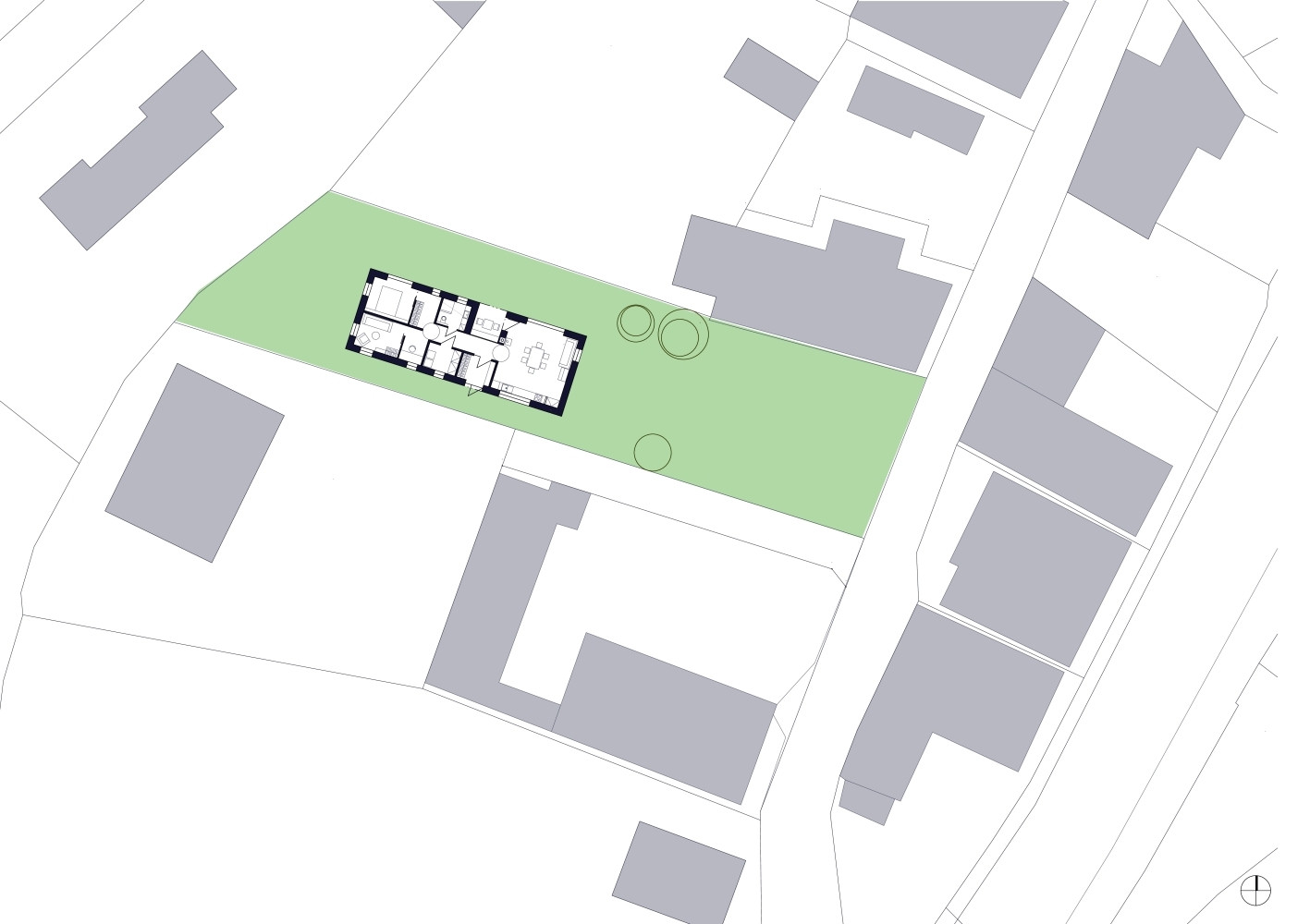 Vzrostlé ovocné stromy, obyčejný plaňkový plot i přírodní okolí, to vše přispívá k takřka venkovskému rázu zvoleného pozemku v rámci středočeského maloměsta. K archetypálnímu pojetí navrhovaného domu architekty přiměly dané okolnosti. „Tvar parcely, legislativa a ochranářství volající po konzervativním tvarosloví a materiálech, nás vede k variování tradičního domu s úzkým dlouhým půdorysem a dispozičním trojdělením,“ přibližují svůj záměr autoři. „Toto do značné míry okolnostmi formulované řešení nám však není ztrátou. Základní téma tradičních materiálů a archetypálního tvarosloví nám tu připadá příhodné.“