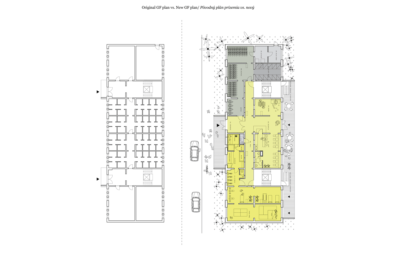 gutgut, Panelák v Rimavskej Sobote, půdorys 1. NP, původní i nový stav - foto