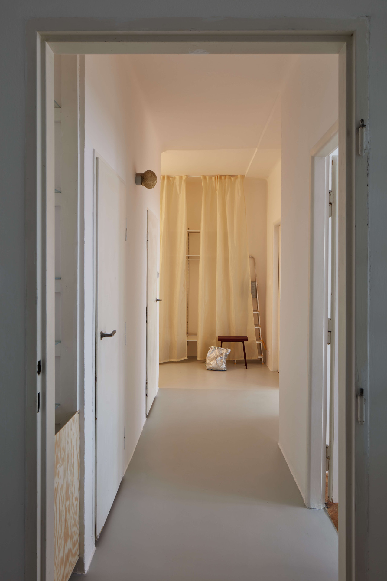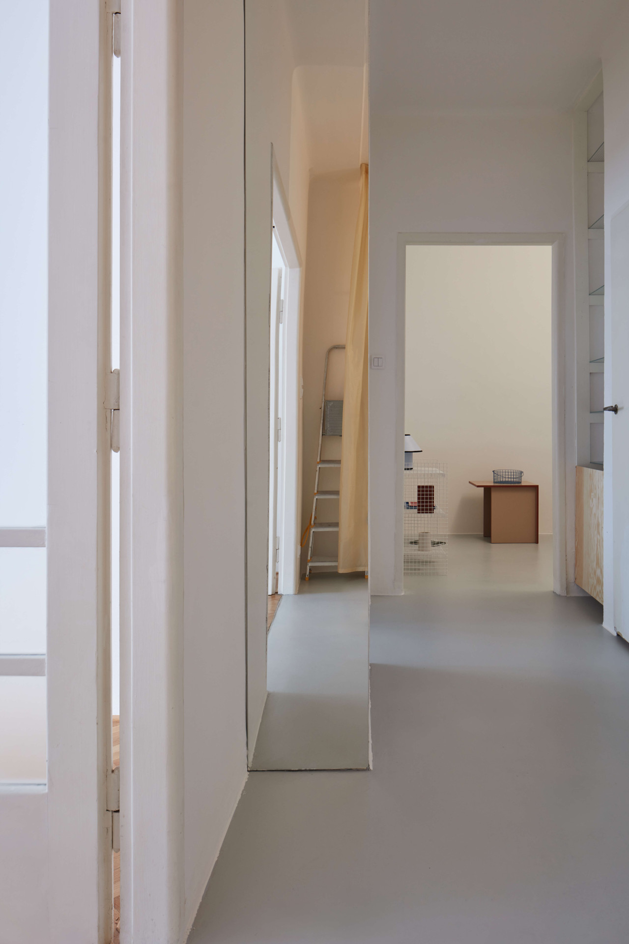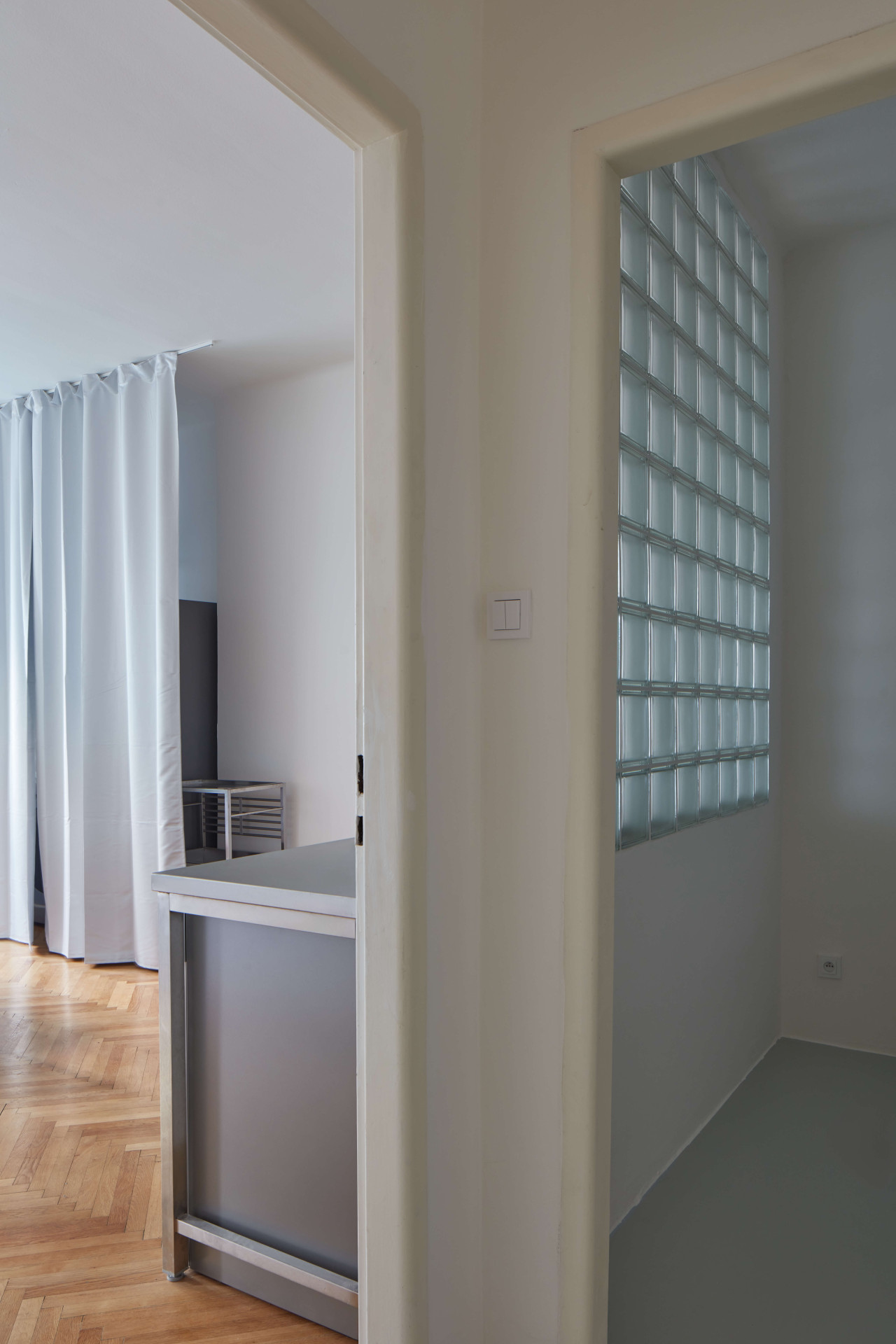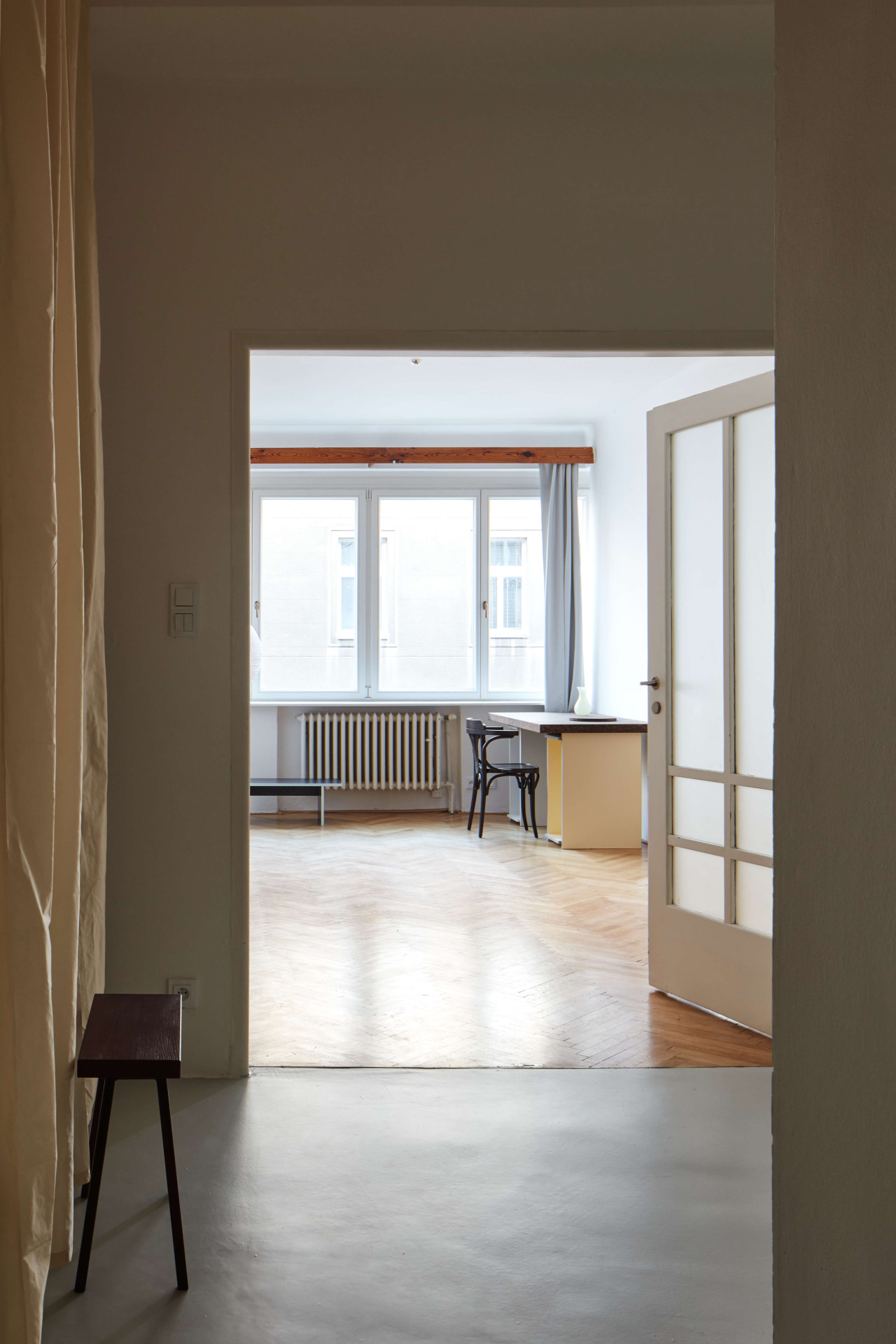 Nachází se v domě ze třicátých let a před příchodem Prokopa Hartla se naposledy upravoval v roce 2005. Prý hodně špatně, nekvalitně. Třeba problematicky položenou dlažbu teď nahradila nová epoxidová podlaha, členitou dispozici zase velkoryseji propojené prostory – na chodbu navazují dva velké pokoje, jeden s kuchyní, druhý obývací. Vzájemně propojené jsou průřezem ve stěně, která je od sebe jinak odděluje.