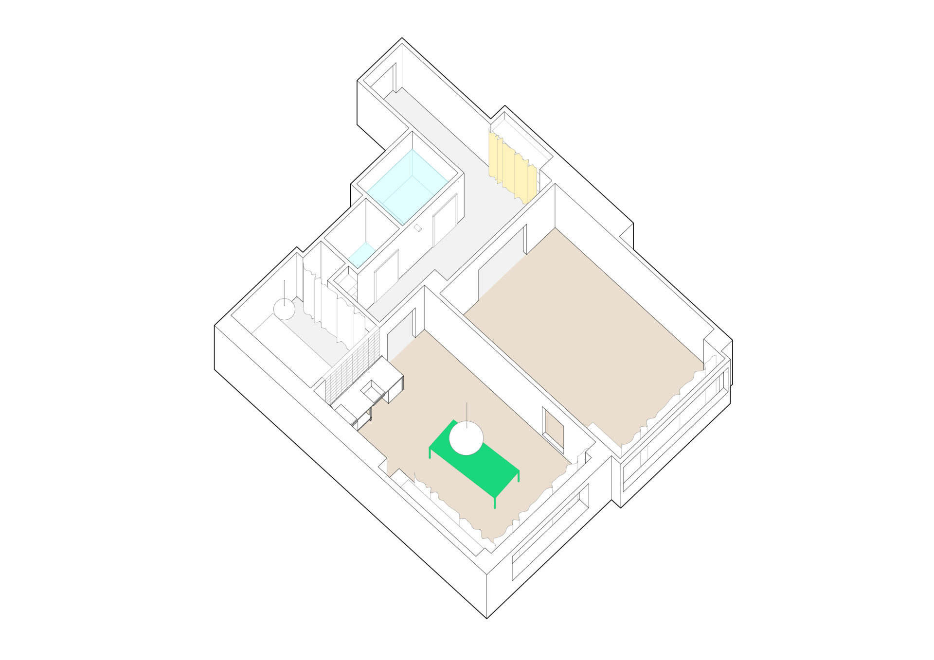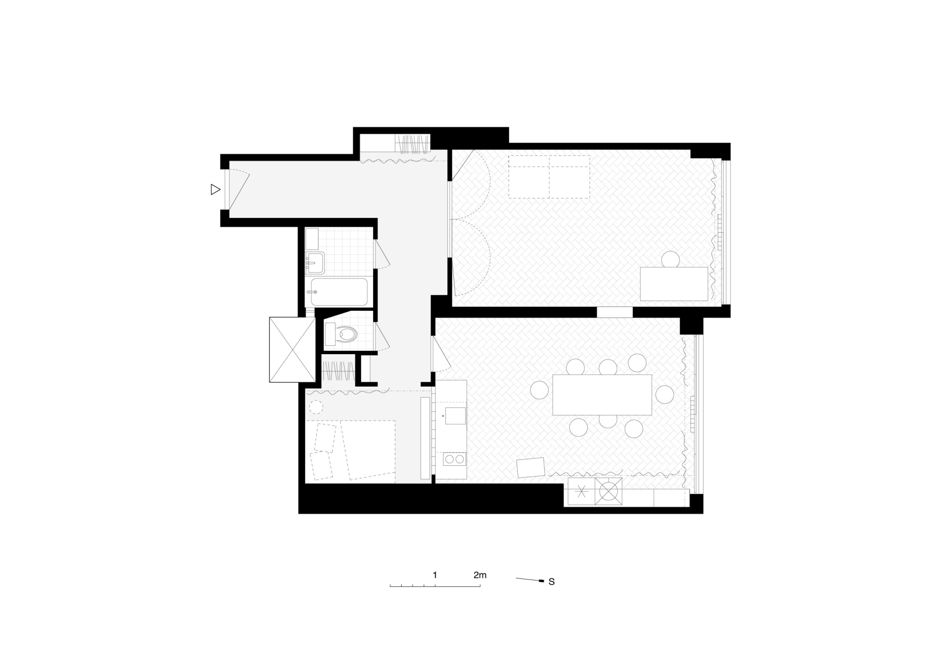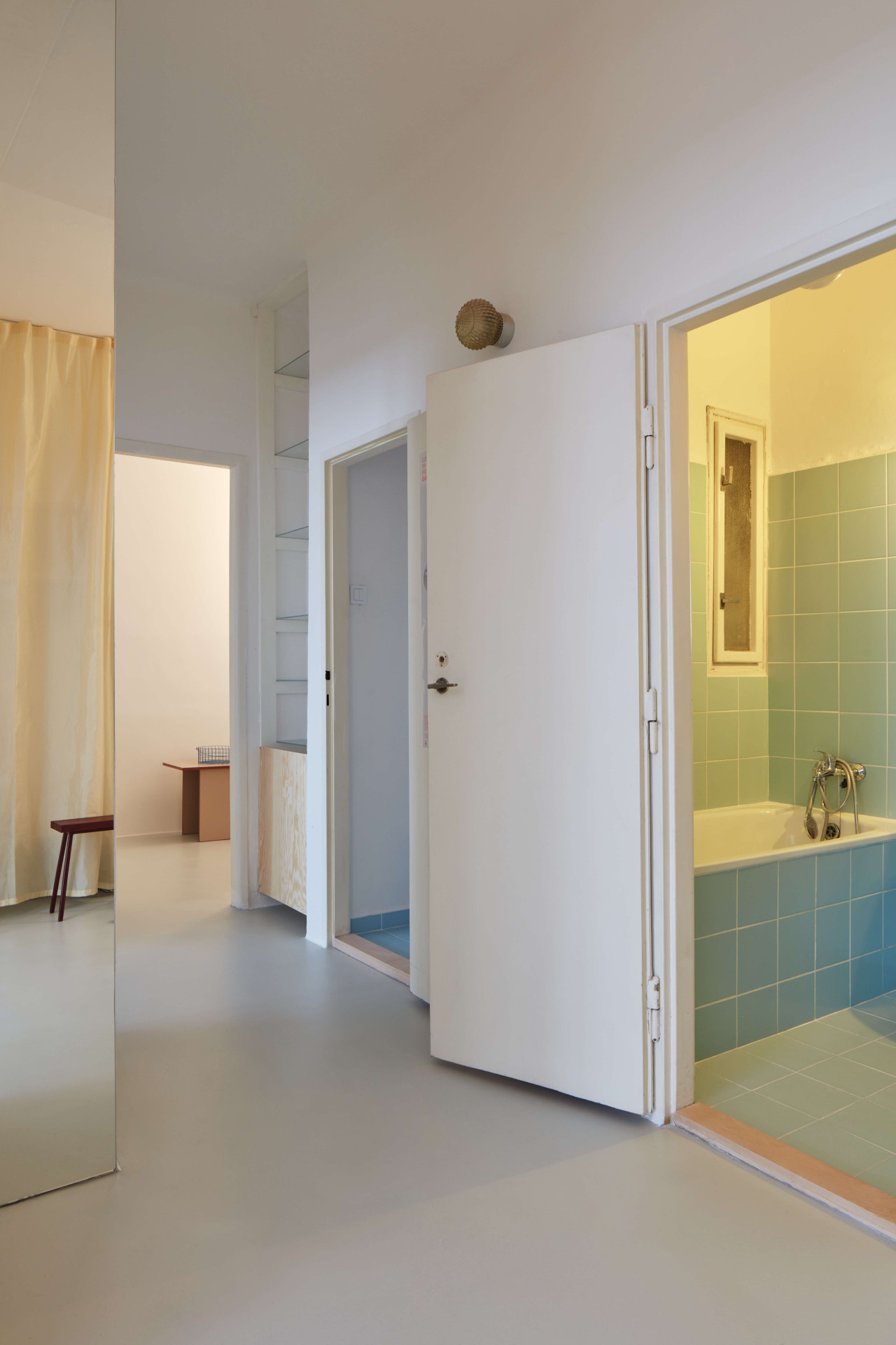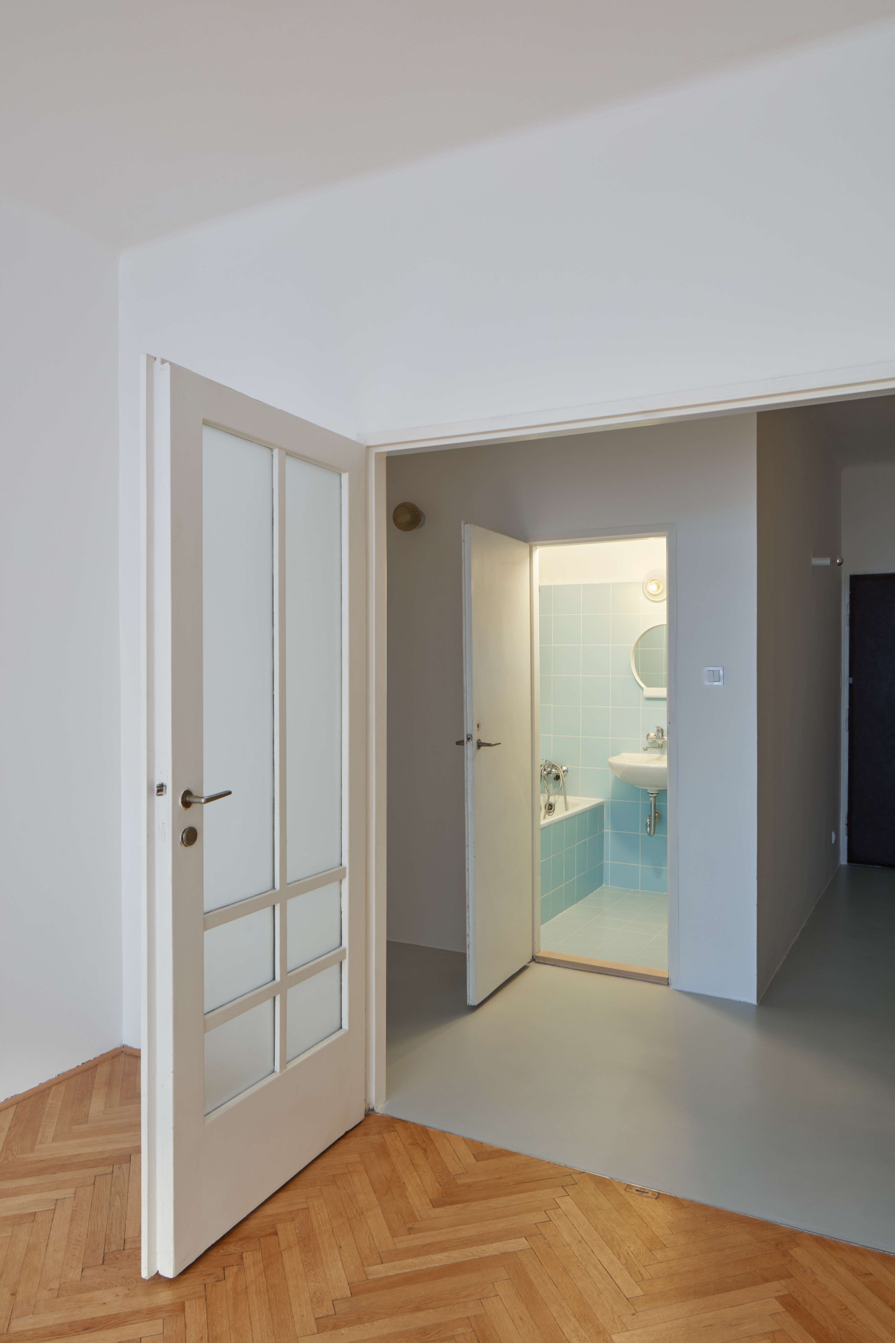 Nachází se v domě ze třicátých let a před příchodem Prokopa Hartla se naposledy upravoval v roce 2005. Prý hodně špatně, nekvalitně. Třeba problematicky položenou dlažbu teď nahradila nová epoxidová podlaha, členitou dispozici zase velkoryseji propojené prostory – na chodbu navazují dva velké pokoje, jeden s kuchyní, druhý obývací. Vzájemně propojené jsou průřezem ve stěně, která je od sebe jinak odděluje.