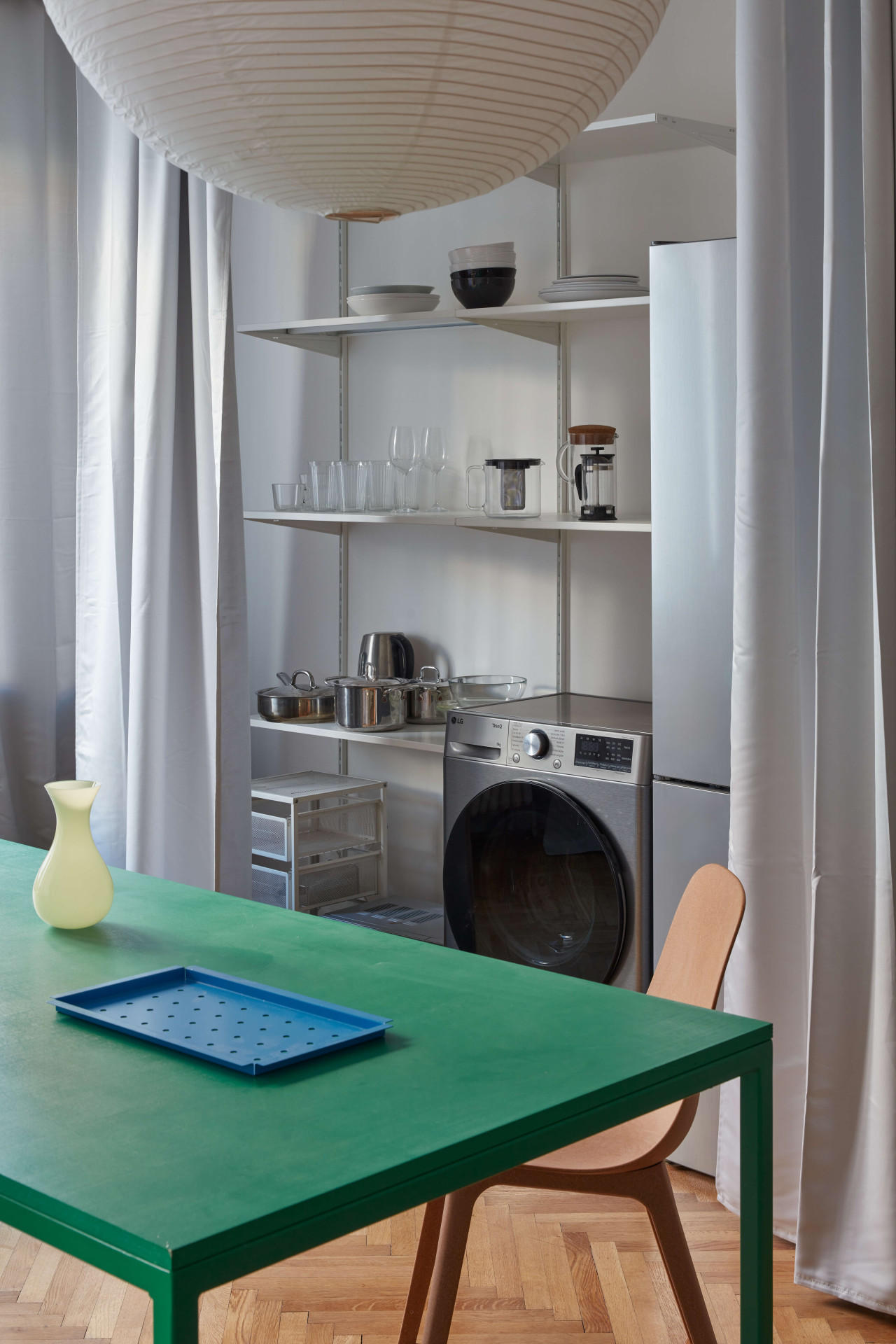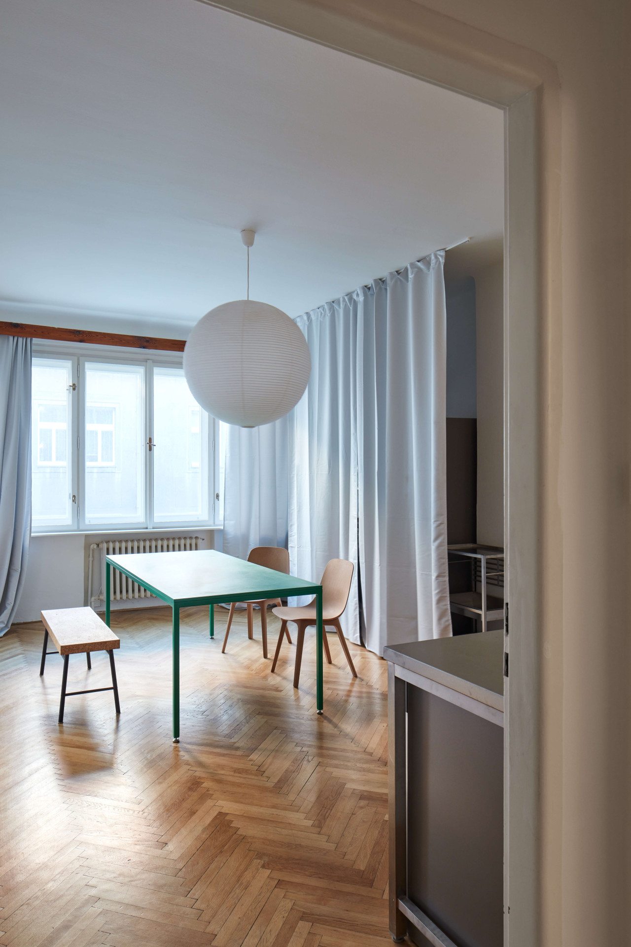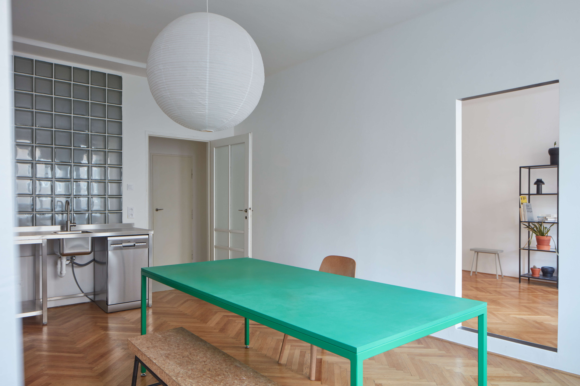 Navrhl si byt, ve kterém je toho záměrně málo. Nerezová kuchyňská linka, policové regály a zelený stůl – ten si navrhl taky. Prokop Hartl je totiž původně designér, který se ale zhlédl v architektuře, a tak teď pracuje v architektonickém studiu. „Mám ale i takové malé anti-designové studio, jmenuje se anýz,“ říká. Anti-designové mu přezdívá proto, že ho nebaví nablýskané produkty. Na svých webovkách má hlavně nábytek, strohý, často jednobarevný s ostrými hranami. Podobný je i jeho byt na Letné, který v podstatě prošel pouze očištěním od nepraktických nánosů.