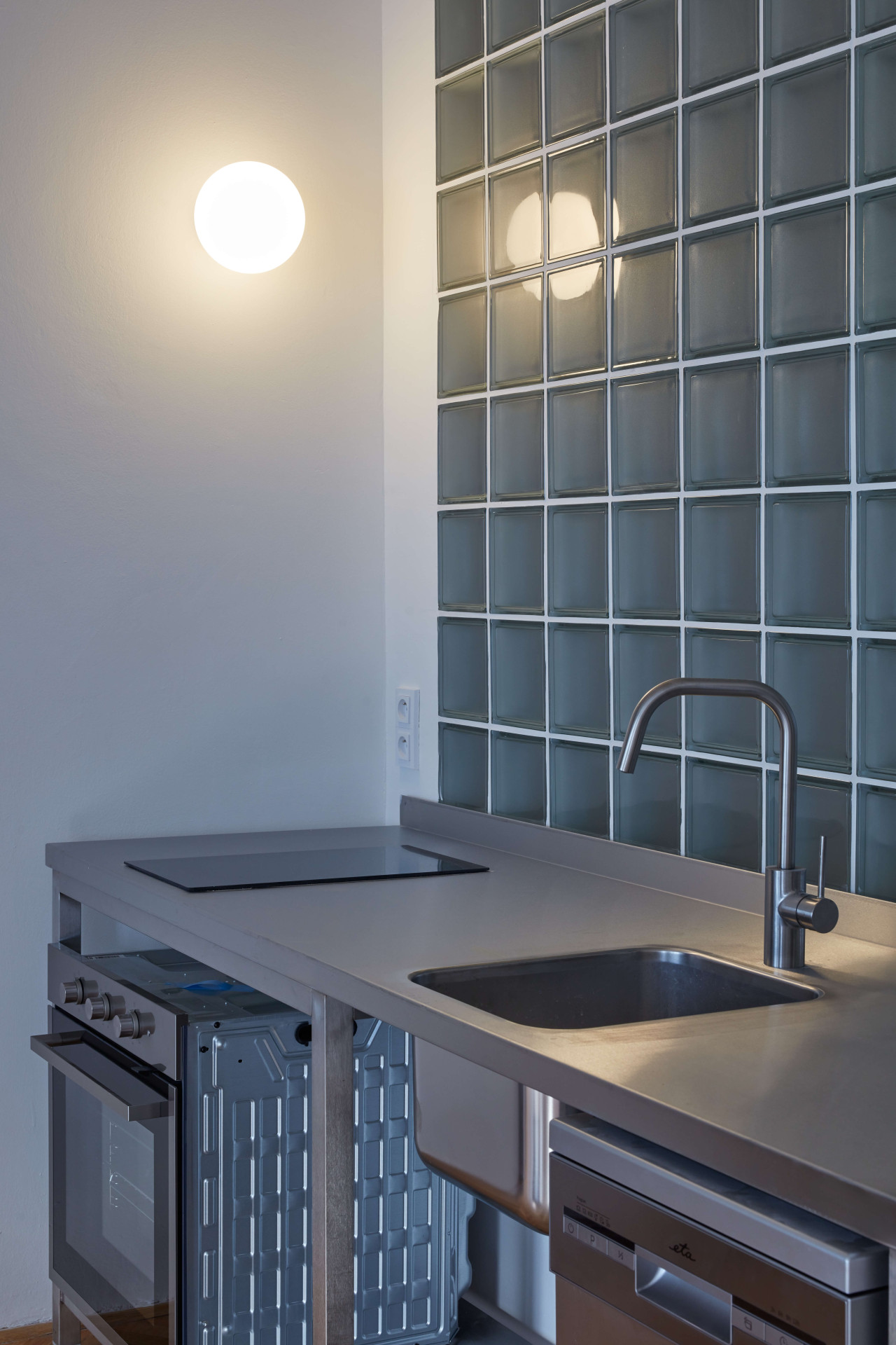 Byt chtěl rekonstruovat nejdřív pro sebe, nakonec ale bydlí jinde a pronajímá ho. „Proto v bytě nejsou jasně definované funkce jednotlivých místností, to si rozhodne nájemník sám,“ vysvětluje. Tam, kde je na výkresech postel, tak ve výsledku ložnice vůbec být nemusí. Příjemná by tam ale asi byla, do pokoje proudí nepřímé světlo skrze příčku z luxfer.