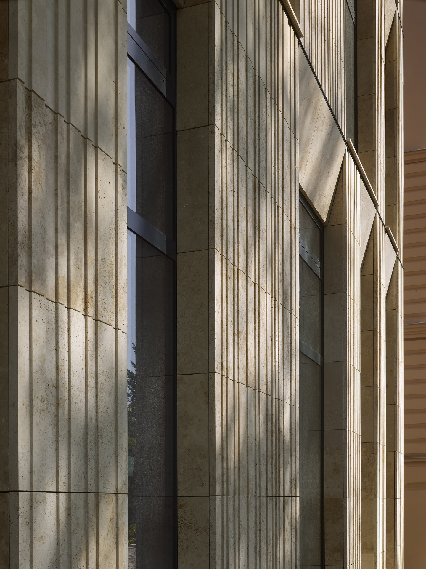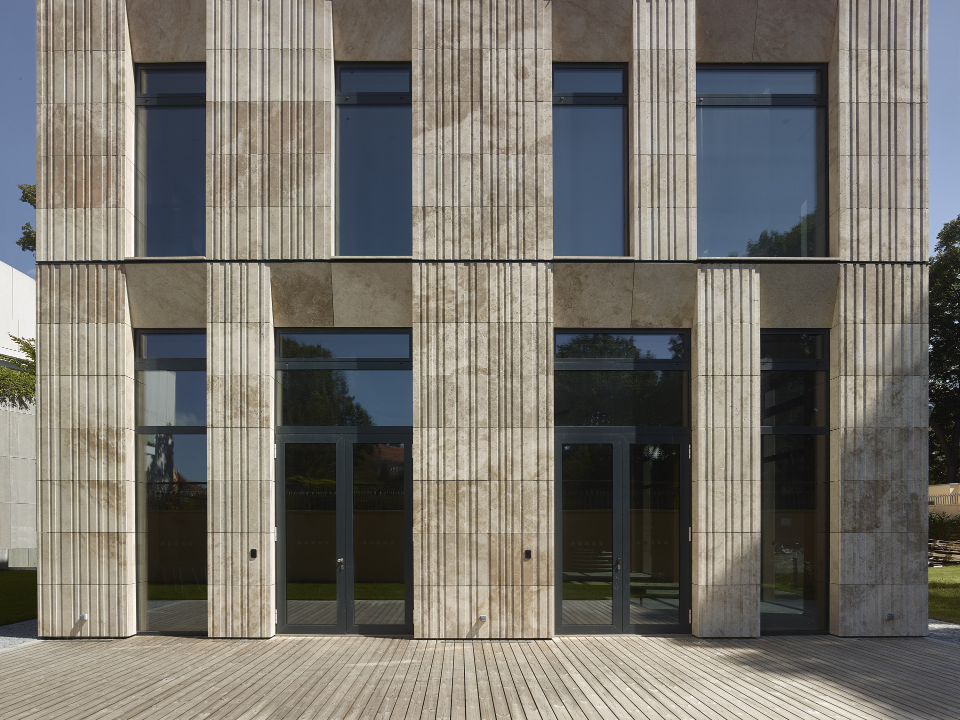 Západní přístavba představuje méně formální část objektu, přesto skrytě čerpá inspiraci z architektury téměř 120 staré vily. Jednoduchý kvádrový objem s plochou střechou působí díky pravidelně rozmístěným oknům oproti historickému objektu jemněji. Travertinový obklad fasády doplňuje vertikální kanelování. Konstrukční výška a výška atiky odpovídá původnímu domu.