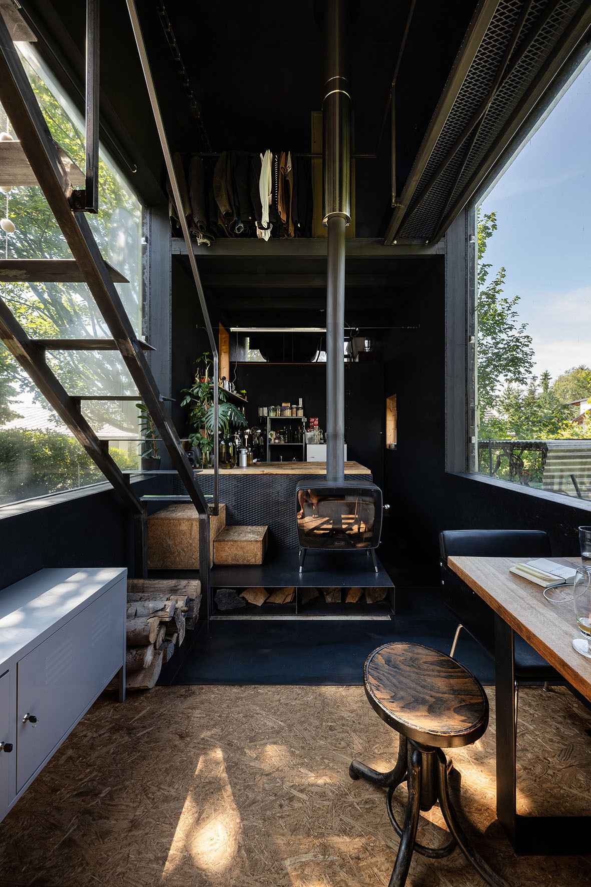 Jak už bylo řečeno, kvádr fungující jako ateliér je uvnitř bílý. Druhému objektu, sloužícímu jako obydlí, naopak dominuje černá barva. Oba rezidenti se shodují, že na bydlení v černém interiéru si museli zvykat. Než se dostavěla obytná část, žili i pracovali v bílém domě. Před nastěhováním do sousední kostky uvažovali o provedení vnitřku z březové překližky, nakonec se ale rozhodli natřít OSB panely načerno. Kontrast barev tak umožňuje striktně oddělit práci od osobního života. „Černý interiér je velmi relaxační. Vyniknou v něm okna a pohledy ven, člověk si připadá jako v kině. Padne na vás klid a nechce se vám nic dělat. Oddělit prostor práce a odpočinku bylo ozdravné,“ popisují svou zkušenost majitelé a dodávají: „Často se nás lidé v souvislosti se zdejším deštivým podnebím ptají, kdy zastřešíme terasu spojující oba domy. Ale když kolikrát 12 hodin denně pracujete na počítači, rádi si pak na chvíli vychutnáte přírodu, klidně i ten déšť. V zimě si často prohazujeme zasněženou cestu mezi domovem a prací tam i zpět.“