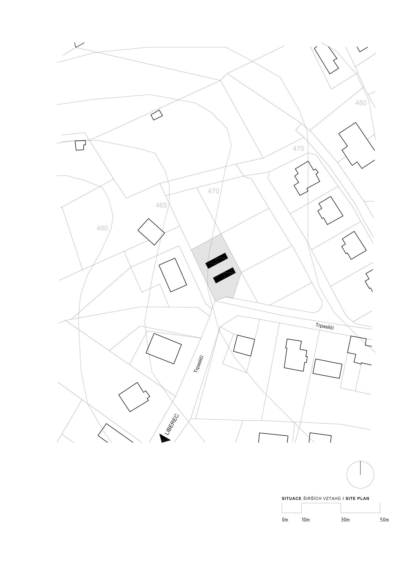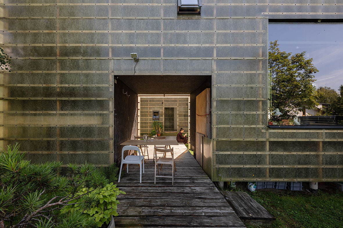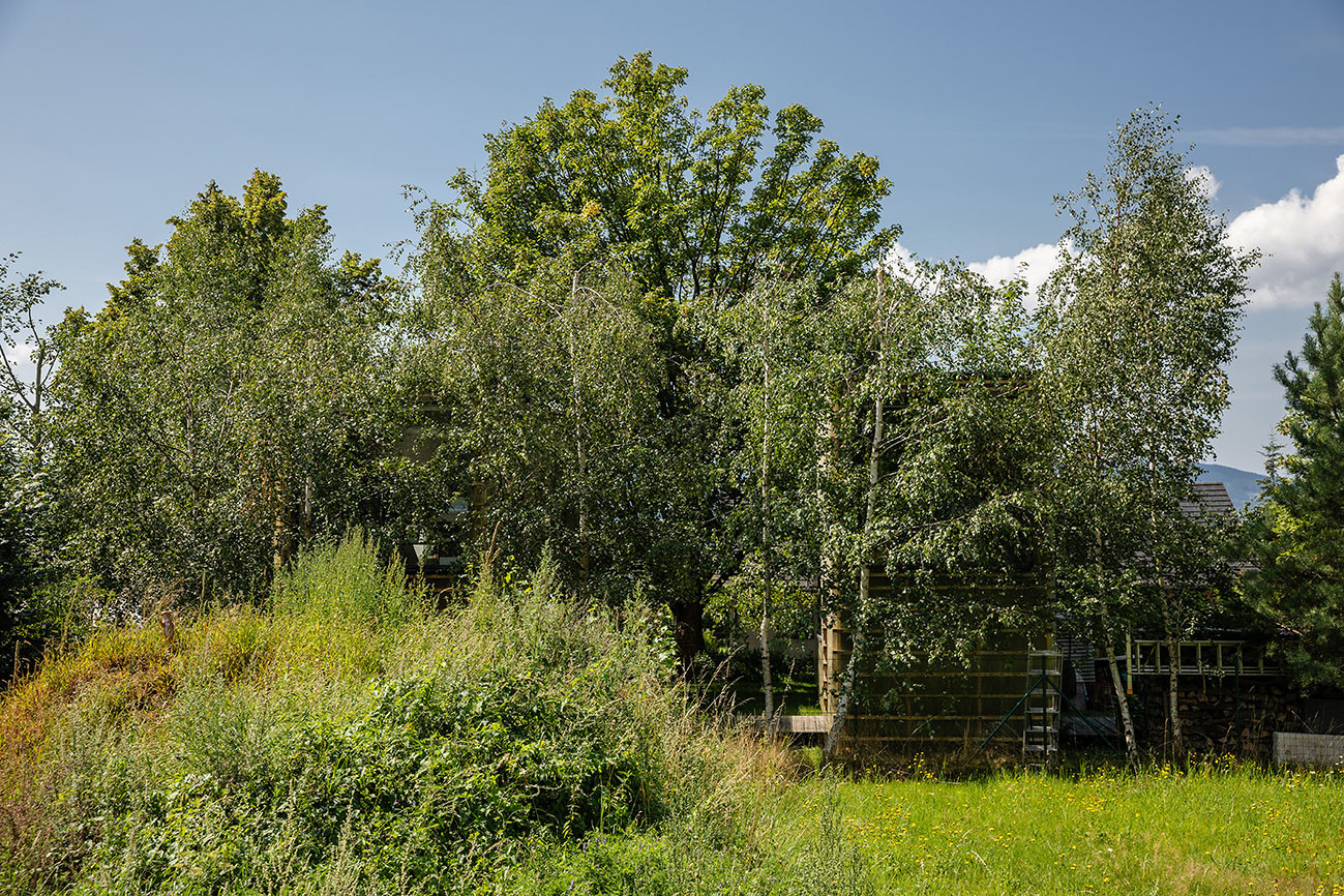 Nacházíme se na prostranství mezi dvěma téměř identickými, rovnoběžně stojícími kvádry, před námi mohutný rozvětvený strom. Na první pohled je mi jasné, že zde hraje zcela zásadní roli. Původně to ale mělo být jinak. „Na poslední chvíli jsme změnili koncept. Mimo jiné i kvůli tomu stromu, ale také kvůli většímu soukromí. Druhý modul měl k prvnímu objektu půdorysně přiléhat do tvaru ‚L‘ a naležato. Projektová dokumentace dokonce takto šla na stavební úřad,“ oznamuje Petr Stolín a z šuplíku vytahuje jednoduché makety domů, na kterých lze variabilitu systému ukázat. Zkolaudovat stavbu se architektům podařilo teprve nedávno. Po téměř deseti letech dotáhli změnu stavby před dokončením a montovaná skládačka tak konečně získá své číslo popisné. „Mezitím se změnil územní plán a maximální zastavěnost pozemku byla omezena na 15 %. Do tohoto limitu jsme se s výslednými dvěma moduly nastojato vešli naštěstí úplně přesně,“ říká architekt k malé parcele, jejíž koupě před více než patnácti lety vyšla mnohem levněji než v současnosti. Hranice CHKO Jizerské hory leží až o půl kilometru dál, pohybujeme se na těsné hranici mezi městem a úpatím rozsáhlého lesa s kamenným lomem. Na sousední parcele historicky stála velká německá vila, ale byla nahrazena novějším domem ještě před započetím realizace ZEN Houses.