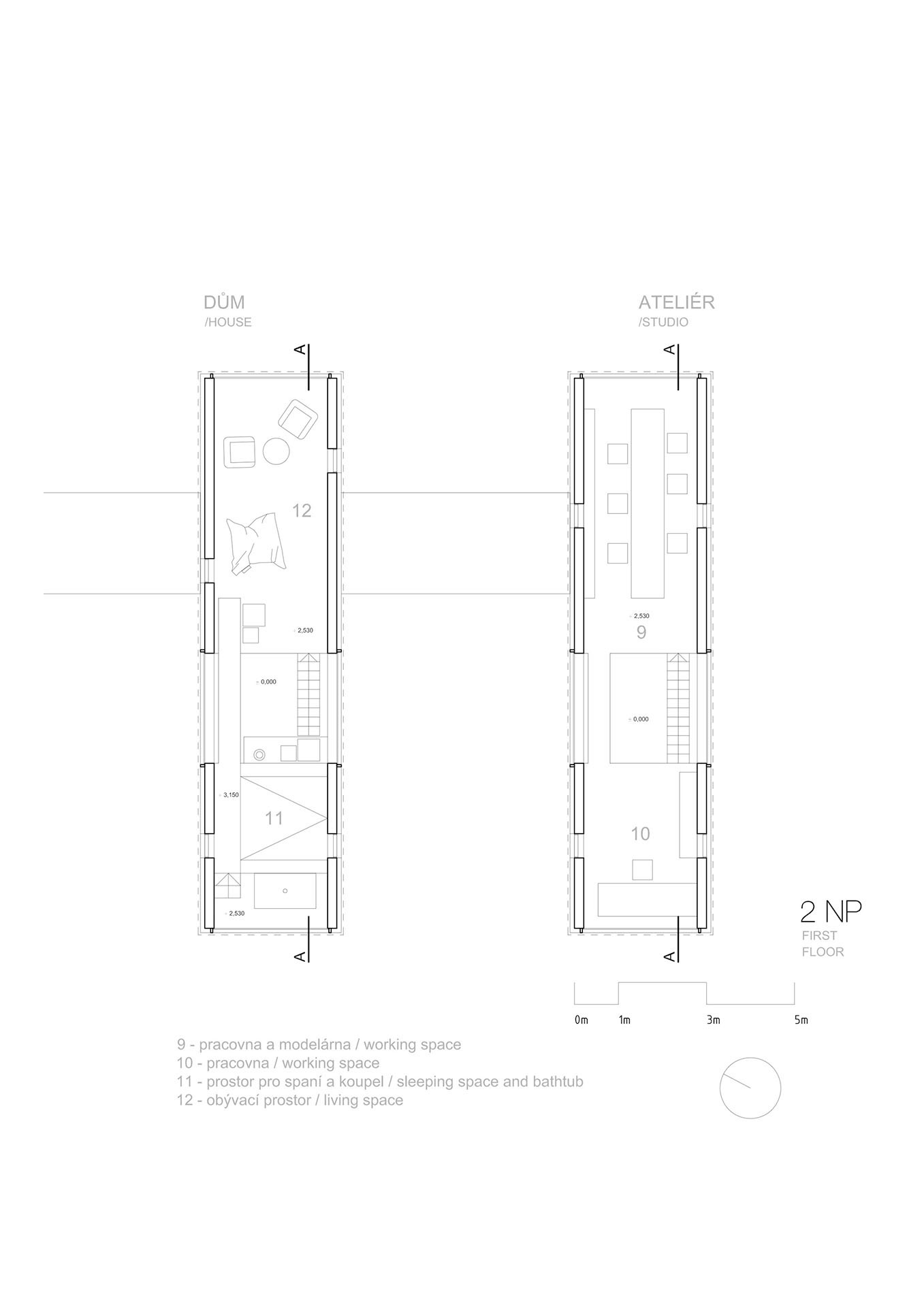 - Užitná plocha: 58 m² (ateliér) + 52 m² (bydlení)