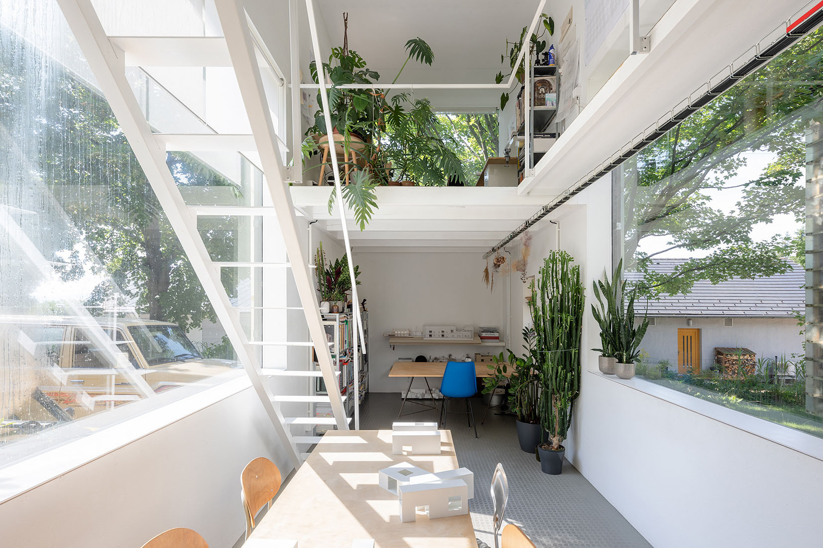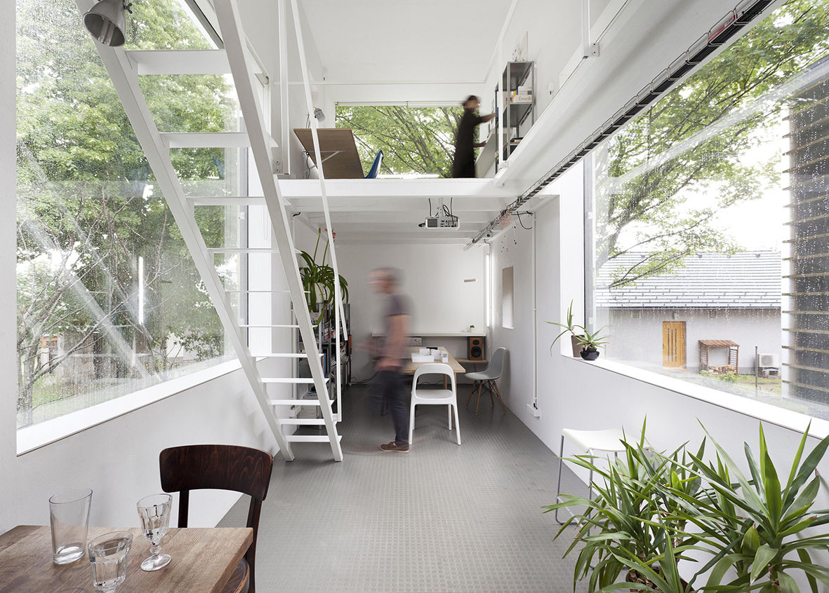 Prohlídku začínáme v bílém ateliéru a rozhodně nemáme pocit, že by byl prostor zanesený zbytečnými věcmi. Oproti starším fotkám se jen nápadně zaplnil pokojovými rostlinami, což iniciovali hlavně studenti. „Chodí nám se pomáhat na praxi. Snažíme se je hlavně naučit uvažovat v prostoru při tvorbě fyzických modelů a zapojujeme je do celého procesu návrhu, ale jen u nekomerčních projektů,“ vysvětluje Petr Stolín, který je vedoucím Katedry architektury na FUA TU v Liberci.