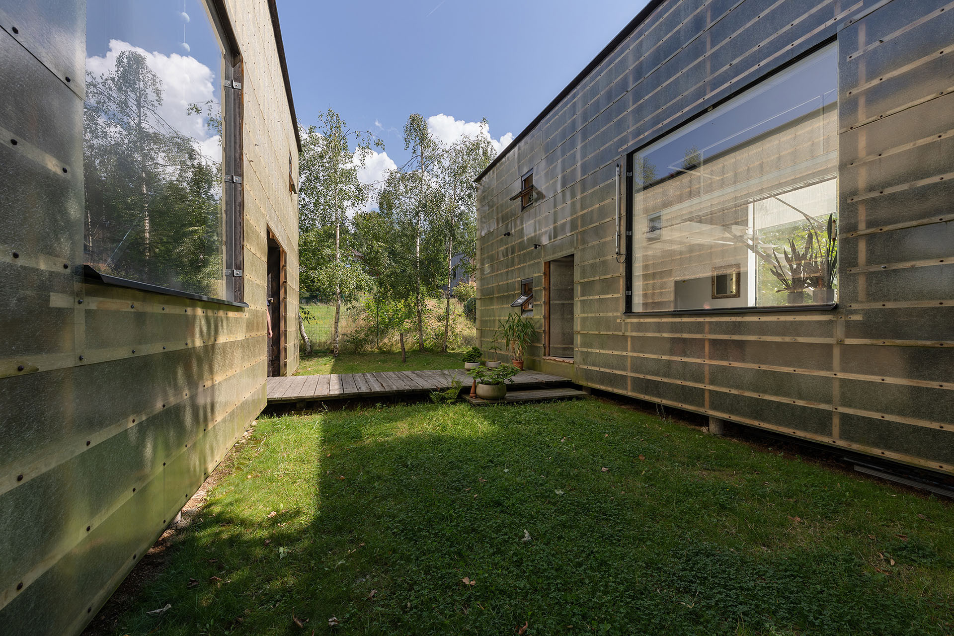 Absence okapů způsobuje, že voda stéká volně po obvodu a částečně po laminátovém plášti, což ale vůbec ničemu nevadí. Sklolaminát přichycený na dřevěném roštu už není tak průhledný jako na počátku a při letmém pohledu lze snadno poznat, na kterých místech je fasáda nejexponovanější. „Stavba stárne, ale my se tomu nebráníme. Neradi používáme materiál, který je pořád stejný,“ říkají architekti k originálnímu fasádnímu systému, který později uplatnili i u dalšího projektu ověnčeného Českou cenou za architekturu (ČCA) – mateřské školy ve Vratislavicích nad Nisou (viz ERA21 #06/2018).