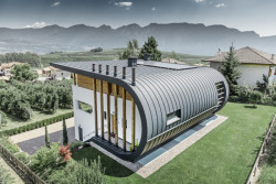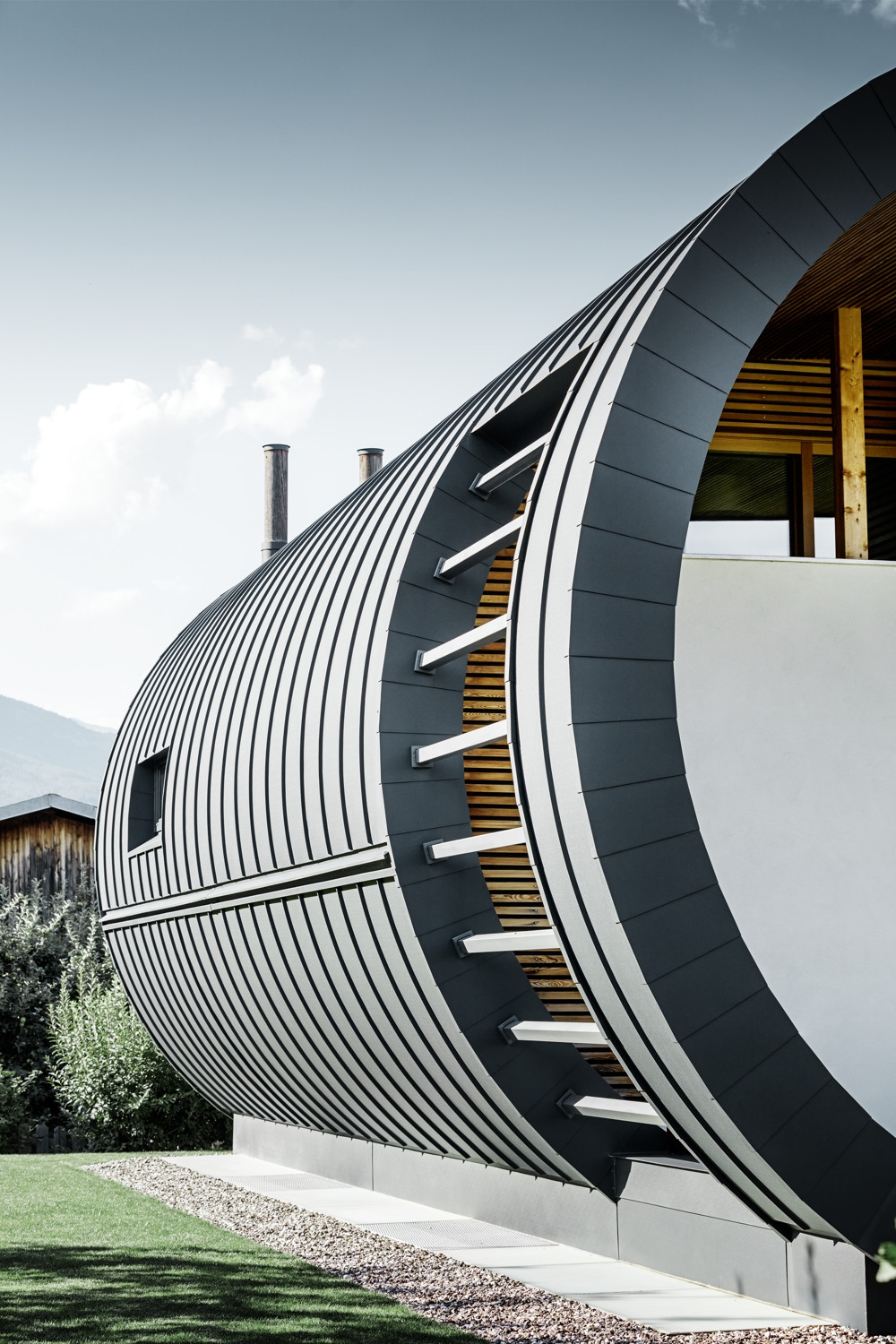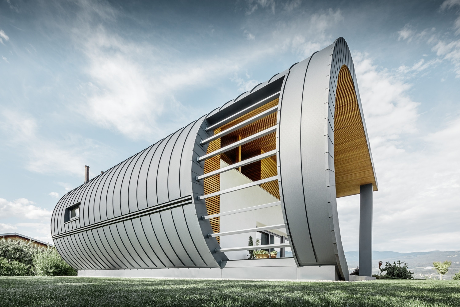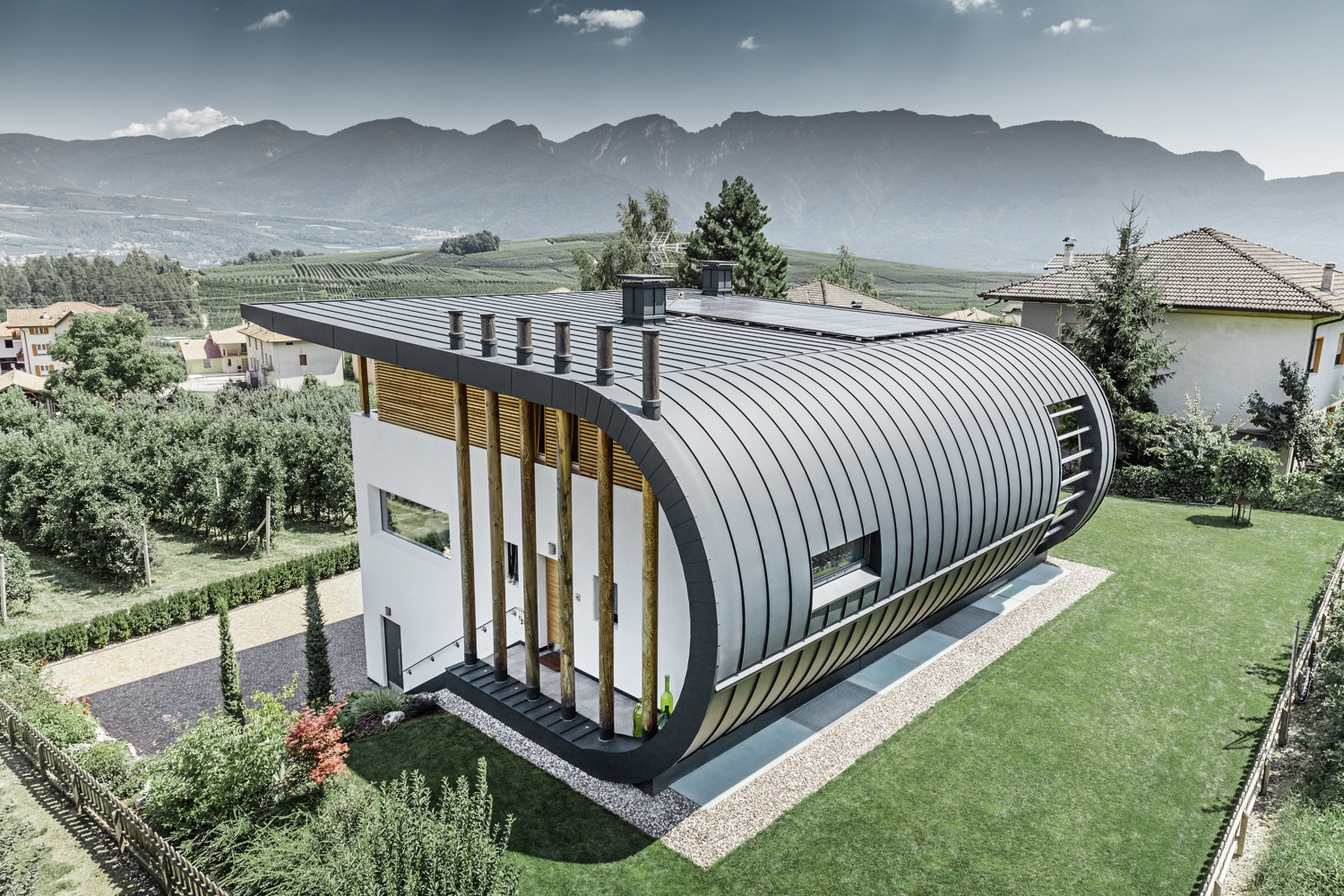 Dostat jedinečný nápad je bezesporu obdivuhodné a fascinující. Avšak mnohdy je ještě těžší o takovém nápadu a jeho kvalitách přesvědčit i široké okolí. Že to není nemožné, ukazuje realizace rodinného domu v obci Flavon, v severoitalském Trentinu. Tradiční lokální výstavbu oživuje neobyčejný projekt oválné budovy, kterou chrání hliníková střecha a přecházející ve fasádu připomínající široké písmeno C. Neobyčejnost je ještě podtržena šesti dřevěnými sloupy, které střechu protínají a opticky zdánlivě podpírají.