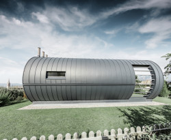 Netradičně řešenou dřevostavbu v severoitalském Flavonu chrání půlkulatá hliníková střecha