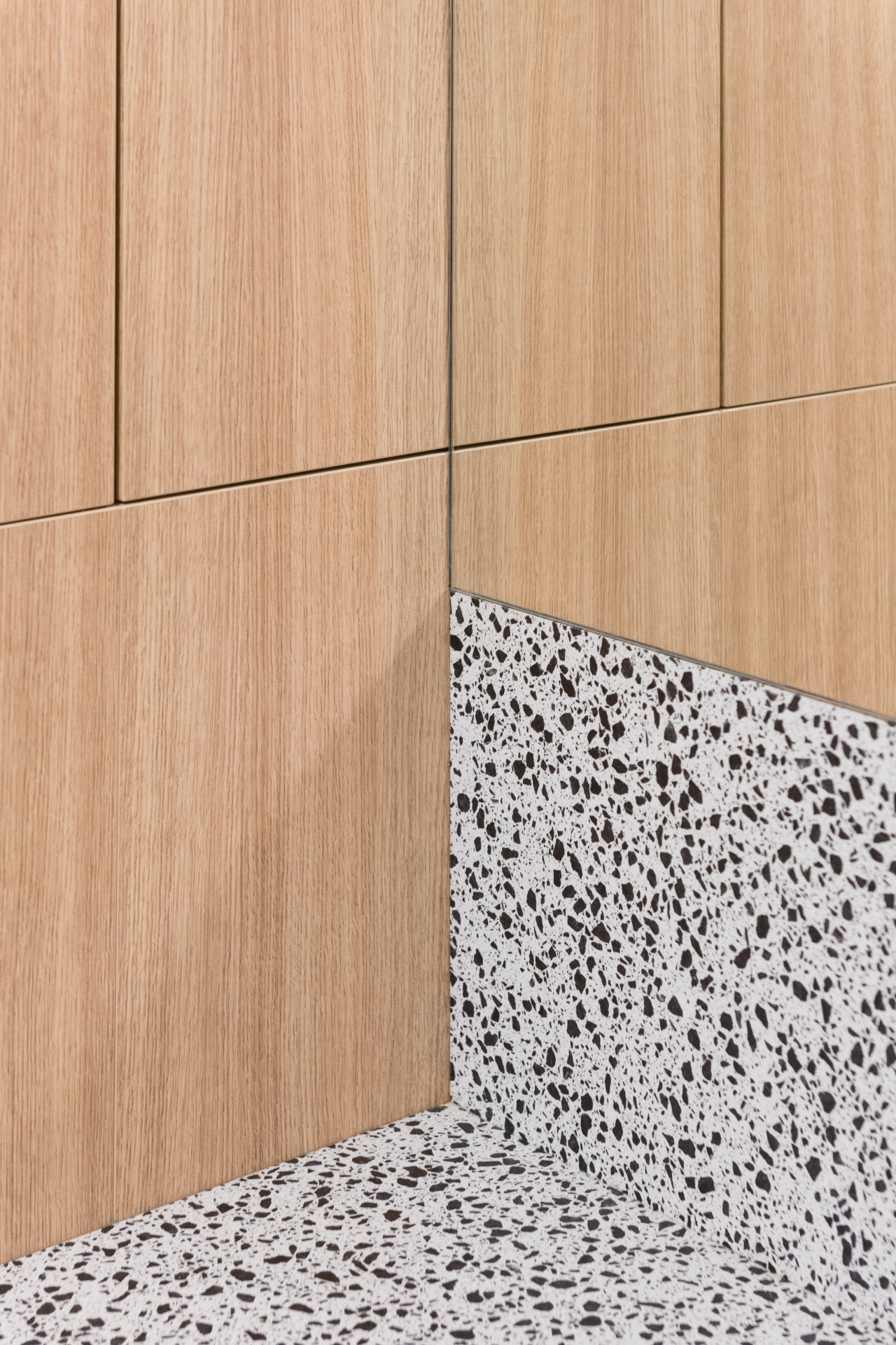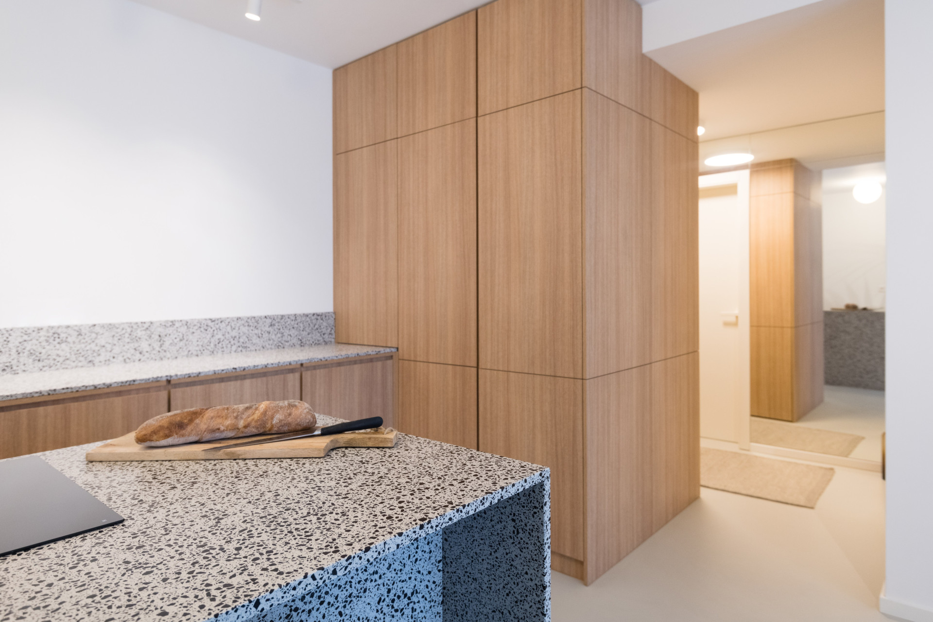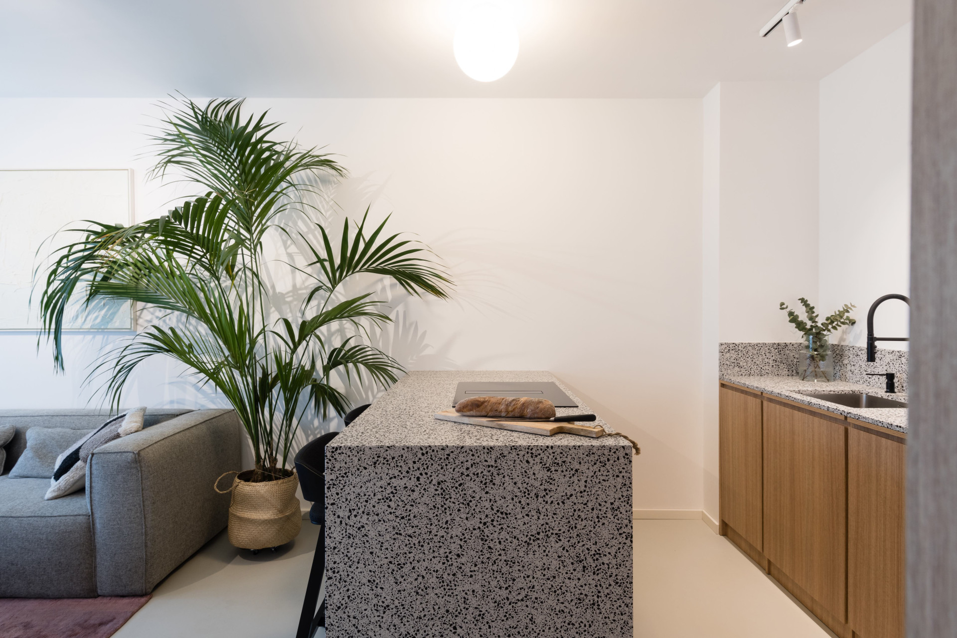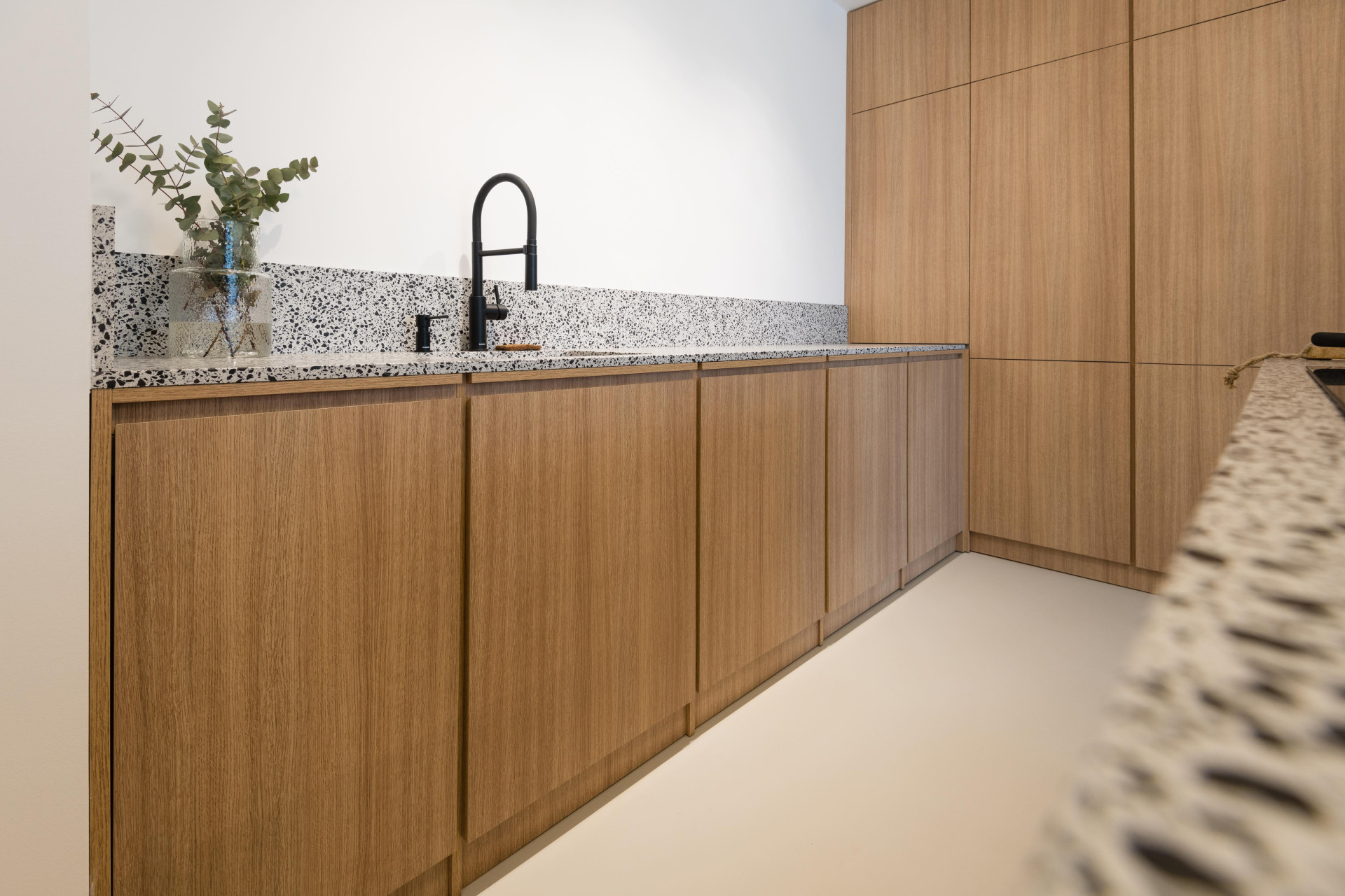 Všechen nábytek na míru měl být v dubové dýze, ale vzhledem k respektování rozpočtu se sáhlo po laminátovém provedení. Naštěstí se podařilo nalézt takový dekor, který je skoro neodlišitelný od přírodního materiálu. Teplé odstíny vybavení dobře vyznívají v kombinaci se světlou litou polyuretanovou podlahou. Dalším dominantním materiálem se stalo terazzo, respektive desky z tvrzeného kamene TechniStone v dekoru Taurus Terazzo White. Materiál byl použit jak na kuchyňskou pracovní desku, tak v koupelně. Právě díky jednotné materiálové paletě spolu všechny pokoje ve výsledku ladí.