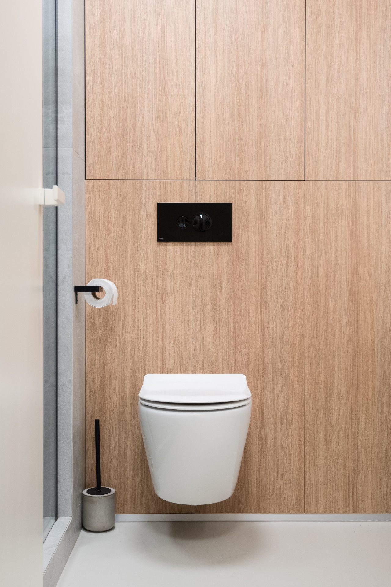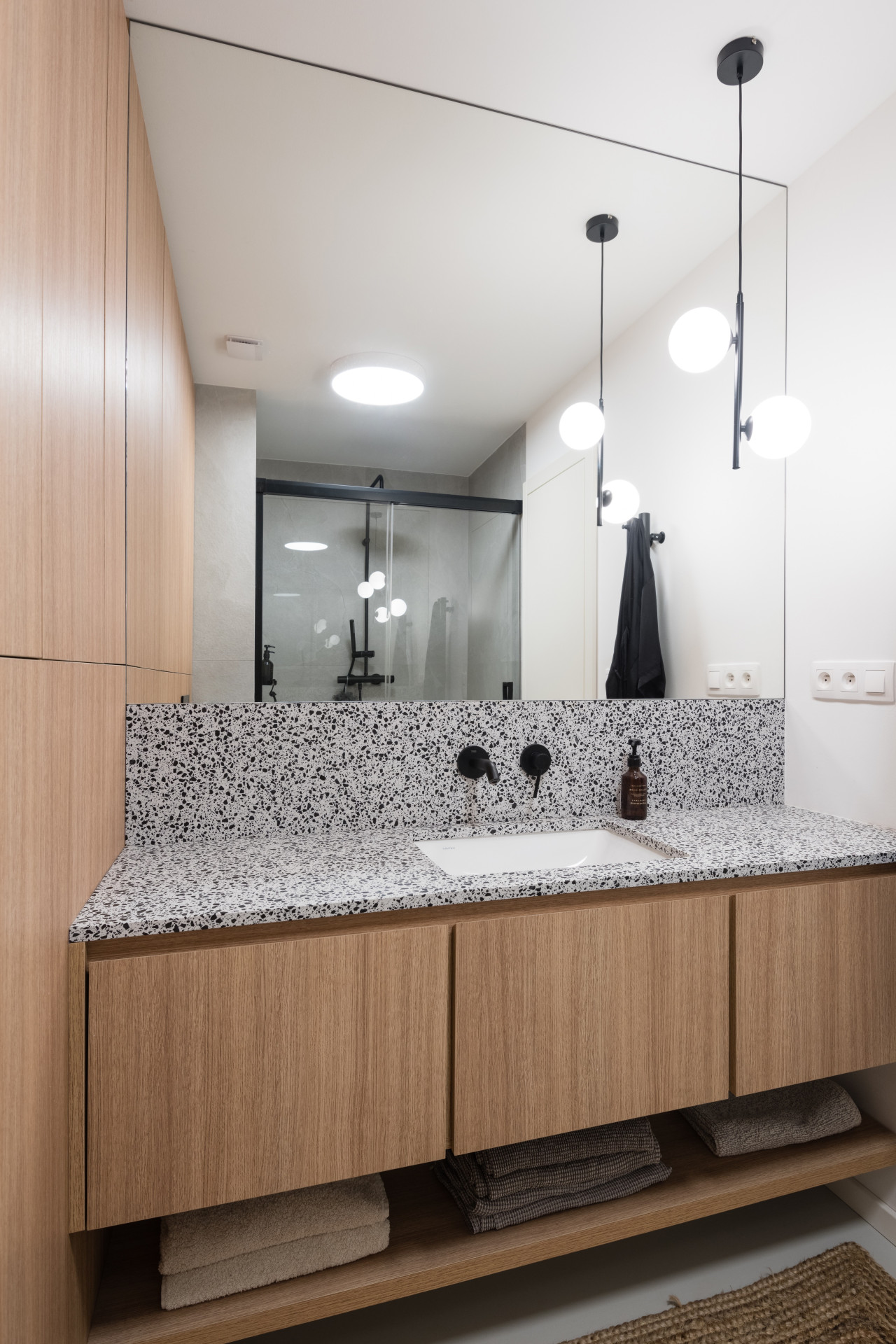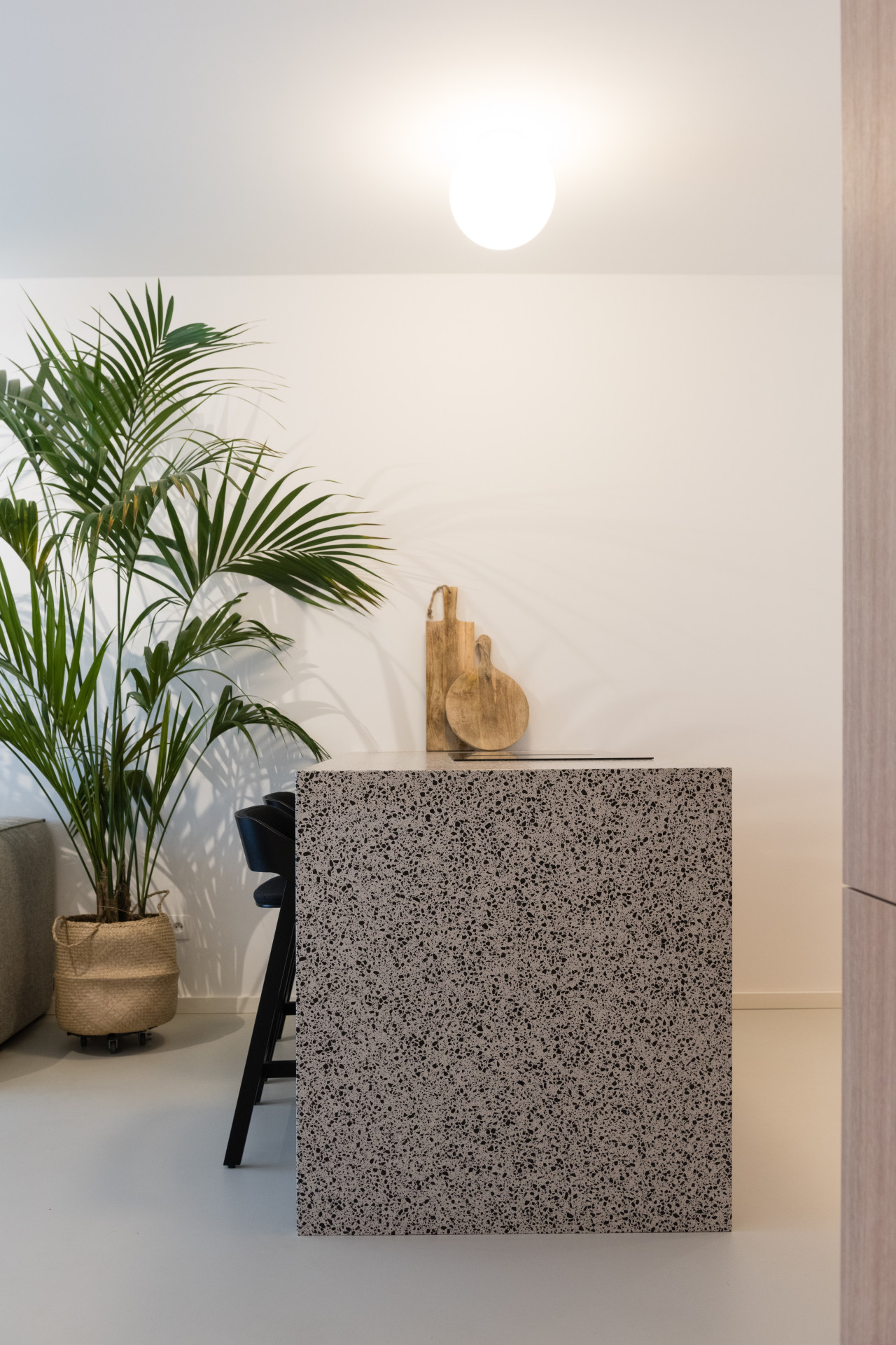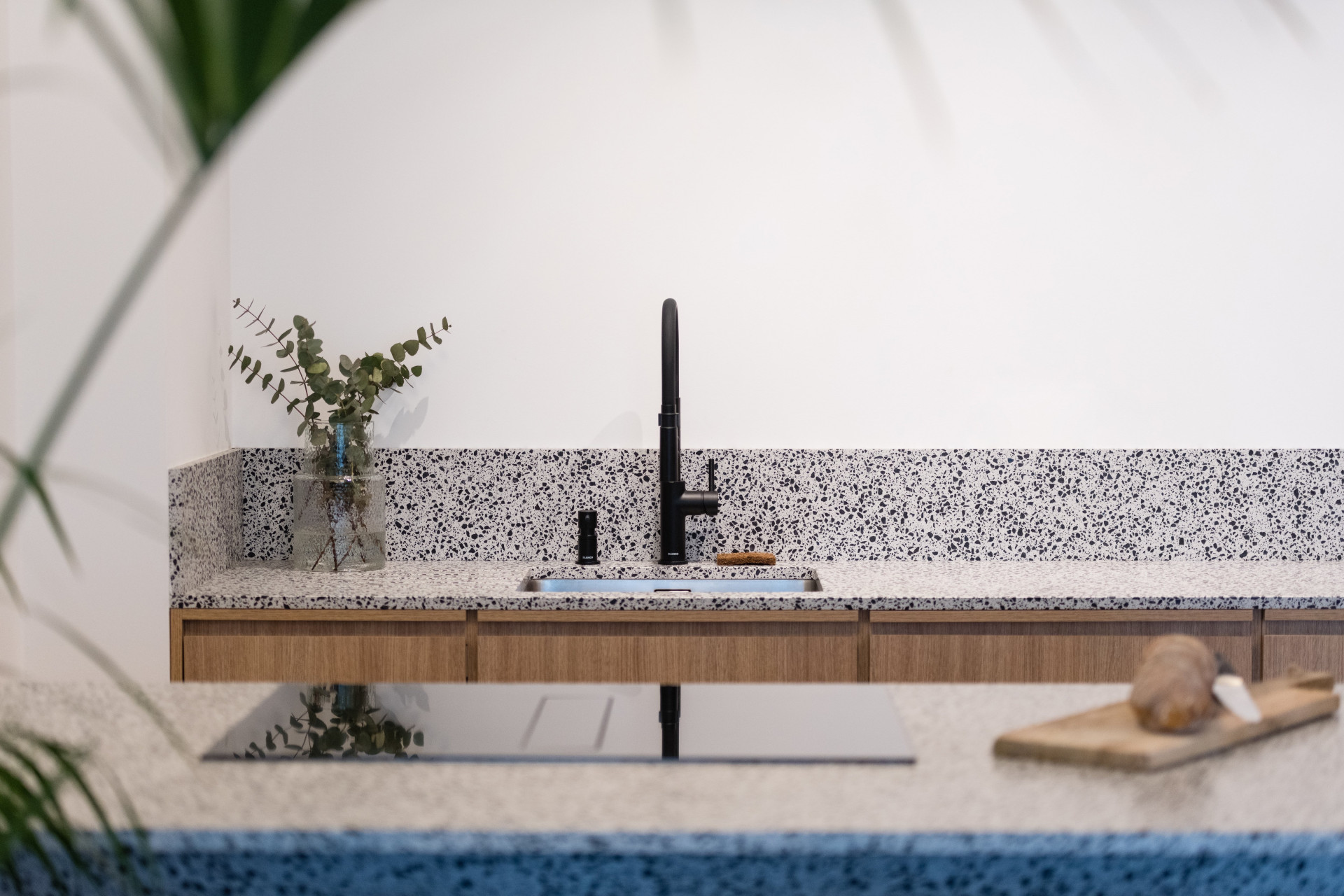 Všechen nábytek na míru měl být v dubové dýze, ale vzhledem k respektování rozpočtu se sáhlo po laminátovém provedení. Naštěstí se podařilo nalézt takový dekor, který je skoro neodlišitelný od přírodního materiálu. Teplé odstíny vybavení dobře vyznívají v kombinaci se světlou litou polyuretanovou podlahou. Dalším dominantním materiálem se stalo terazzo, respektive desky z tvrzeného kamene TechniStone v dekoru Taurus Terazzo White. Materiál byl použit jak na kuchyňskou pracovní desku, tak v koupelně. Právě díky jednotné materiálové paletě spolu všechny pokoje ve výsledku ladí.