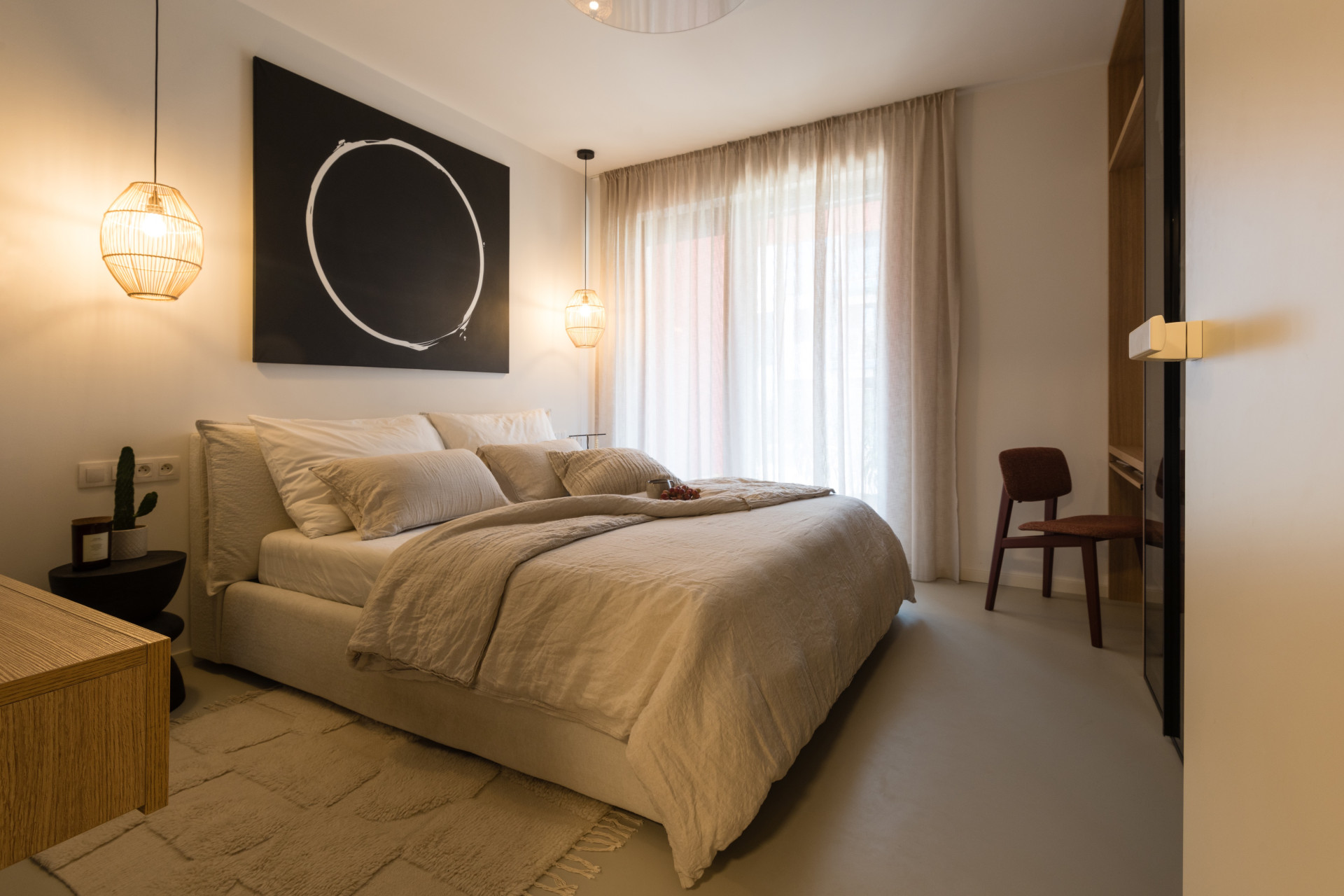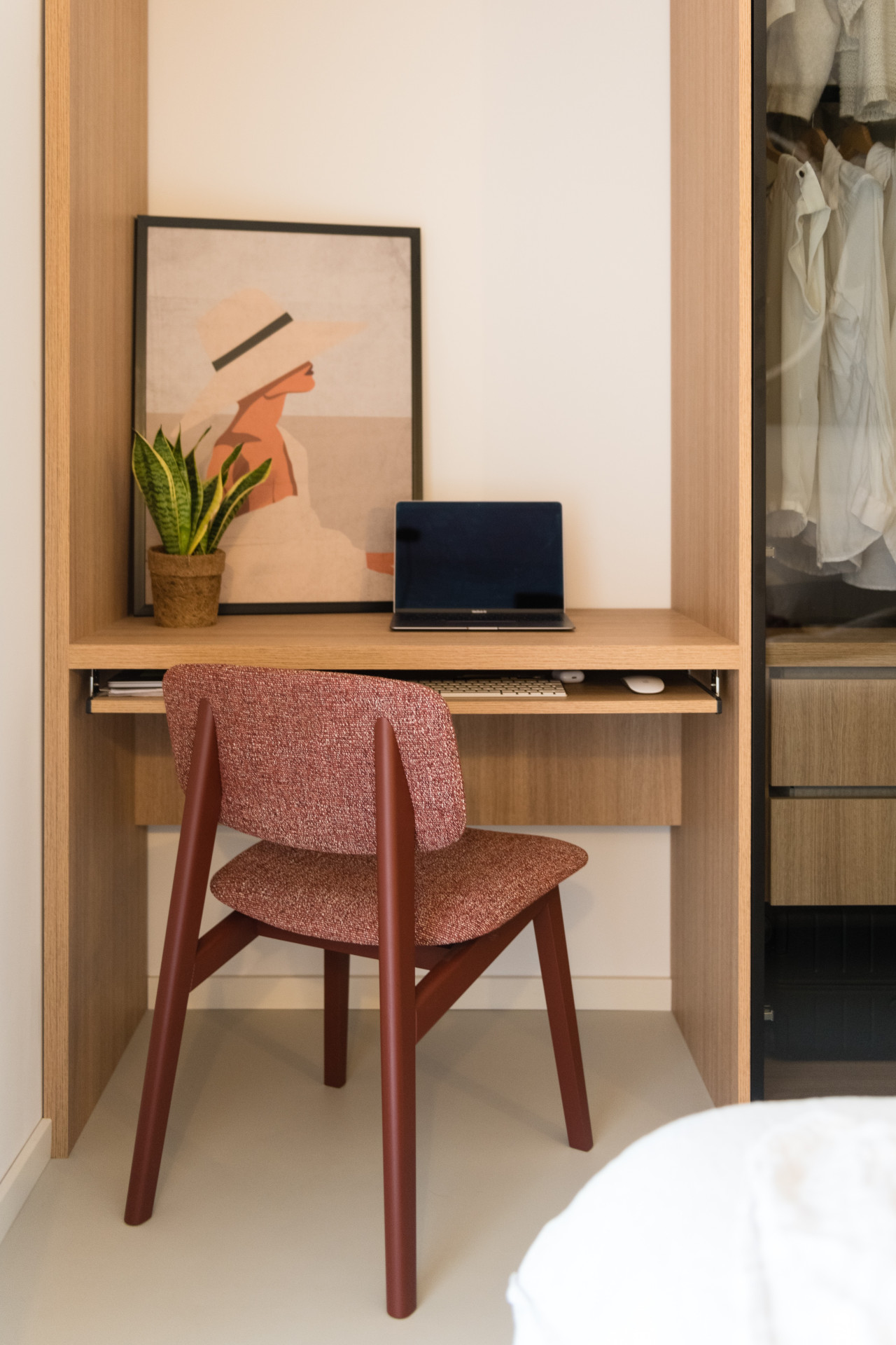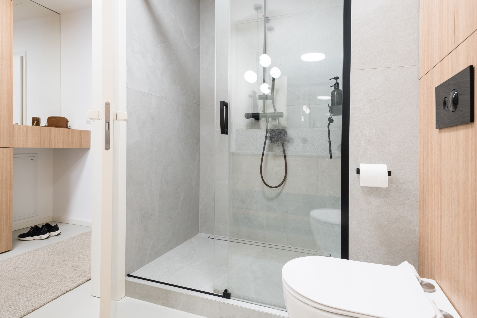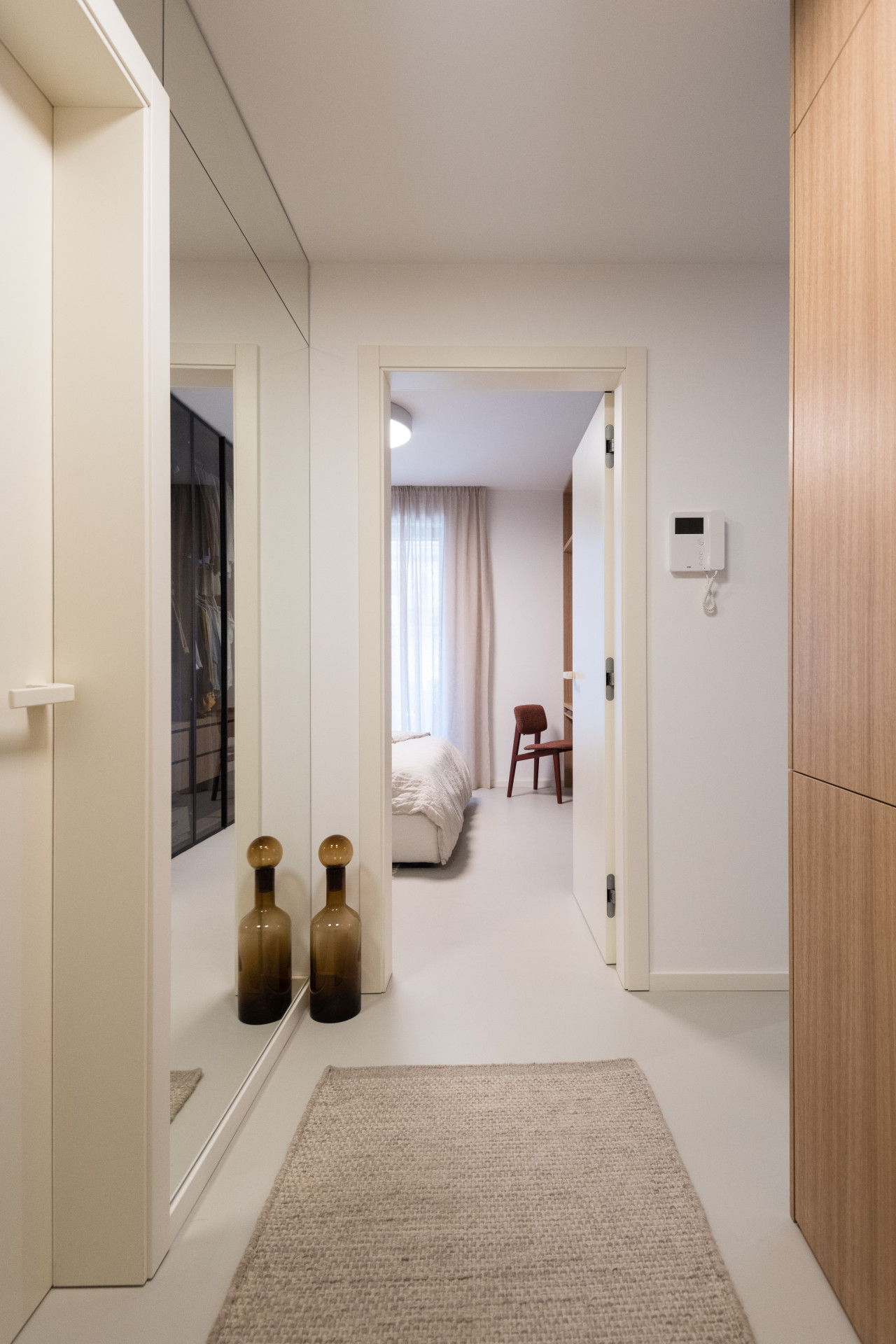Všechen nábytek na míru měl být v dubové dýze, ale vzhledem k respektování rozpočtu se sáhlo po laminátovém provedení. Naštěstí se podařilo nalézt takový dekor, který je skoro neodlišitelný od přírodního materiálu. Teplé odstíny vybavení dobře vyznívají v kombinaci se světlou litou polyuretanovou podlahou. Dalším dominantním materiálem se stalo terazzo, respektive desky z tvrzeného kamene TechniStone v dekoru Taurus Terazzo White. Materiál byl použit jak na kuchyňskou pracovní desku, tak v koupelně. Právě díky jednotné materiálové paletě spolu všechny pokoje ve výsledku ladí.