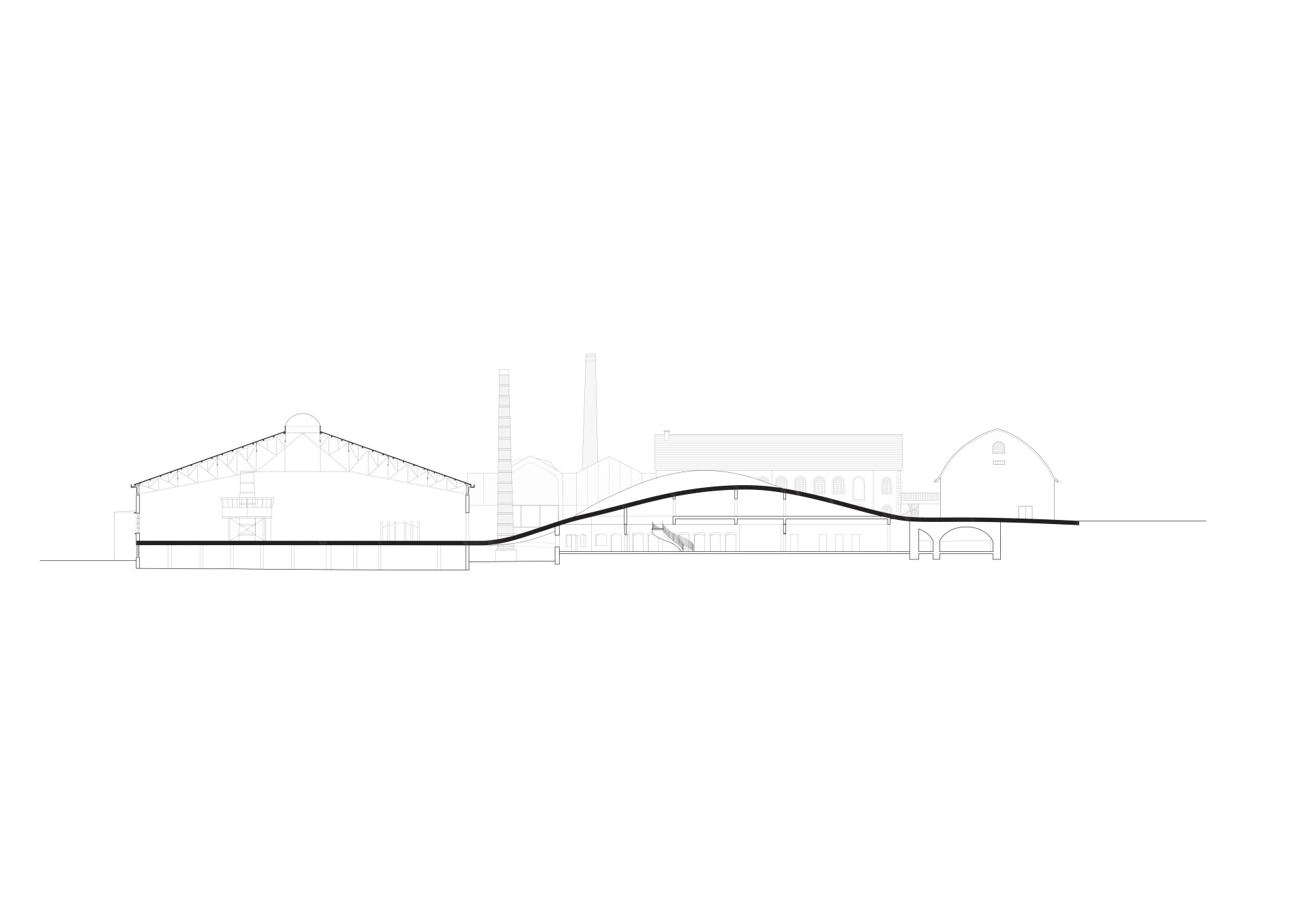 „Vlnící se betonový povrch odlitý na místě odkazuje na výrobu skla, která všechny budovy spojuje. Povrch slouží jako střecha, strop i stěna propojující přízemí staveb tak, aby mohlo vzniknout jasně definované veřejné náměstí. Pod tímto povrchem jsou citlivě umístěny jednotlivé nové funkce, jako jsou kanceláře, dílny, kavárna a restaurace,“ vysvětlují autoři návrhu.