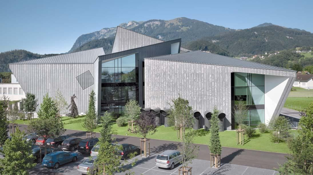 Svojím zaujímavým hranatým exteriérom pripomína budova horský krištáľ, ktorý sa týči pred pôsobivou kulisou Álp. Ťahokovom obložená fasáda a šikmé strechy ešte podčiarkujú tento dojem. Obrovské, štvorcové, šikmo stavané okenné otvory – konštrukcie z ocele a skla, presahujúce cez viacero poschodí – nenechávajú však nikoho na pochybách, že ide o otvorený priestor pre komunikáciu, interakciu a pre konštruktívnu spoluprácu.