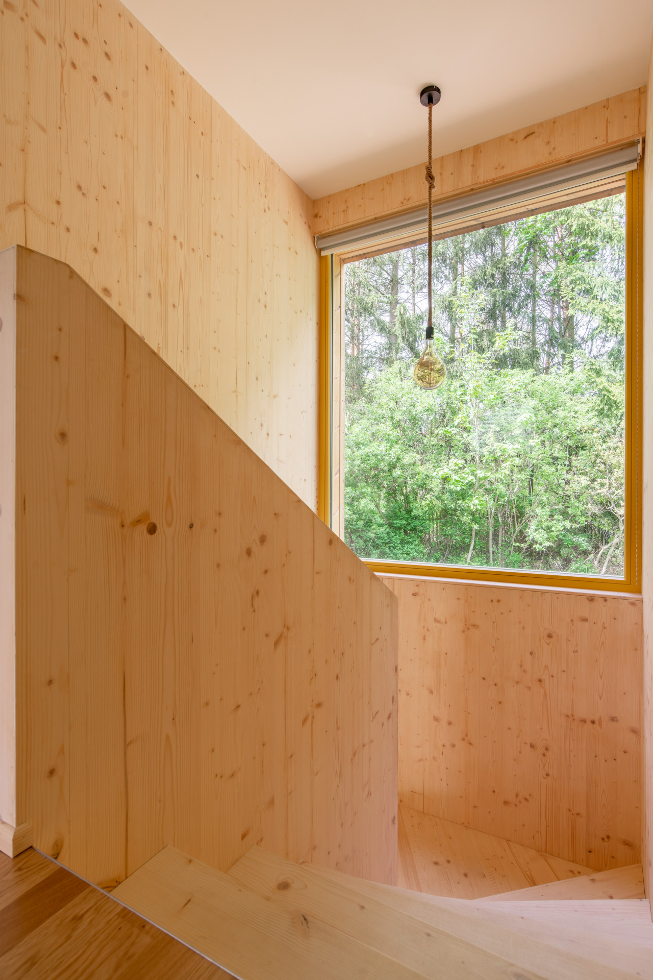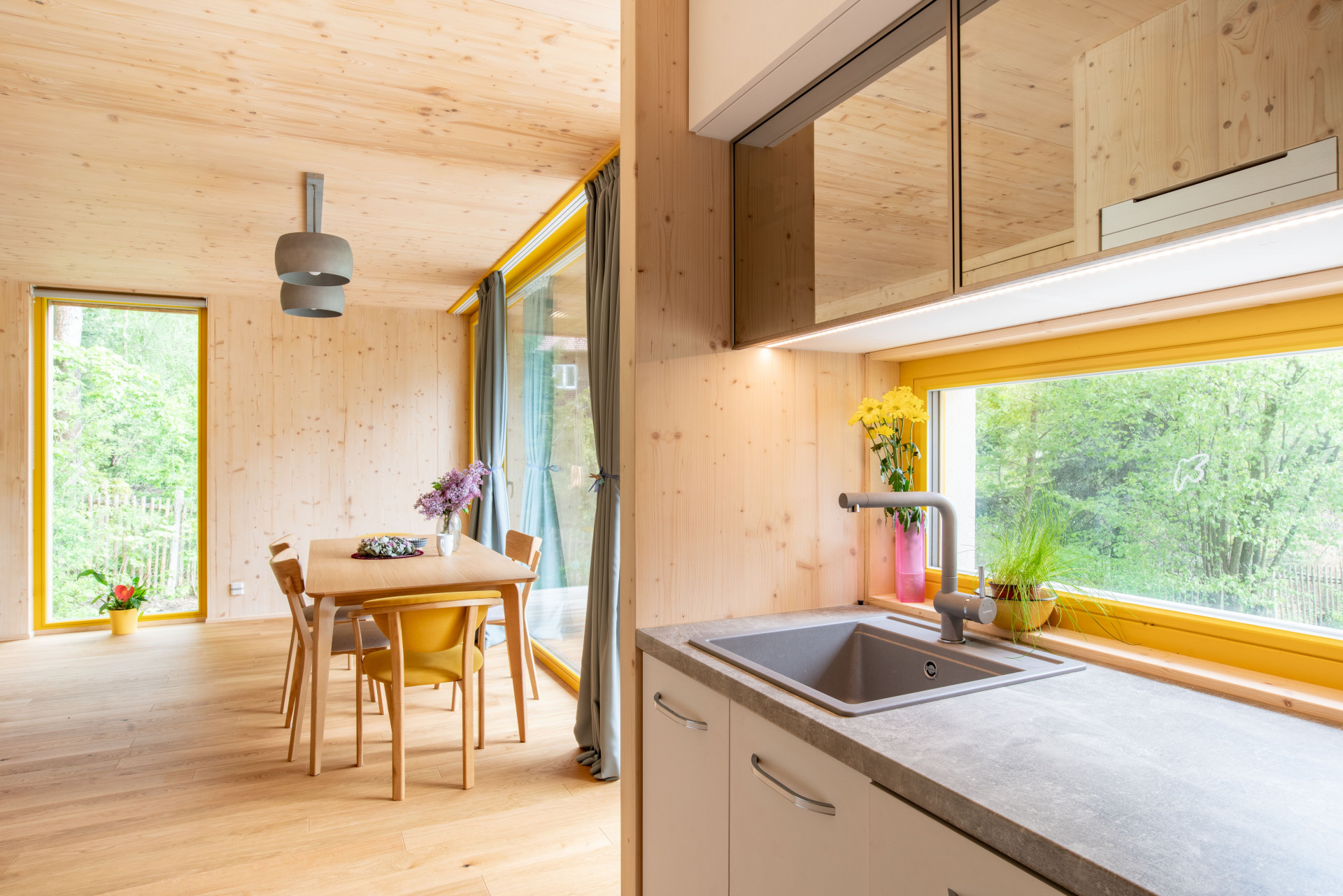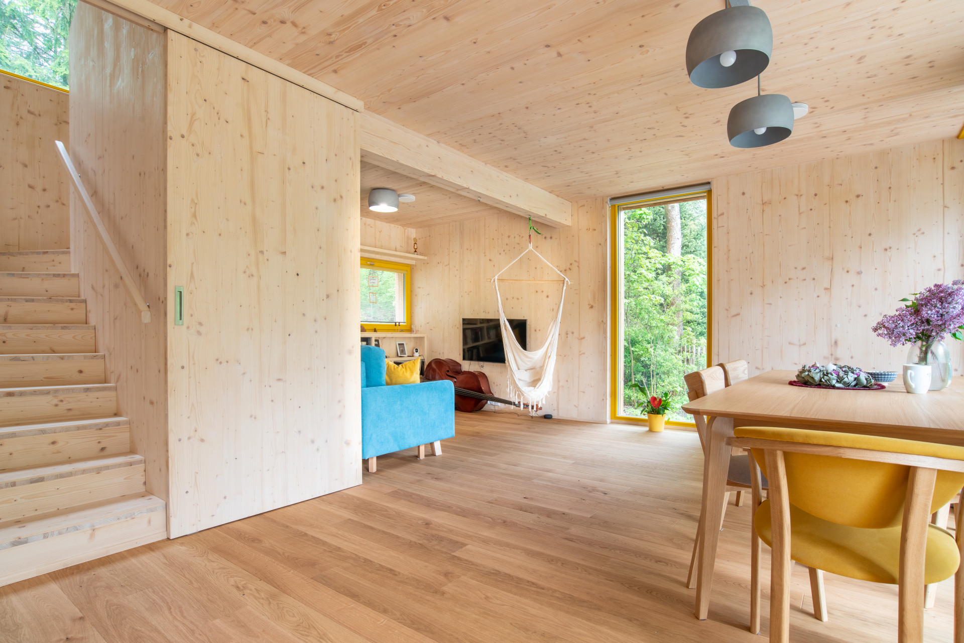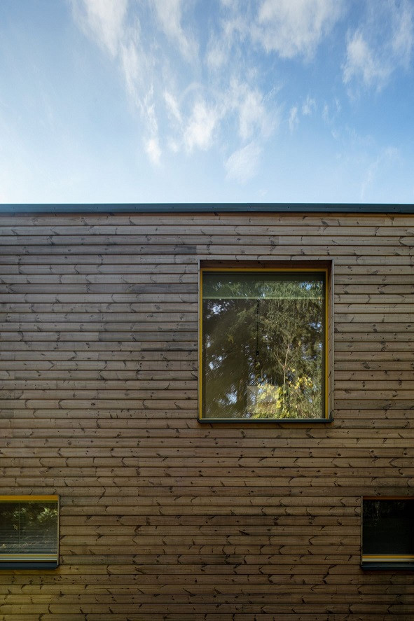 Dřevo hraje hlavní roli také v interiéru. Kromě toho, že zůstala přiznána samotná konstrukce dřevostavby, mají i stěny a stropy dřevěný obklad. Barevný akcent do řešení skromného domu přináší výrazné žluté okenní rámy.