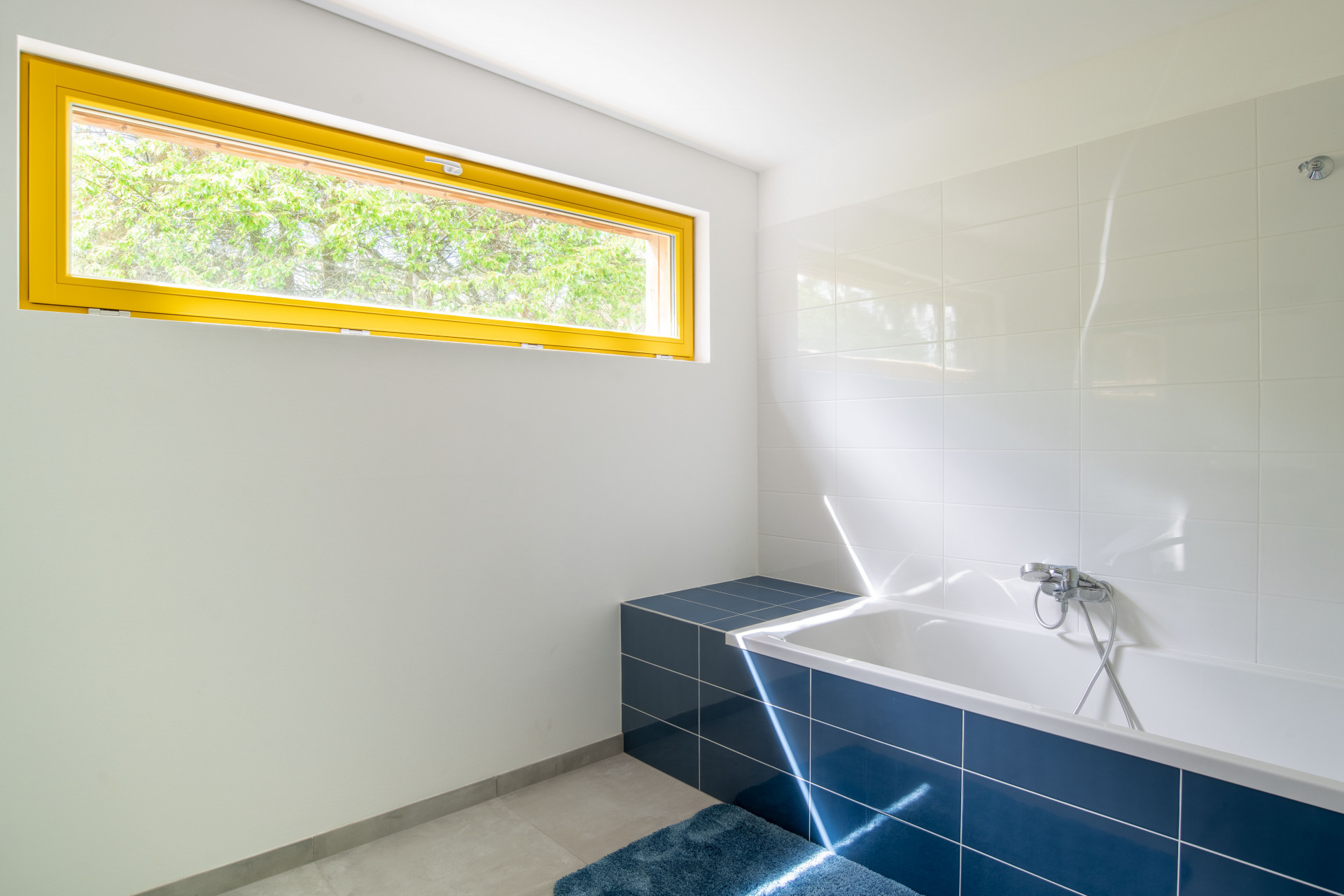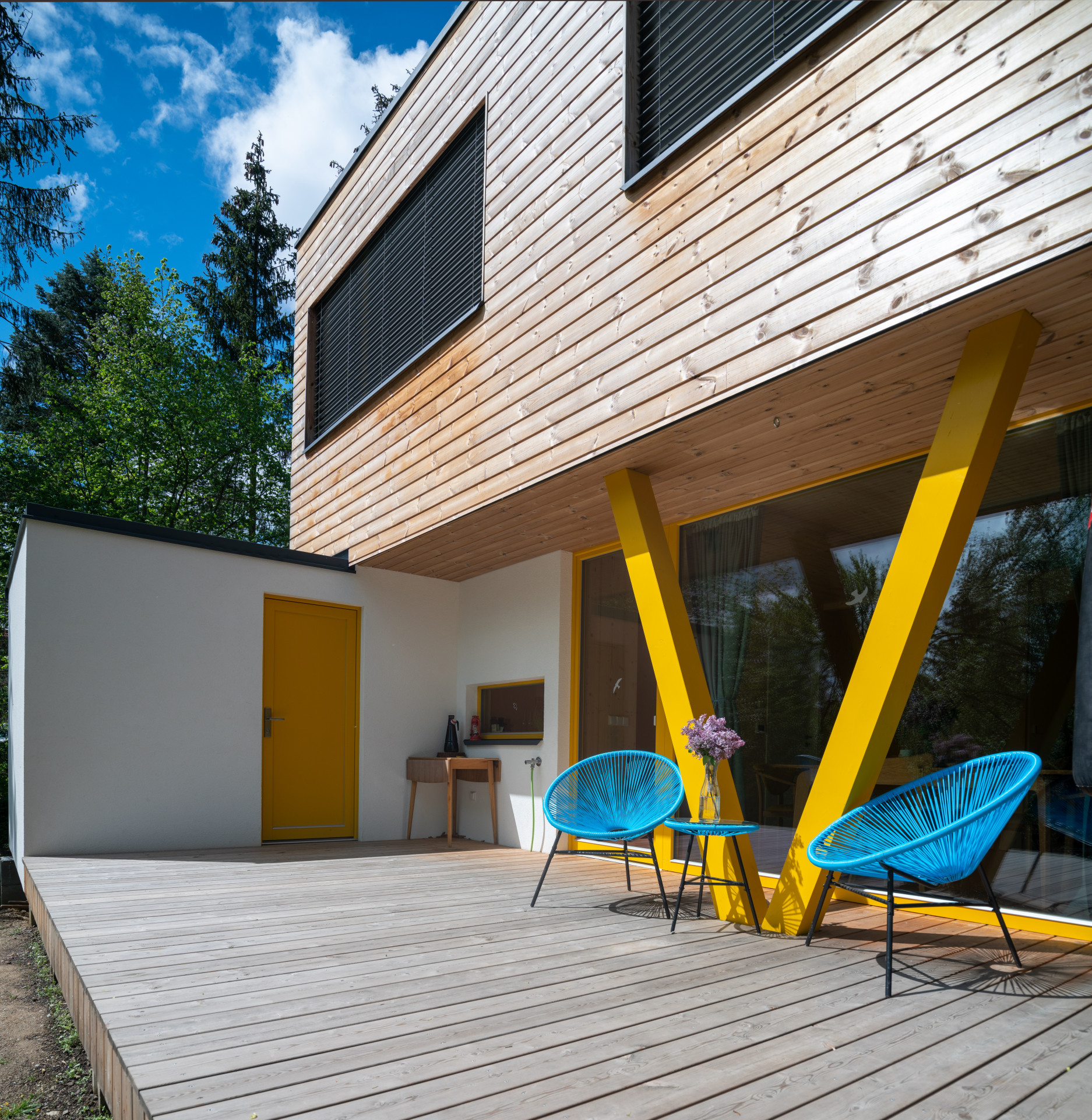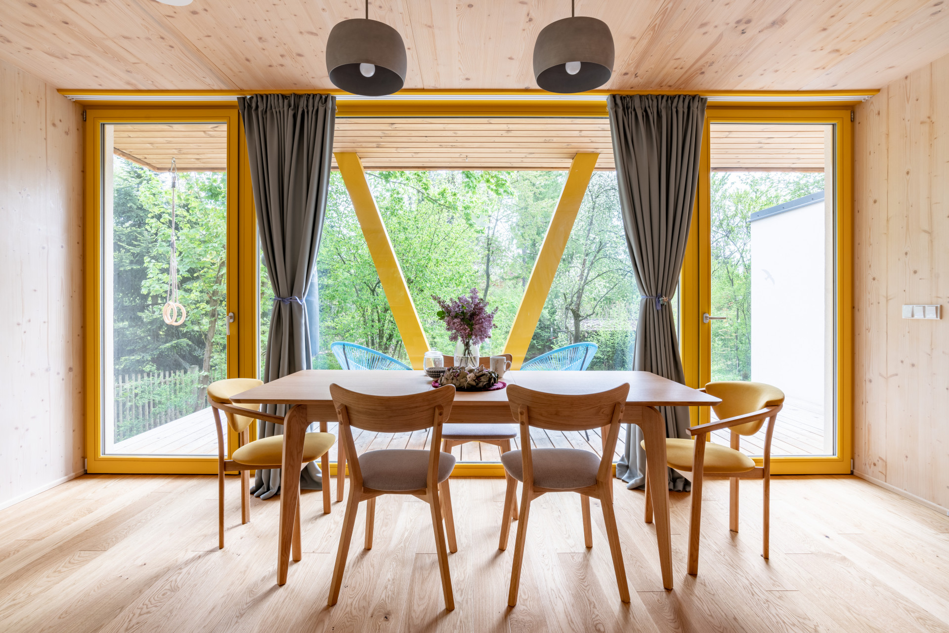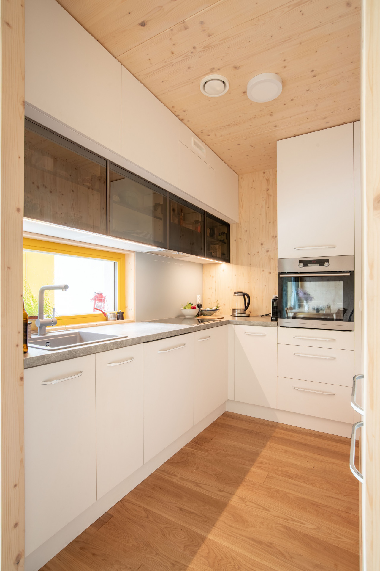 Dřevo hraje hlavní roli také v interiéru. Kromě toho, že zůstala přiznána samotná konstrukce dřevostavby, mají i stěny a stropy dřevěný obklad. Barevný akcent do řešení skromného domu přináší výrazné žluté okenní rámy.