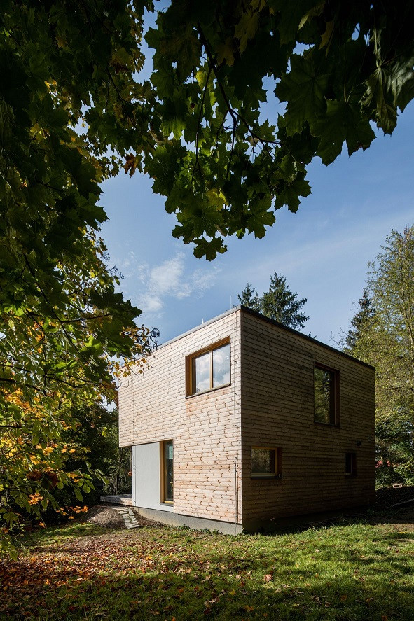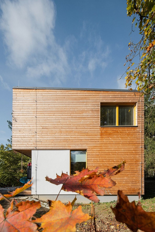 Dvoupatrová novostavba působí při pohledu zezadu jako dřevem obložená kostka. Zahradní průčelí však rozehrávají přes sebe vrstvené kubické jednotky. „Celé první patro je vůči přízemí předsazeno, čímž vzniká praktický přesah, který v létě zastiňuje okna do obývacího pokoje a brání tak přehřívání tohoto prostoru,“ přibližuje řešení domu architekt.