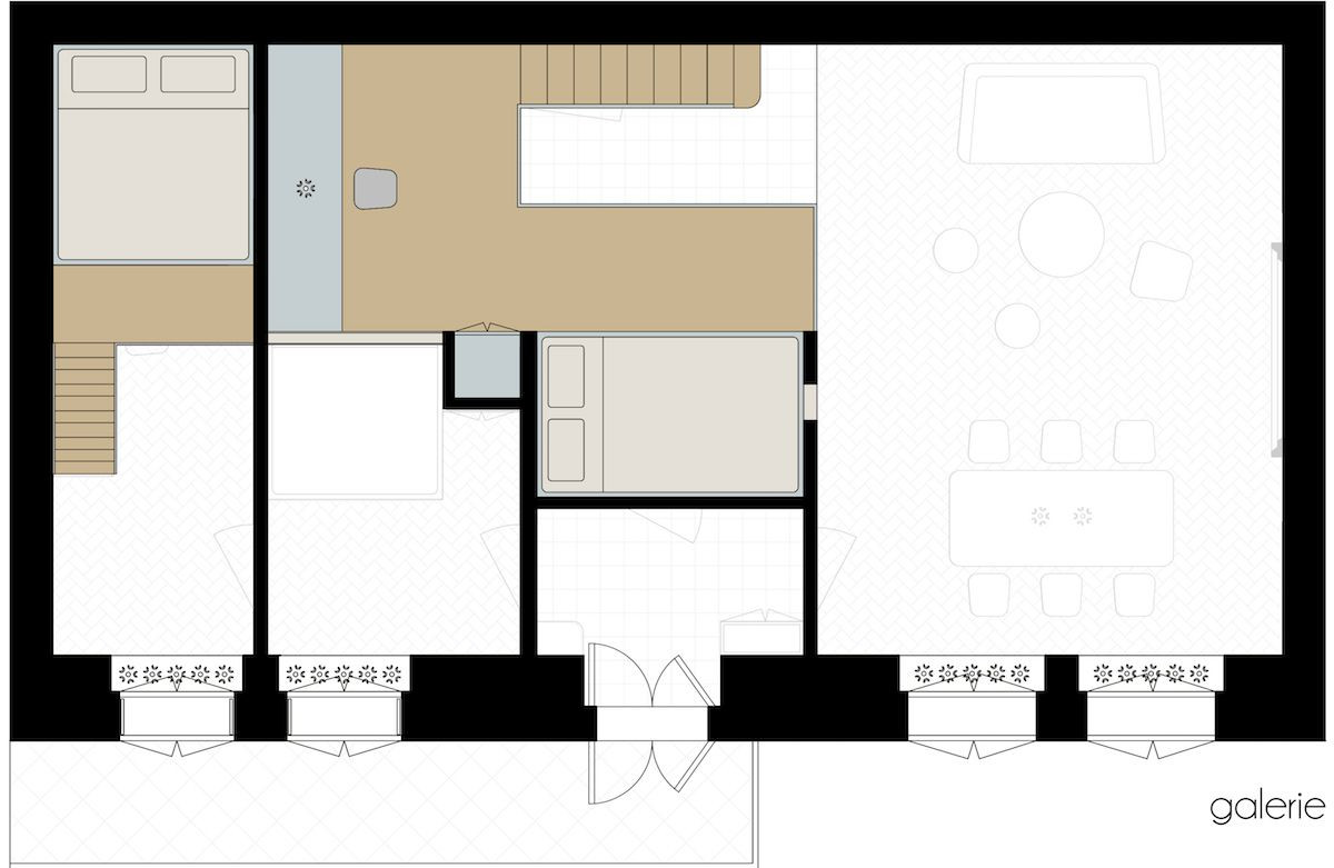 Rekonstrukce činžovního bytu s pavlačí, půdorys galerie, No Architects