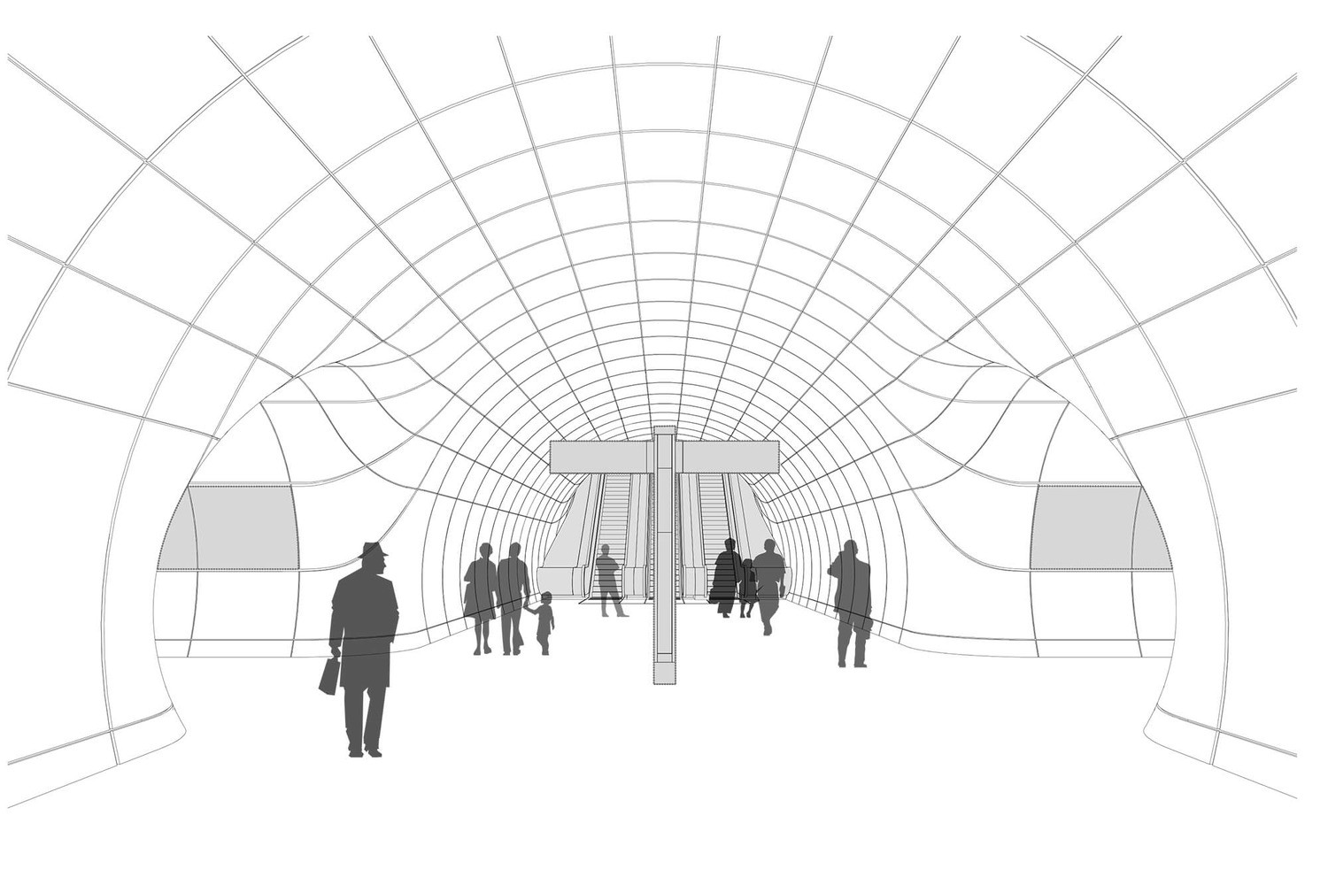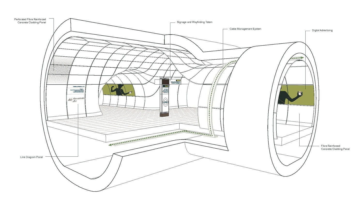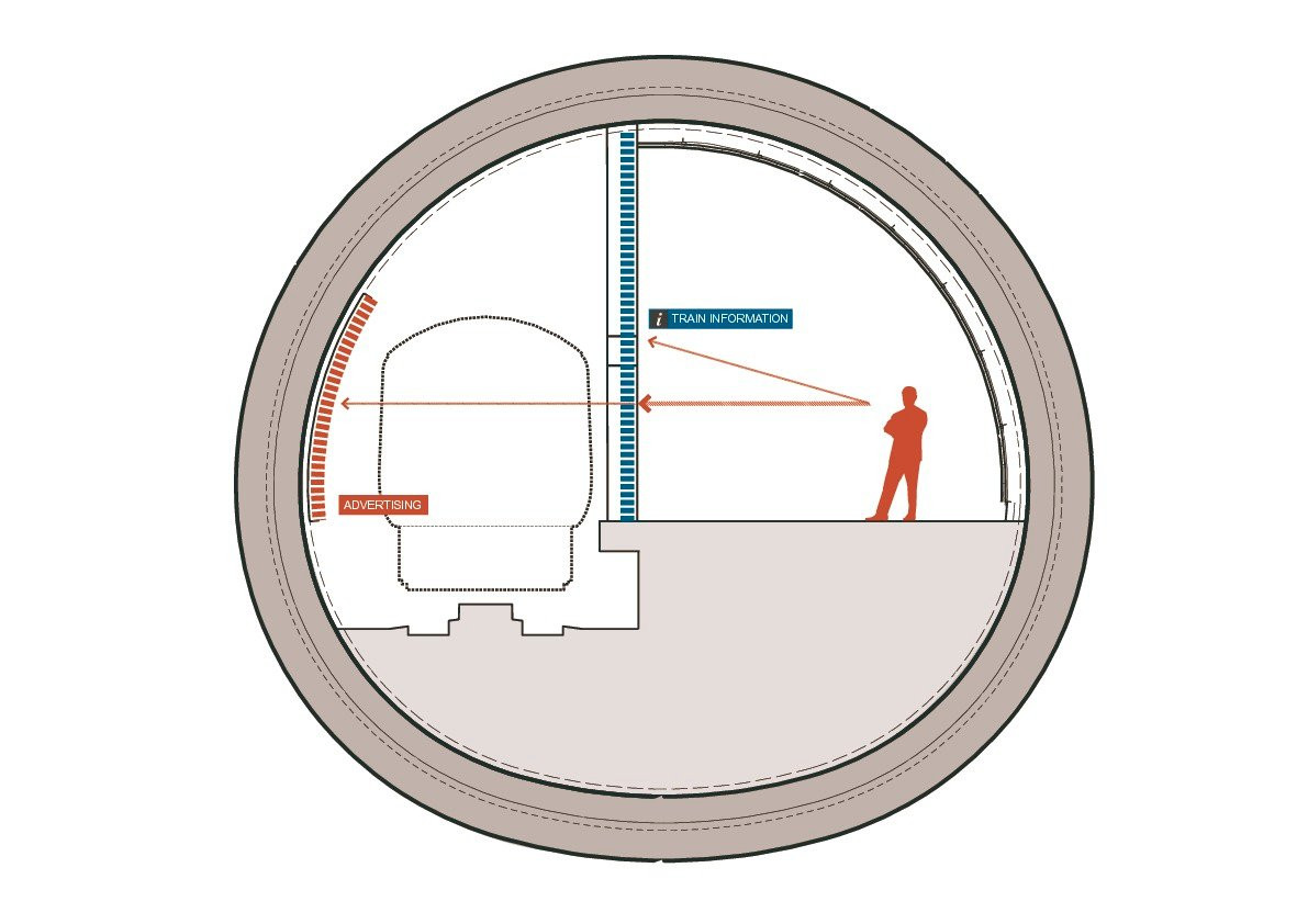 Další nominace putovala „podzemnímu“ týmu, kancelářím Grimshaw, Maynard, Equation a Atkins, kteří navrhovali nástupiště a komunikace pod zemí. Tudy vedou tunely, lemované stříkanými sklobetonovými panely, které jsou na křižovatkách zakřivené, aby se minimalizovala mrtvá místa a zlepšil se „tok“ cestujících. Designéři dokázali také snížit počet různých součástí a zefektivnit návrh. Omezili i paletu materiálů na beton, nerez, sklo, což zároveň racionalizuje údržbu.