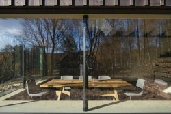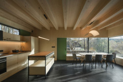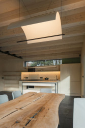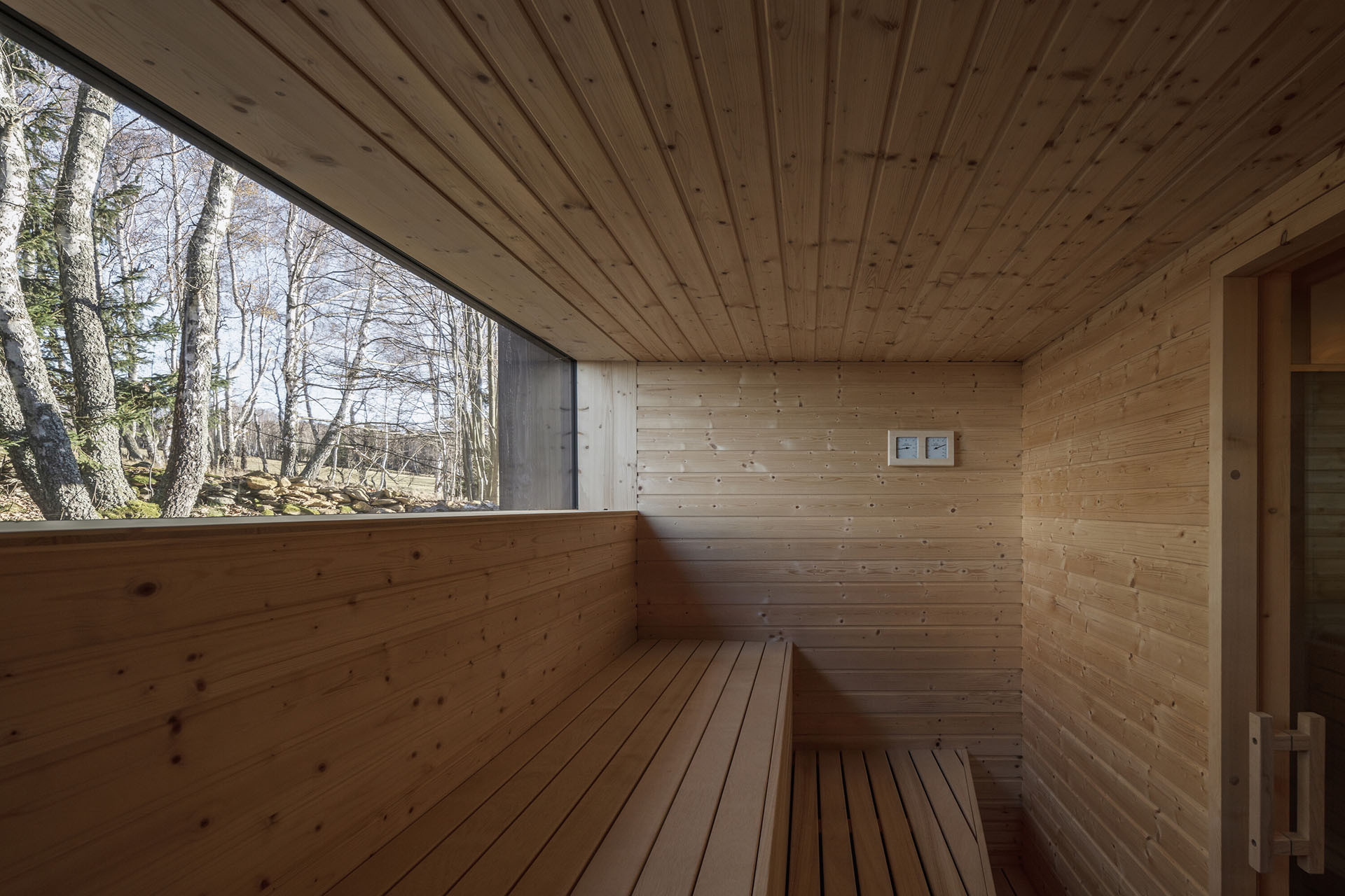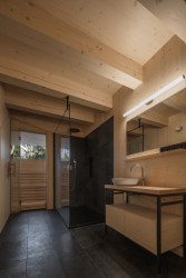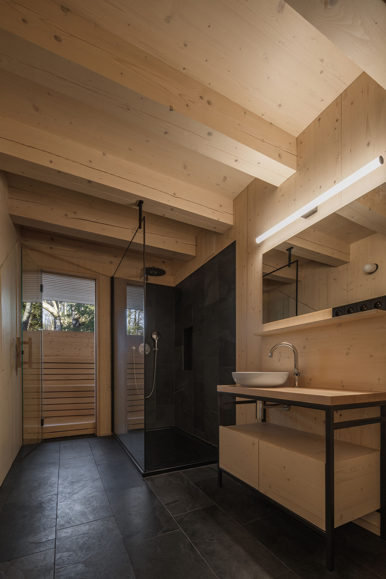 Tmavo jako ve starých roubenkách tady ale není - velká okna přinášejí dostatek světla. Novostavba těží i z dalších moderních možností současného stavebnictví. Má podlahové vytápění poháněné tepelným čerpadlem či saunu, do které se chodí přímo z koupelny. Je to tedy stavba pro luxusní chataření v srdci národního přírodního parku.