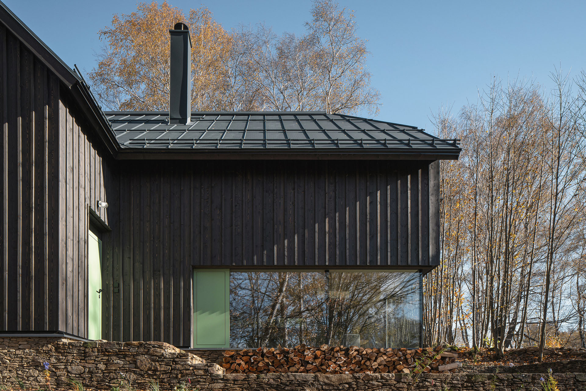 Na chalupě je na první pohled poznat, že je vytvořená současnými konstrukčními principy a s využitím moderních technologií. Jedná se sice o dřevostavbu, avšak ne o pro lokalitu tradiční roubenku. Chata je postavená z dřevěných panelů, zevnitř je vidět pohledovou smrkovou biodesku. Venku jsou opláštěné tmavě namořeným dřevem, což na vzhled starých šumavských chalup už opět navazuje. „V okolí časté zelené okenice byly inspirací pro větrací otvírky doplňující bezrámové zasklení oken,“ dodávají k barevnému řešení ještě architektky.