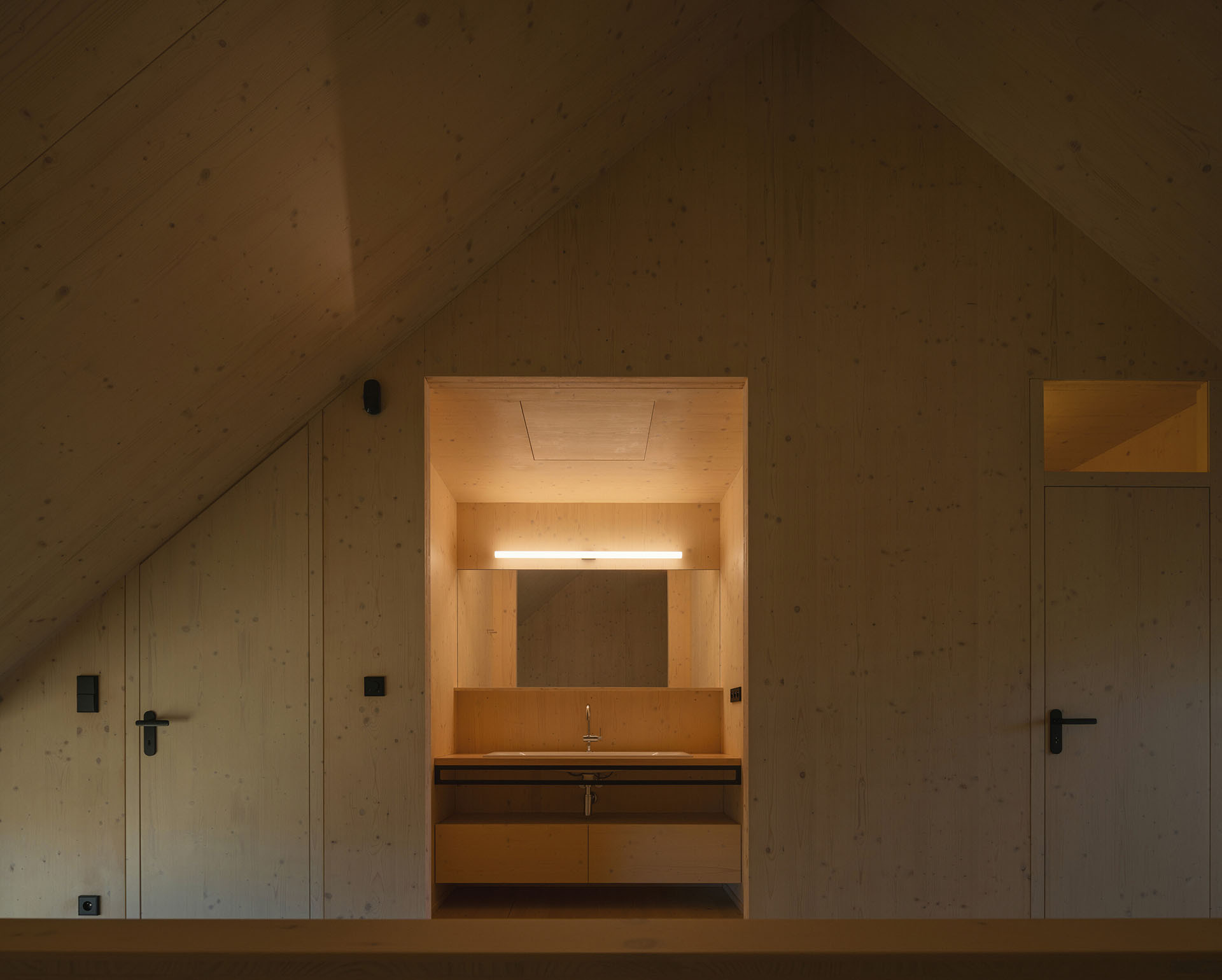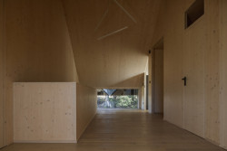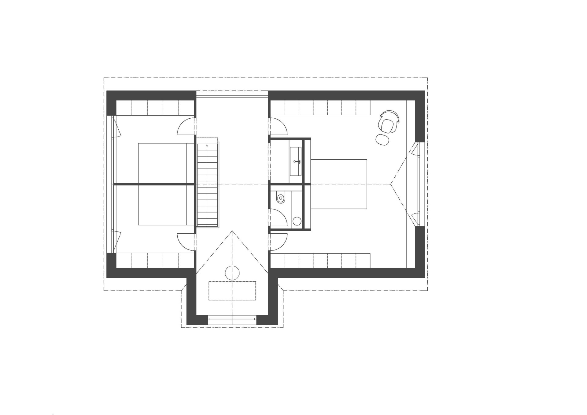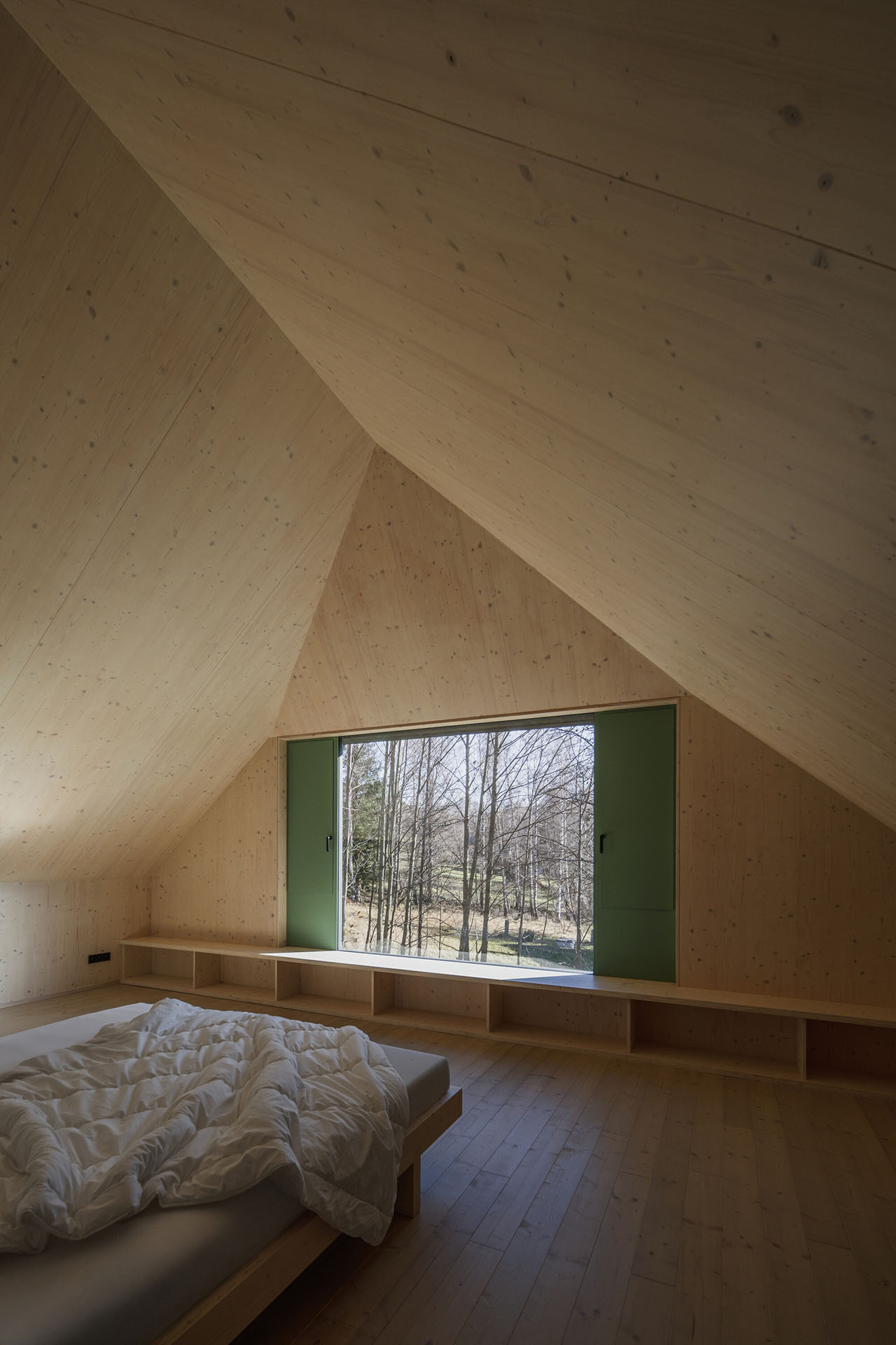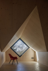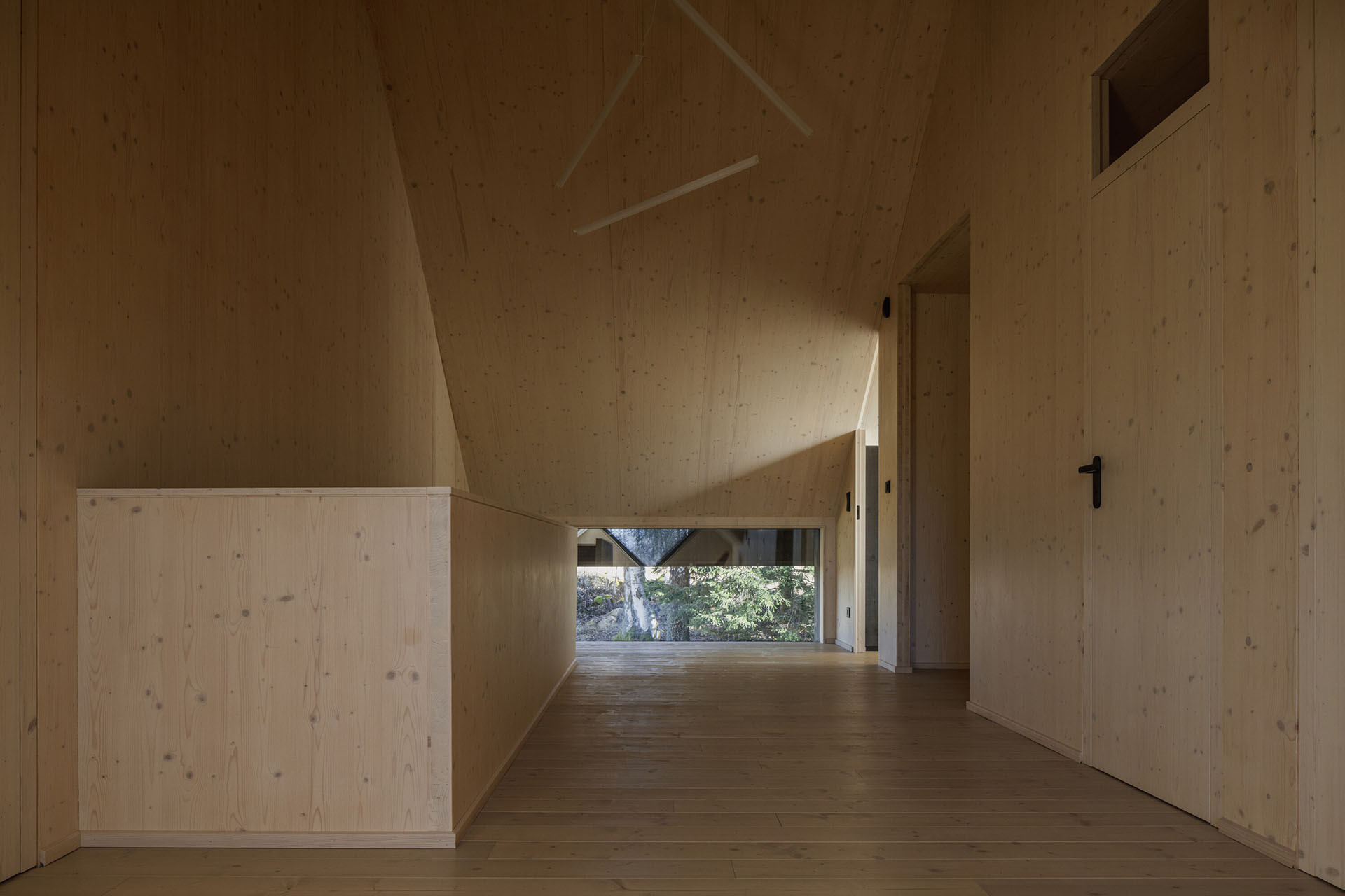 Tradičním motivem šumavských chalup jsou také tzv. zapuštěné pavlače ve štítové stěně. Chalupa od ateliéru Markéty Cajthamlové sice pavlač nemá, ale odkaz na ni ano – ve formě velkoformátového okna přímo pod zvalbením střechy, kterým je vidět ven z pokoje v podkroví.