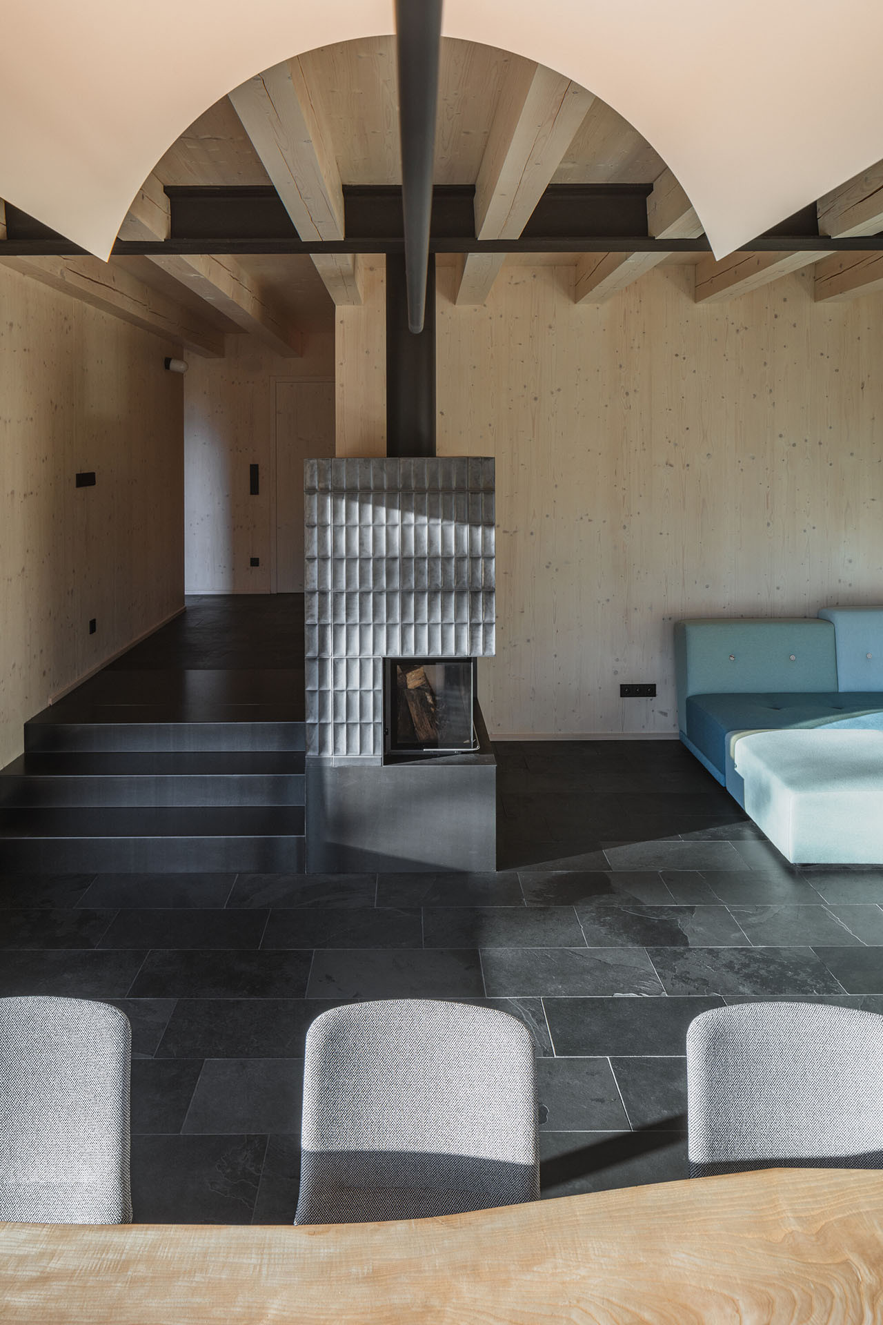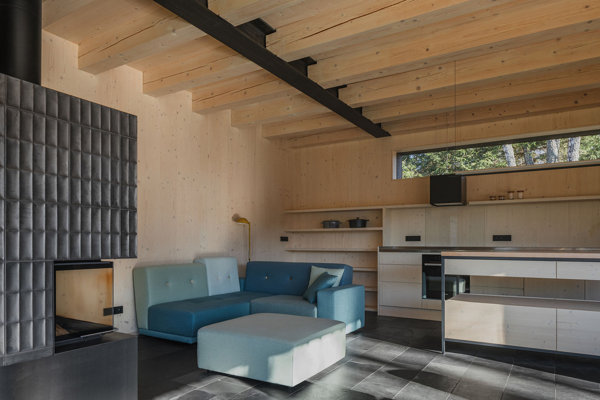 Tradiční šumavské chalupy mívají právě zvalbení střechy, tedy její zkosení ve štítech - dům tak lépe odolává větru. Architektky to dodržely i v novostavbě. Světnici uvnitř ovšem pojaly současně, je to moderní obývací pokoj spojený s kuchyní, jak jsme na to dneska zvyklí. Místo pece na ležení jsou v něm na míru navržená kamna, na která je výhled z gauče.