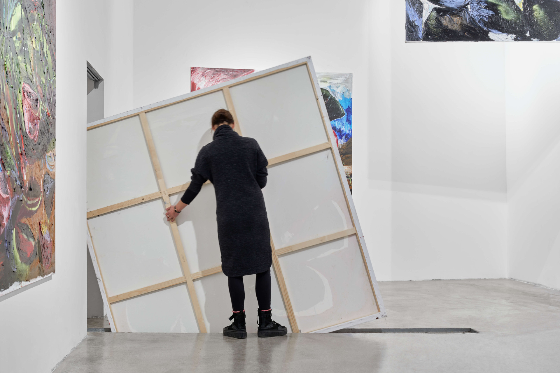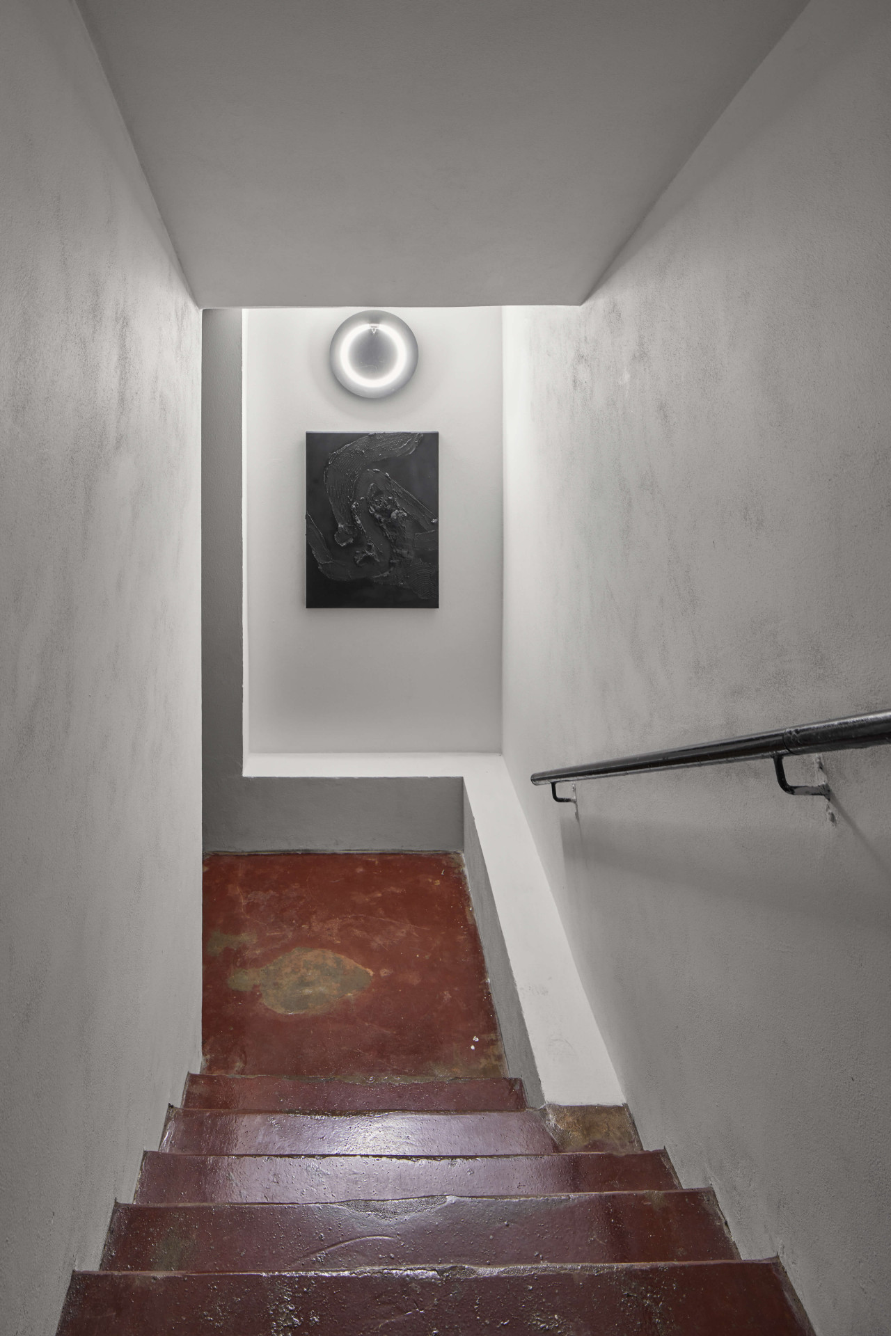 „Z hlediska prostoru tu byl jeden zásadní úkol, a to dostat obraz velikost 2x2 metru do depozitáře ve sklepení. V nízkém rozpočtu se nejvíce peněz soustředilo právě na tento úkol,“ vysvětlují architektky. Prostor galerie tak dostal několik dalších „záseků“. Tím prvním jsou nové vstupní dveře, druhým zvětšený přístup ke schodišti a posledním rýha u nízkých dveří depozitáře zakrytá ocelovým roštem.