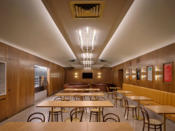 Výzvou byla zejména výměna všech dveří za posuvné, což byl zásadní provozní požadavek ze strany filharmonie,“ popsala na svých sociálních sítích Lenka Míková s tím, že: „dveře zapadají do jednotícího dřevěného obkladu, který integruje mnoho funkcí - vedle pítka, akustických výplní či rozhlasu to jsou právě i kapsy posuvných křídel, díky kterým jde proměnit využití prostoru.“ Klub tak slouží přes den jako kavárna či bar. Oba výdejní otvory jde ale stejně jako niku na tácy zavřít a vytvořit z jídelního prostoru zasedací místnost.