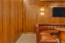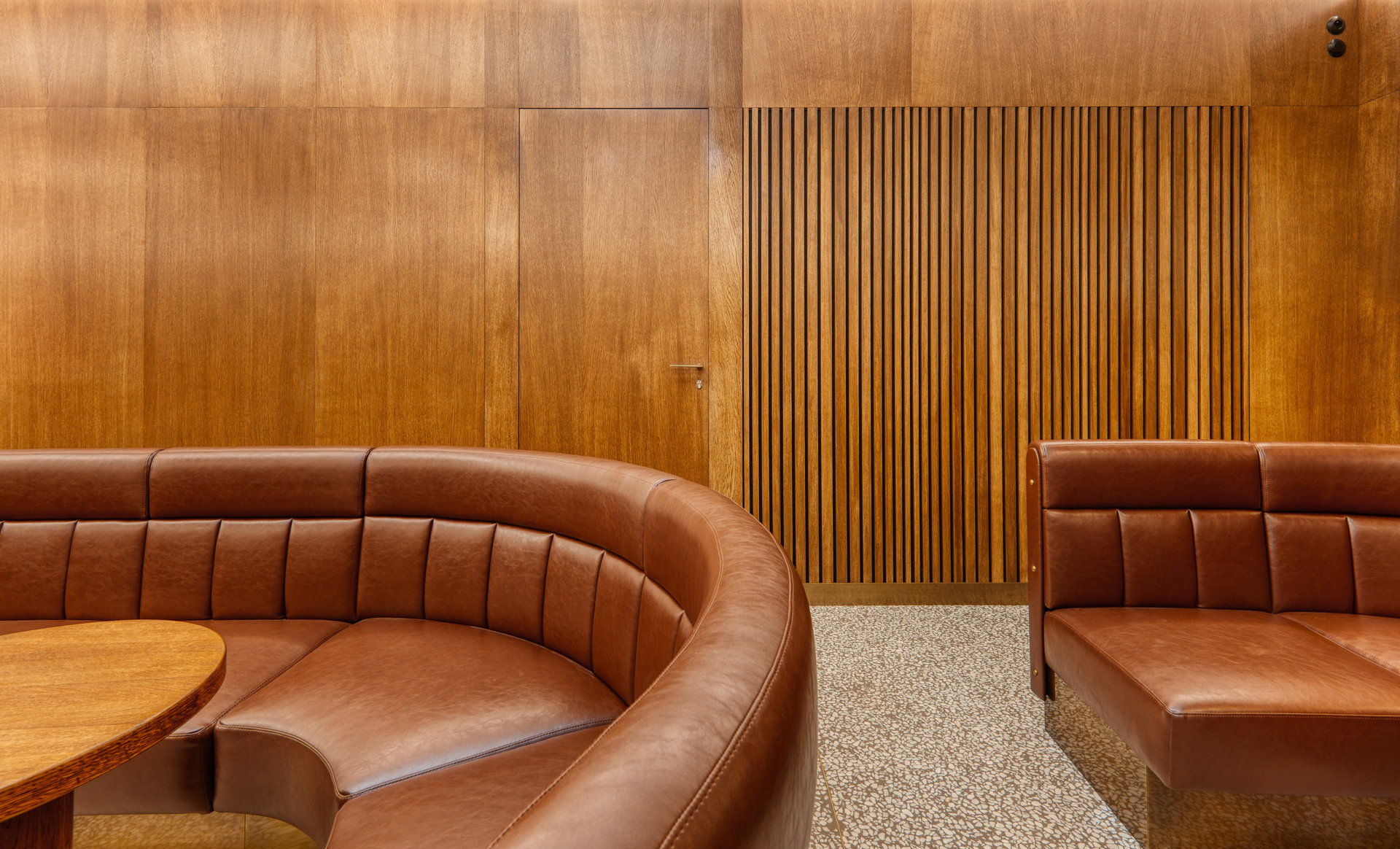 Pro prostor klubu byly vyrobeny také reverzní dveře skryté v obkladu, které se otevírají ven – bez viditelné rozety a s klikou elegantně vyfrézovanou přímo do křídla. I zde šlo o atypické řešení vyžadující nestandardní konstrukci rámových zárubní. Materiálově jde o tmavý dub, pro prostory klubu ošetřený olejem, pro recepci potom mořený.
