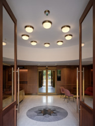 Právě recepci dominují impozantní dvoukřídlé dveře s výškou 3165 mm a čtyřmi panty na každém dveřním křídle, vybavené automatickým pohonem pro případ evakuace. Spodní část dveří je plná, zatímco horní část zdobí elegantní prosklení ve zkoseném dřevěném rámu.