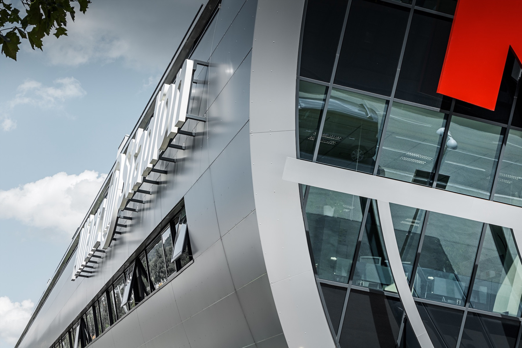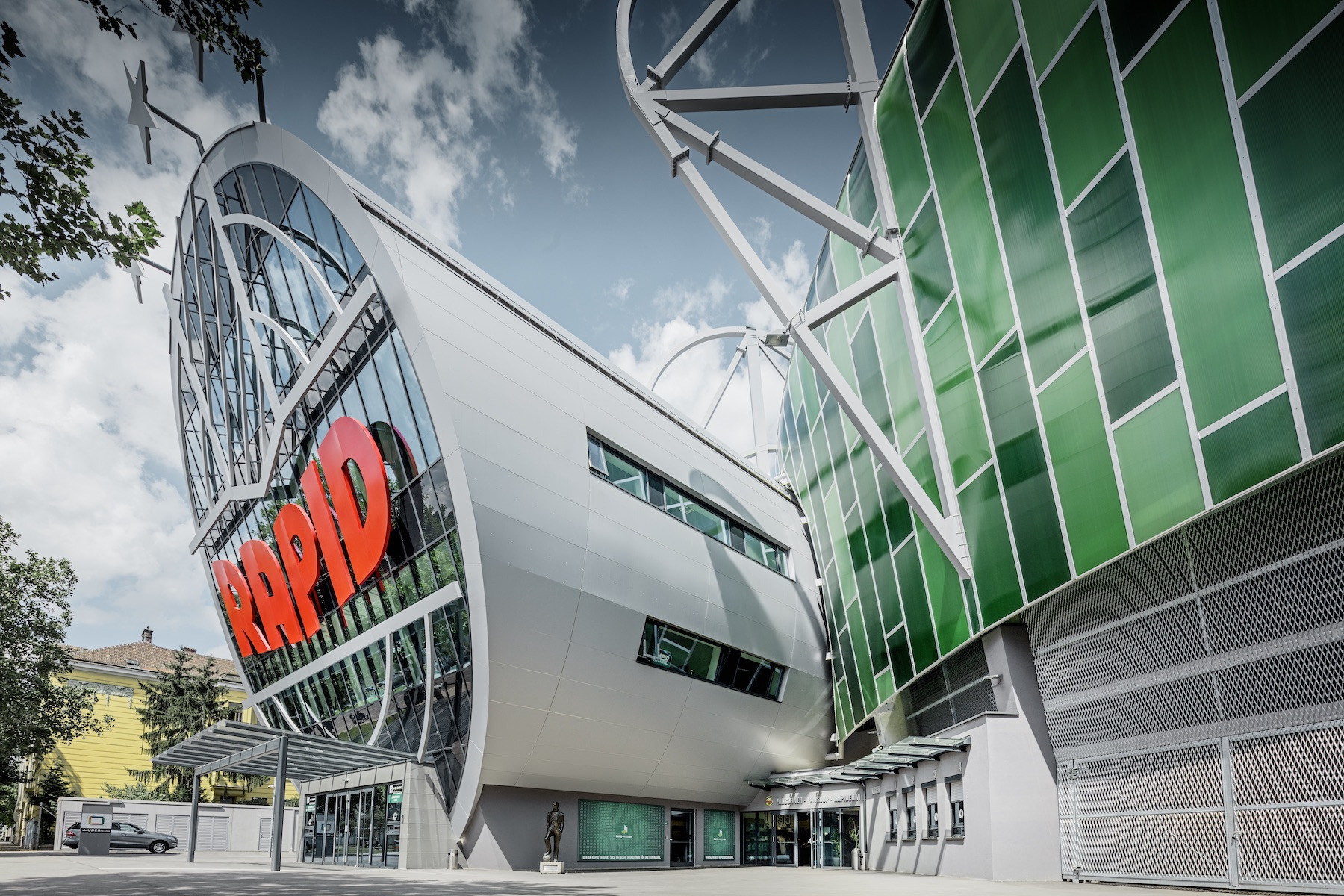 Tubus je centrálním prostorem stadionu. Jsou v něm lóže pro návštěvníky, administrativní prostory Rapidu, obchody pro fanoušky, centrální recepce a muzeum Rapideum. Abychom tubusu dodali moderní výraz, napadlo nás ho vepředu zkosit a opatřit sklem. Veškeré postranní plochy jsou z hladkého stříbra, jako u kosmické lodi. Pokud jde o volbu materiálu, rychle jsme našli ten správný. Důležitou roli hrálo několik faktorů. Střecha a fasáda měly vypadat jako jeden celek s plynulým přechodem - PREFA kompozitní deska to umožňovala. Obklady vysoké kvality provedla Direktion Metallica, dceřiná společnost stavebního koncernu STRABAG AG. Zaoblení, napojení oken a detaily byly skutečně velmi náročné. Výsledkem je dynamicky, kovově působící stavba, v harmonii se zelenou barvou a betonem. „Velmi zdařilý výškový dům naležato,“ komentovala to kdysi jedna zaměstnankyně Rapidu. A má pravdu.