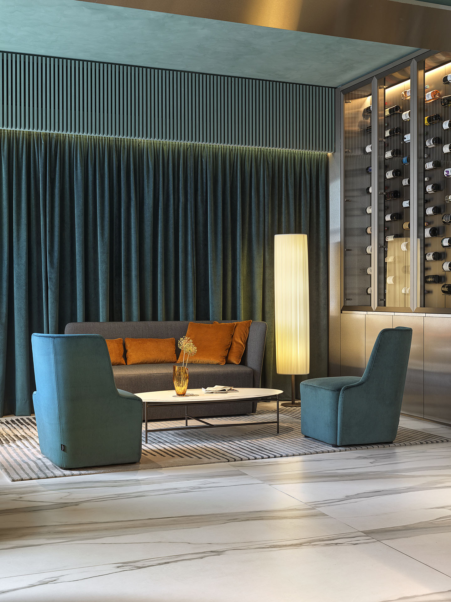 V přízemí je lobby, recepce a restaurace, propojené velkými okny s ulicí. Vše v dialogu kvalitních materiálů, kovových povrchů a intimních barev. Kromě toho mohou ubytovaní hosté využívat také společné fitness, prostory pro práci či prádelnu.