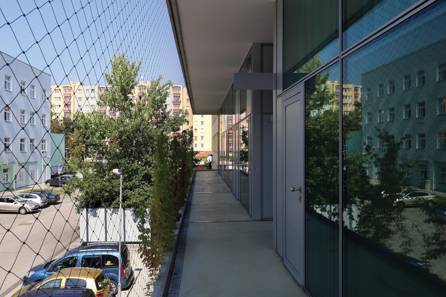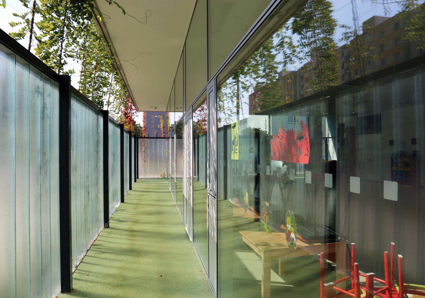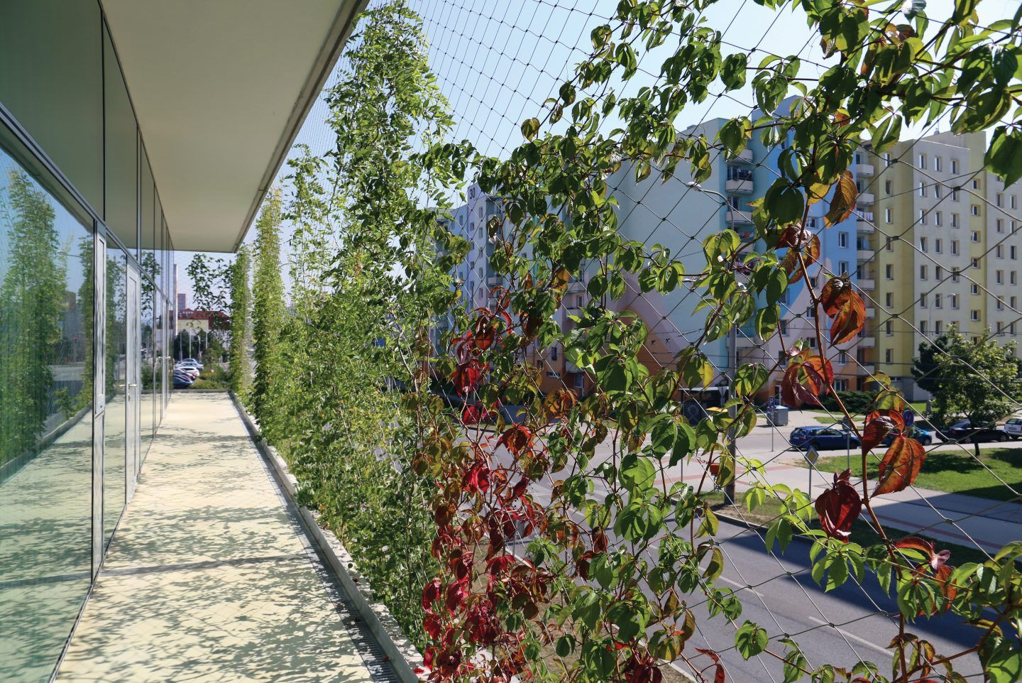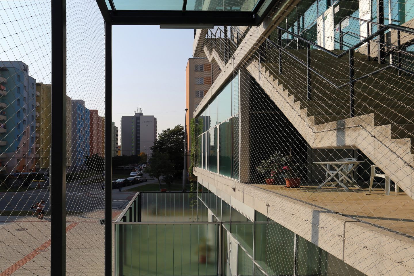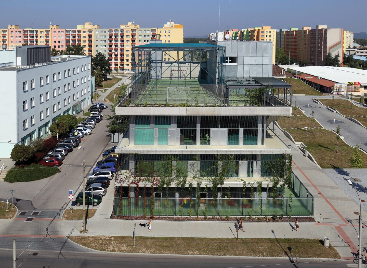 Architektura – schodiště a ostatní komunikační a pobytové prostory na obvodě objektu na všech podlažích umožňují propojení budovy a veřejného prostoru / náměstí spojené se všemi podlažími až po hřiště na střeše / vykonzolované stropní desky a ustoupení obvodového pláště vytvářejí přirozenou ochranu před přímým slunečním zářením a průchozí prostor s proměnlivou šířkou / ochranná síť slouží jako podklad pro autochtonní opadavé popínavé rostliny s nízkými nároky na údržbu / program pěti provozů se vstupy z různých stran a úrovní je umístěn do třech nadzemních podlaží s exteriérovým hřištěm a dvoupodlažního menšího objektu na střeše.