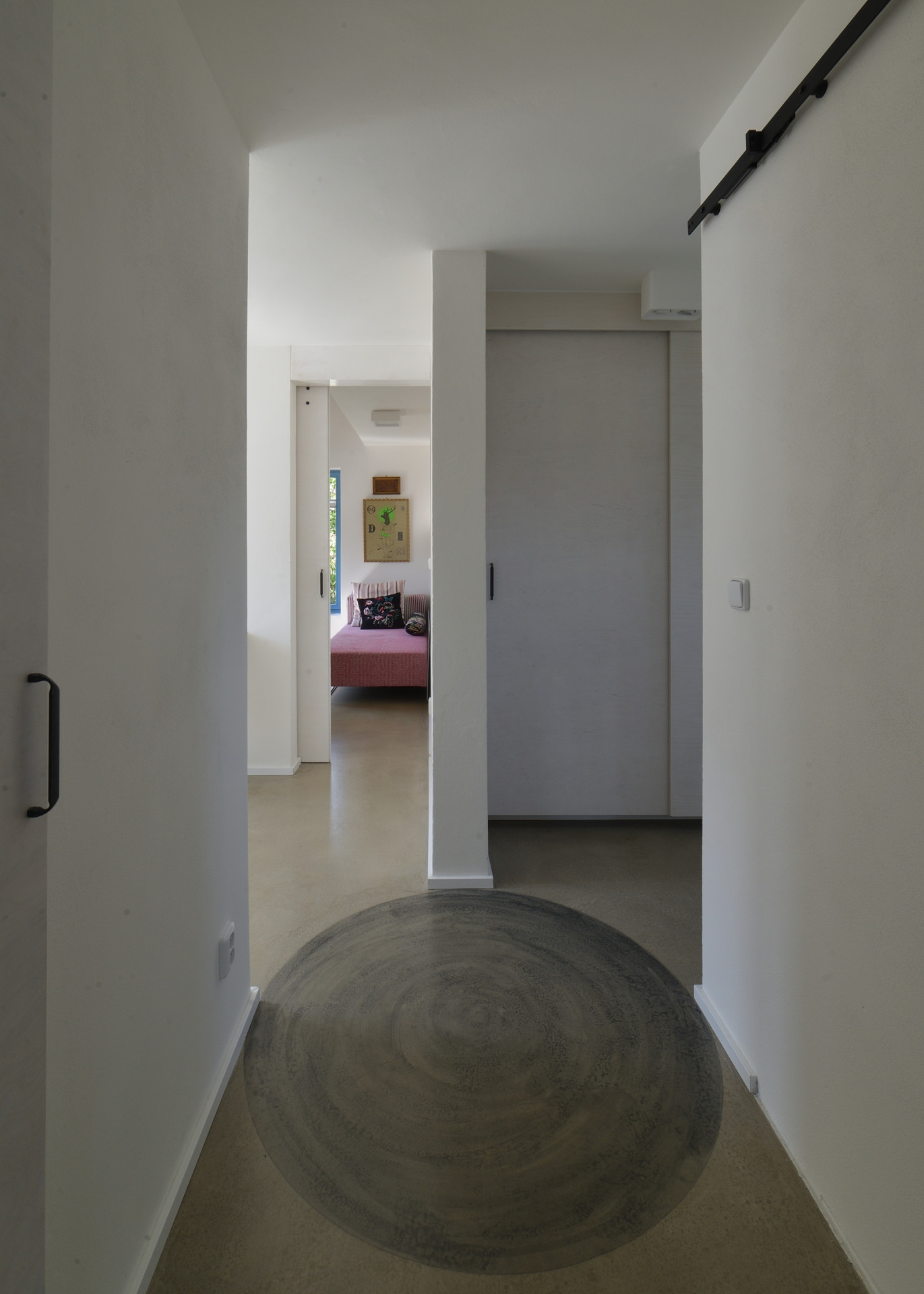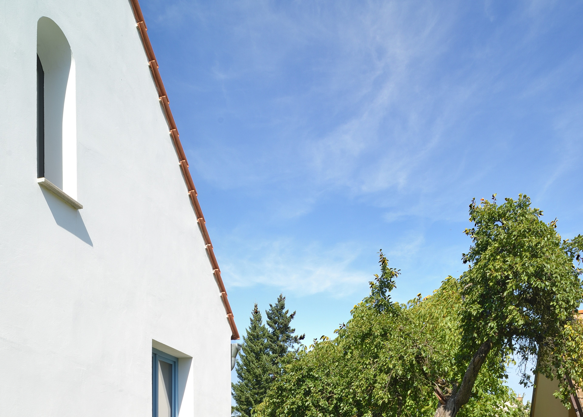 Mezi bílým vybavením a světlou cementovou podlahou nakonec vynikají sytě modré okenní rámy. Nápadné jsou už z fasády směřující k ulici. Modré špaletové okno a okénko s půlkruhovým zakončením jsou do ní zasazená asymetricky, dům působí, jako by byl postupně rostlý, je to ale skutečně novostavba.