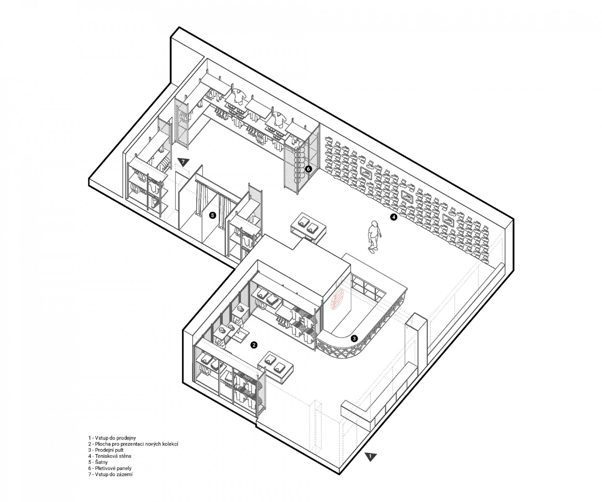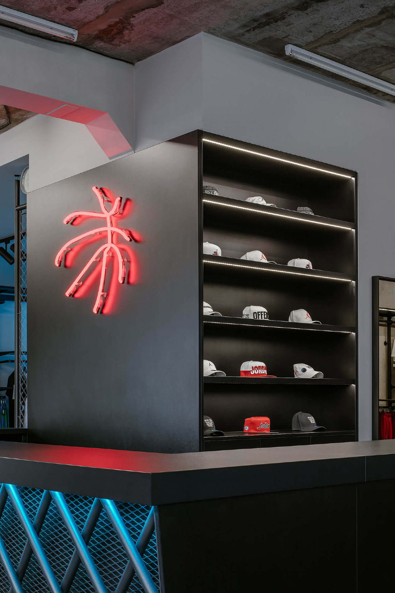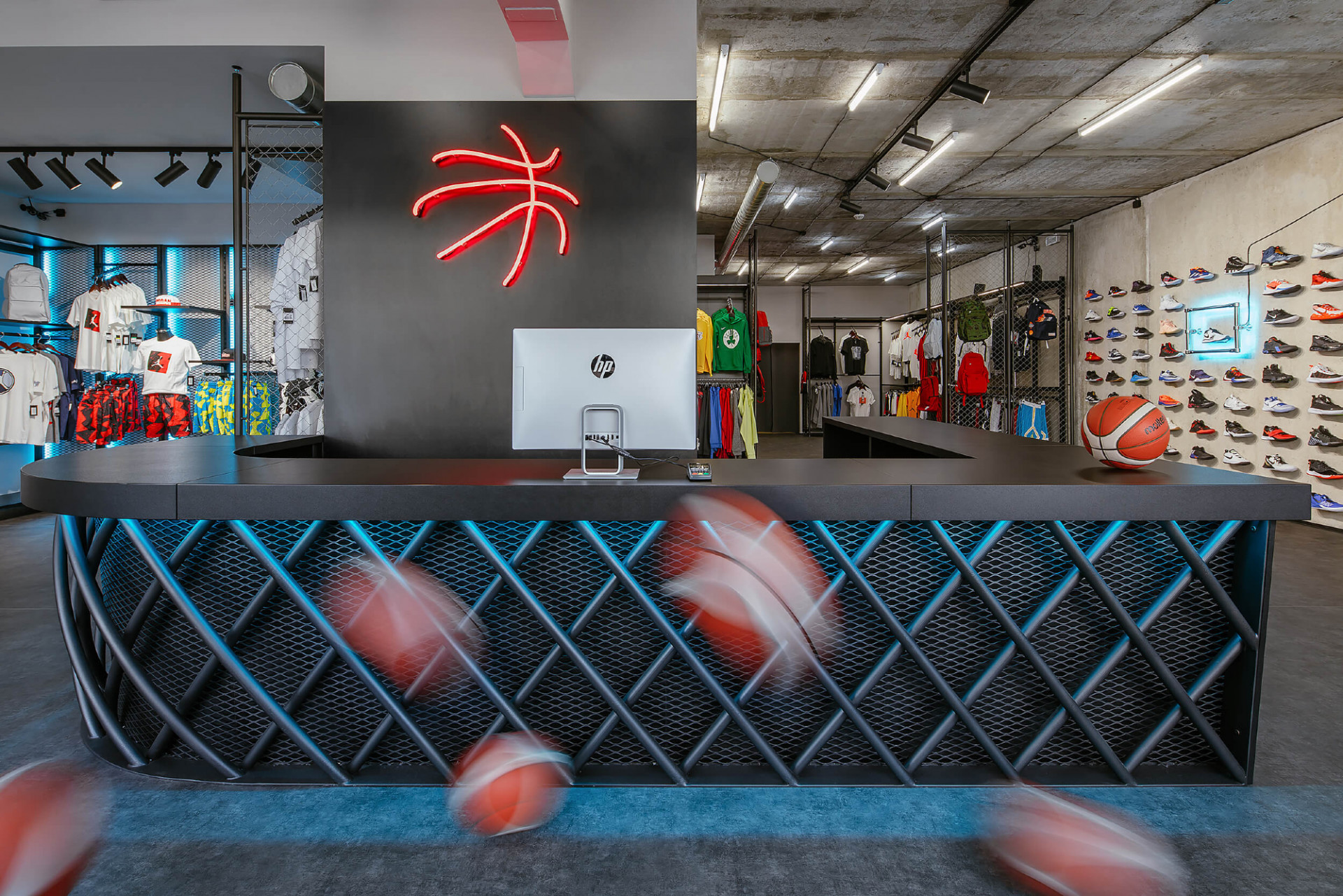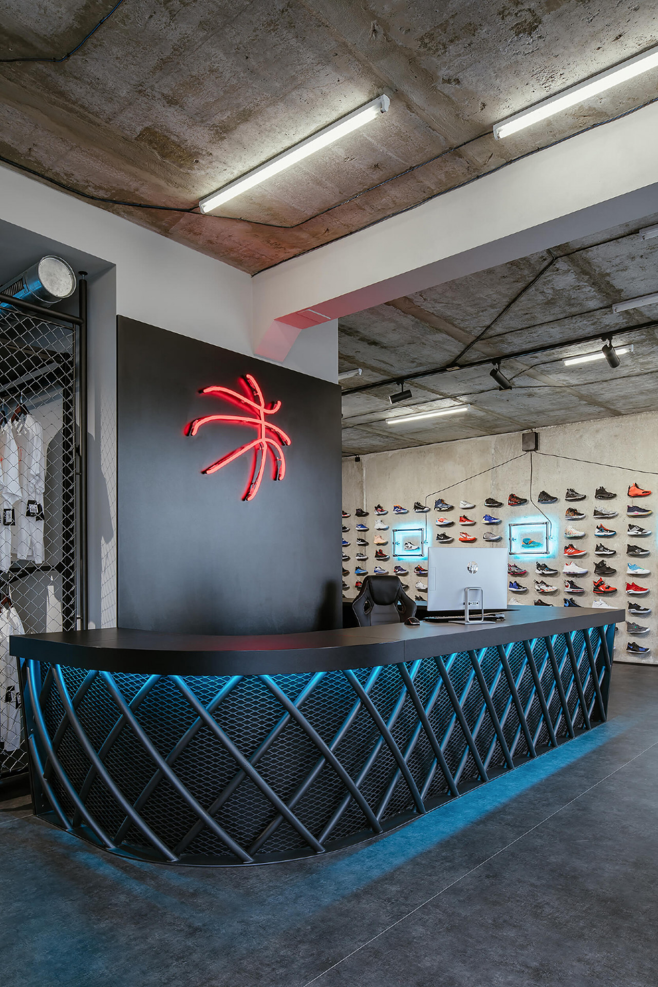 Mladé architektonické studio PANIKHORN navrhlo kompletní proměnu prostoru bývalé samoobsluhy v jednom z paneláků pražské Libně na designovou prodejnu sportovního oblečení a basketbalové obuvi. Architekti pracovali s kombinací odhaleného surového betonu a barevných neonů, které dávají vyniknout vystavenému zboží. Celému obchodu pak dominuje prodejní pult s červeným neonem ve tvaru basketbalového míče.