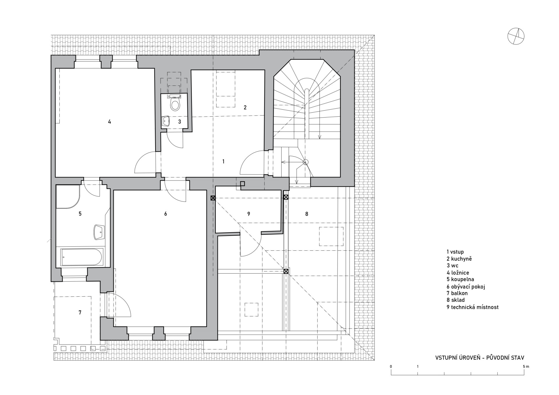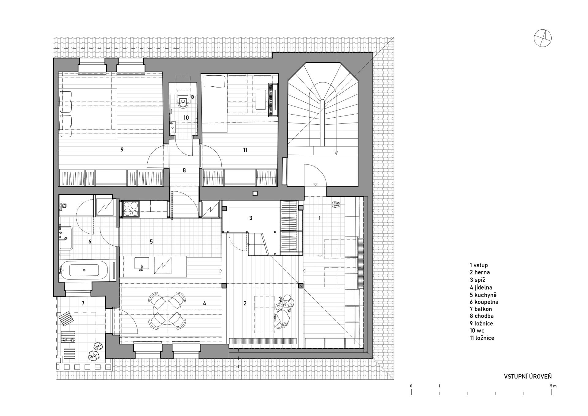 „Původní byt v podkroví trpěl dispozičními nedostatky (vstup z domovního schodiště přímo do kuchyně, průchozí ložnice, chybějící dětský pokoj). Zbývající půda plná harampádí a pavučin skýtala pod šikmou střechou s velkorysými vikýři slibné možnosti využití převýšeného prostoru. Optimismus a očekávání, svěžest a hravost éry národního slohu počátků československé republiky se staly volnou inspirací pro náš návrh,“ popisují začátek projektu architekti.