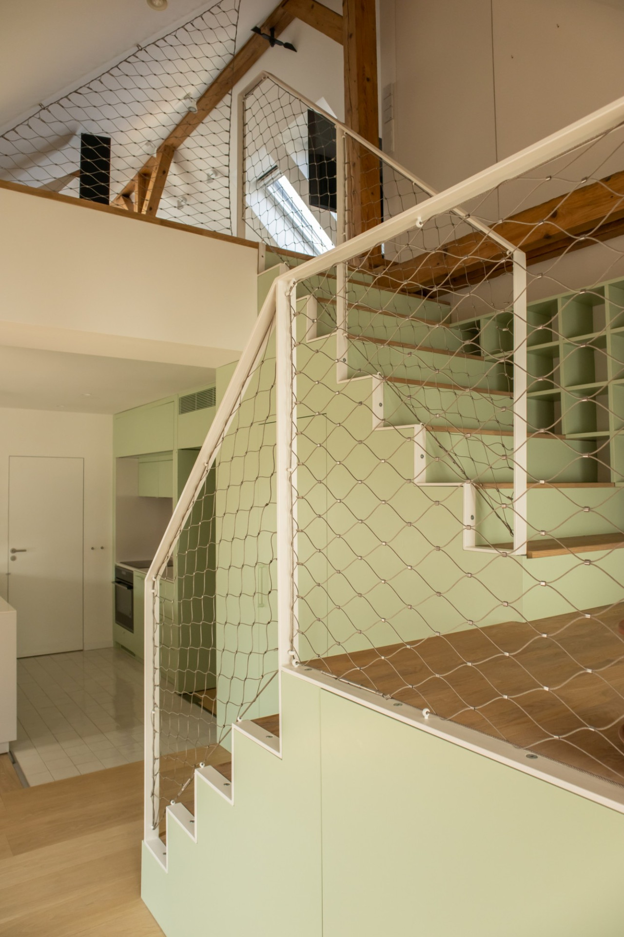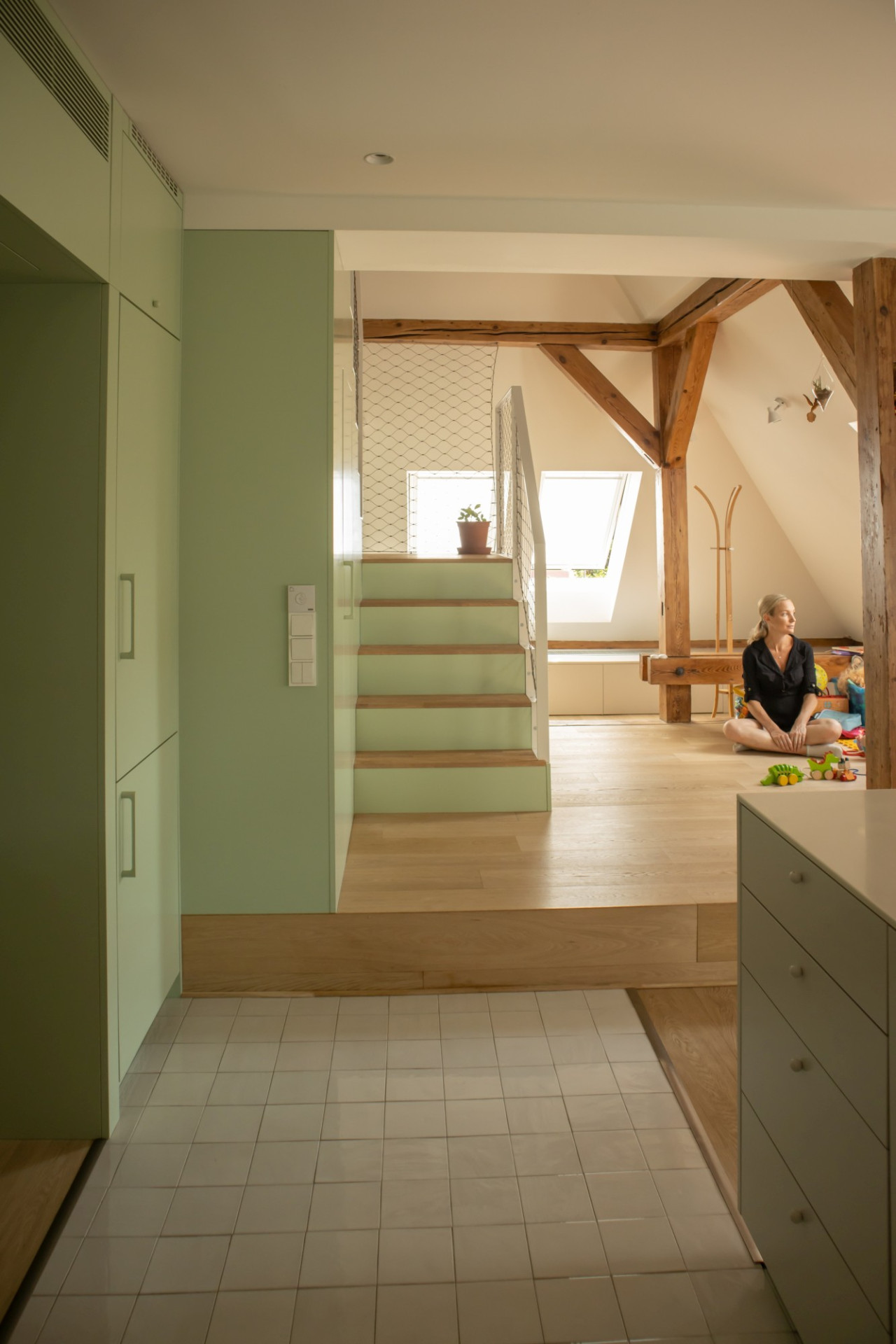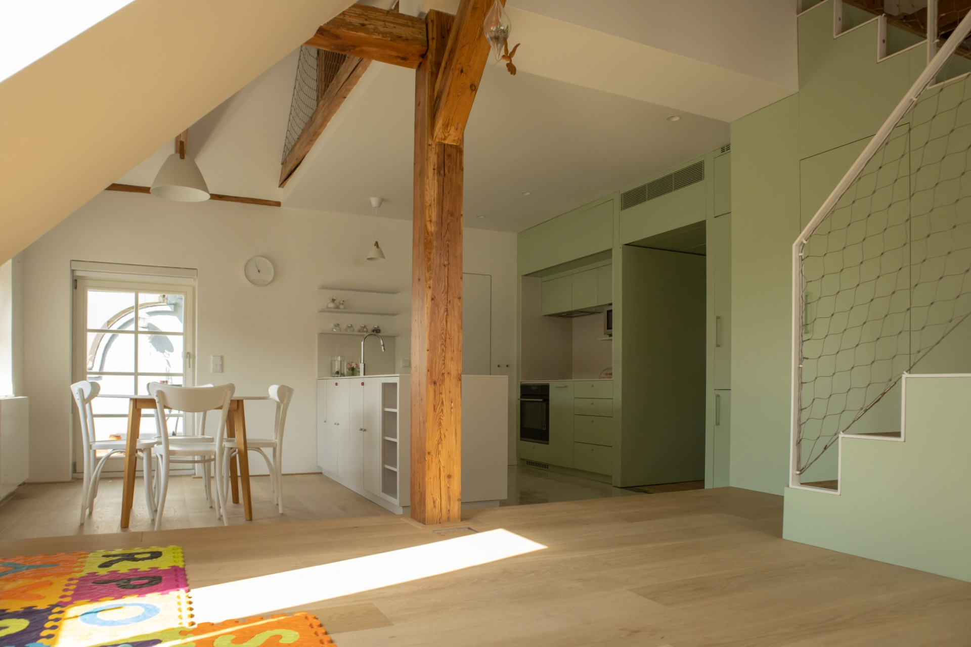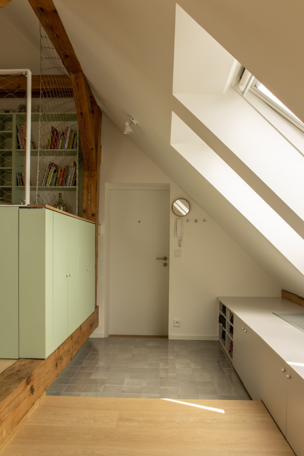 Uvnitř této kostry krovu, kterou tvoří mohutné dřevěné trámy s příjemnou patinou, architekti rozšířili a redefinovali původní byt. Patrně největším zásahem je odstranění střední nosné zdi, takže se k bytu připojil někdejší nevyužívaný sklad. Dále přibylo vložené schodiště, díky němuž bylo možné expandovat o patro výš na zmíněnou půdu. Namísto harampádí je tu teď obytný prostor s pracovnou. Vložené schodiště obsahuje úložné prostory. Volně navazuje na kuchyňskou linku ve stejném odstínu světle zelené, čímž společně vymezují společenský prostor bytu.