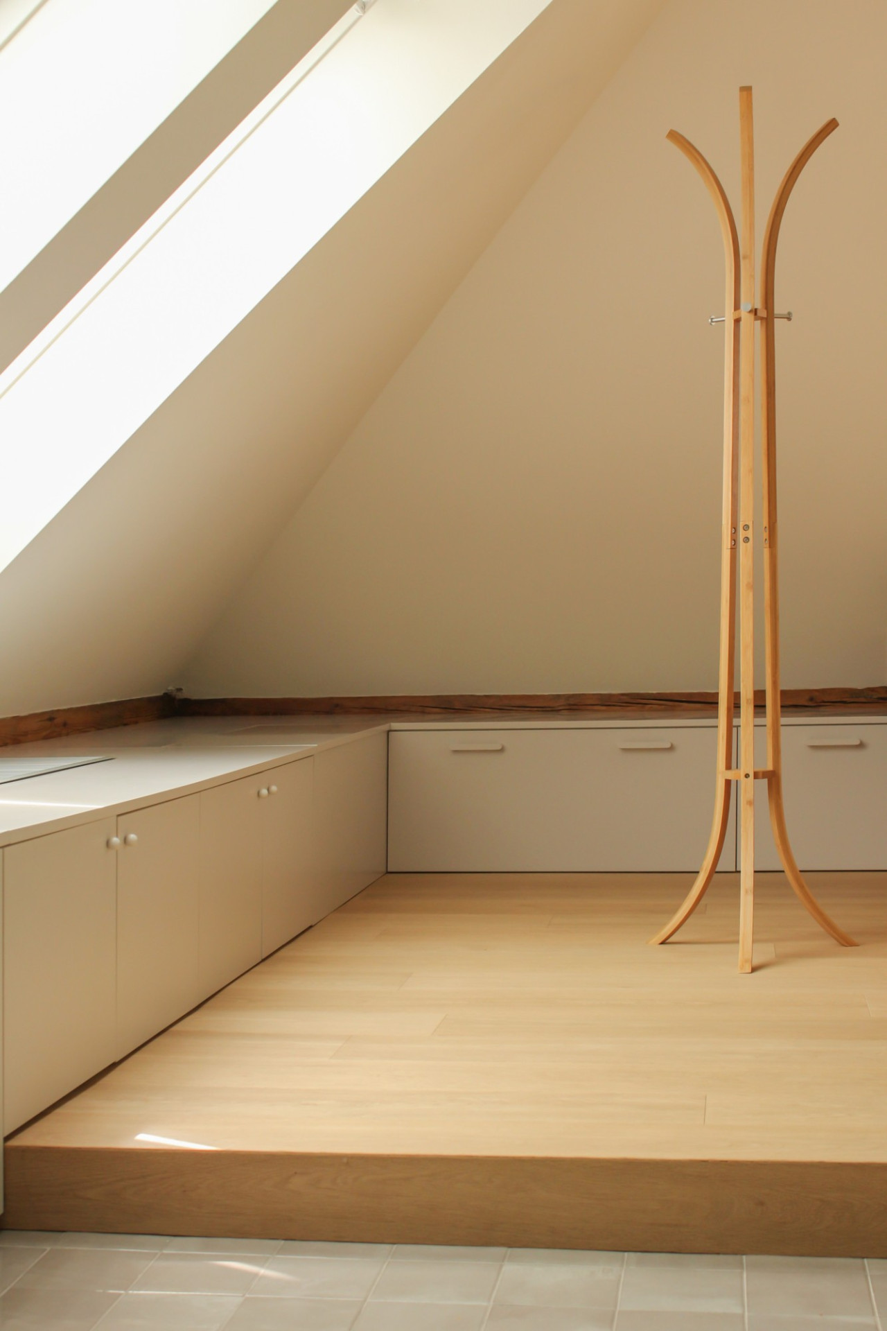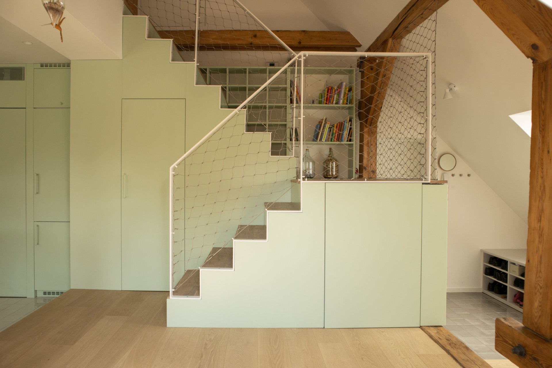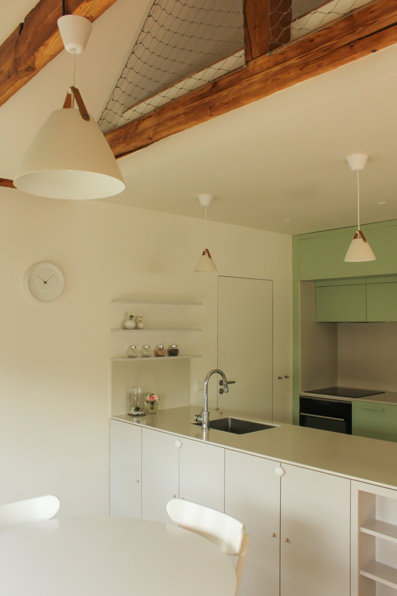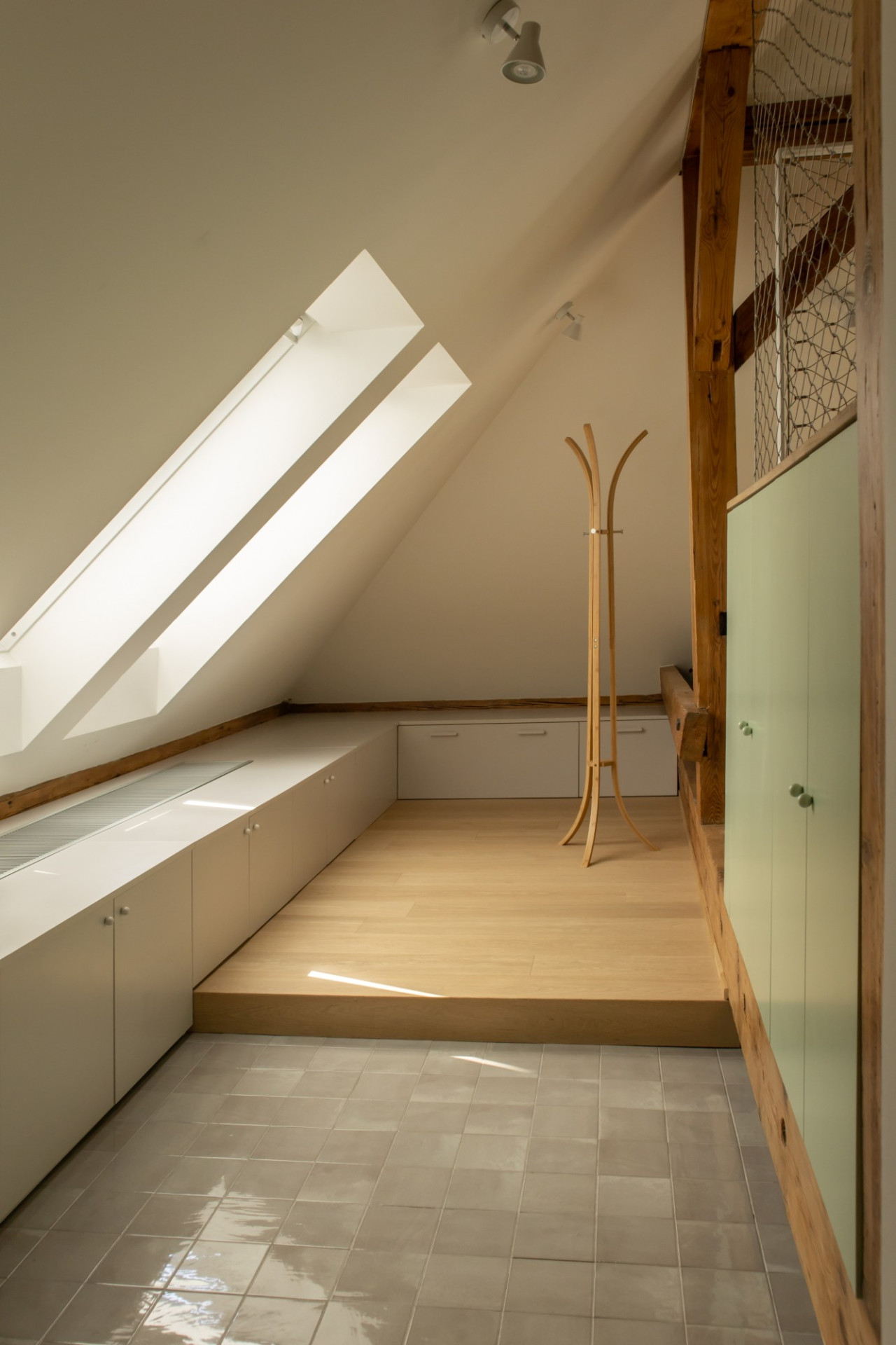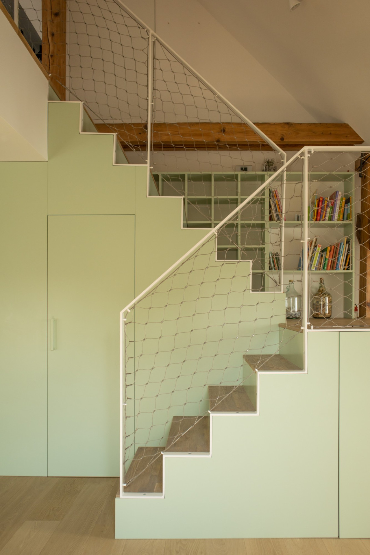 Uvnitř této kostry krovu, kterou tvoří mohutné dřevěné trámy s příjemnou patinou, architekti rozšířili a redefinovali původní byt. Patrně největším zásahem je odstranění střední nosné zdi, takže se k bytu připojil někdejší nevyužívaný sklad. Dále přibylo vložené schodiště, díky němuž bylo možné expandovat o patro výš na zmíněnou půdu. Namísto harampádí je tu teď obytný prostor s pracovnou. Vložené schodiště obsahuje úložné prostory. Volně navazuje na kuchyňskou linku ve stejném odstínu světle zelené, čímž společně vymezují společenský prostor bytu.