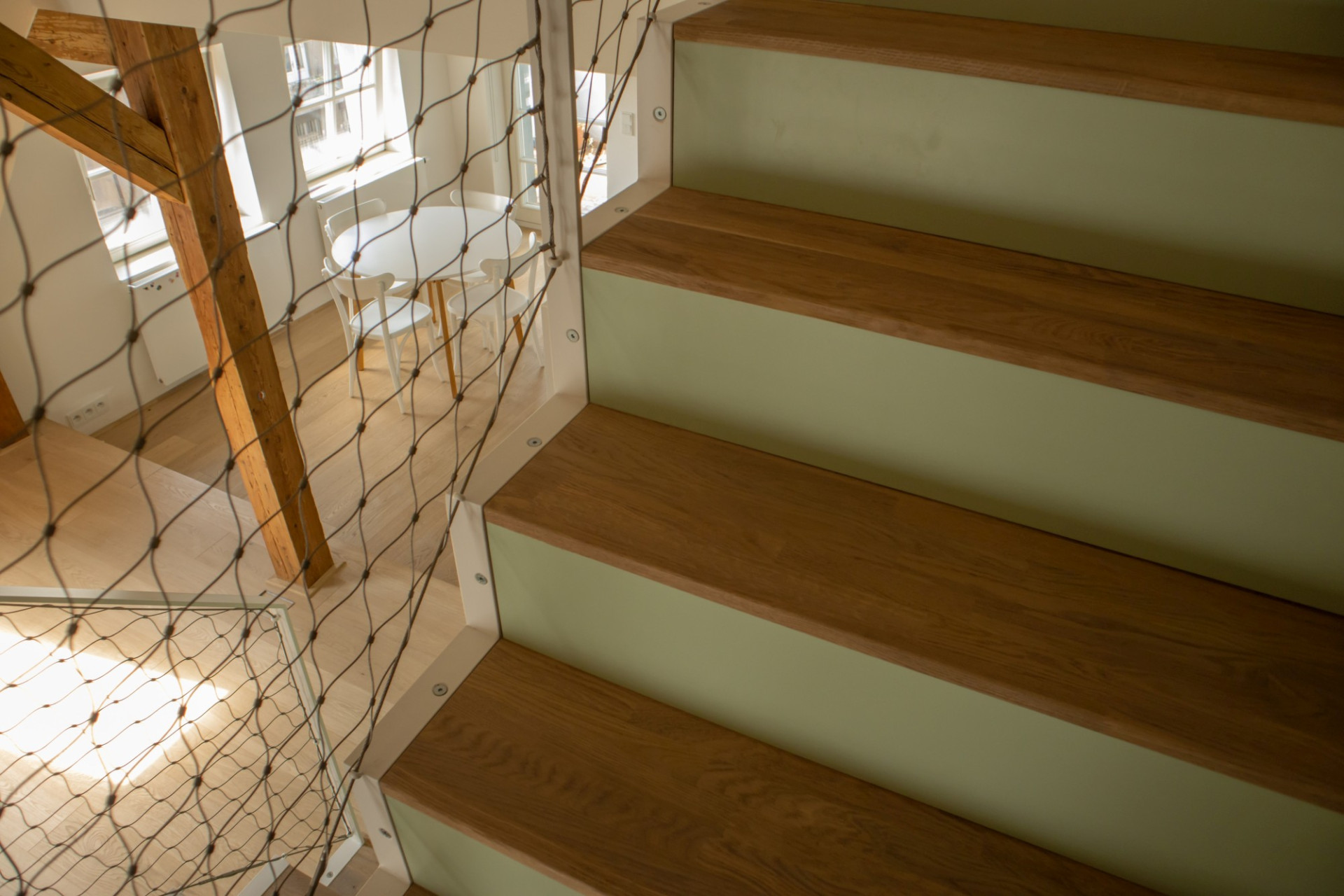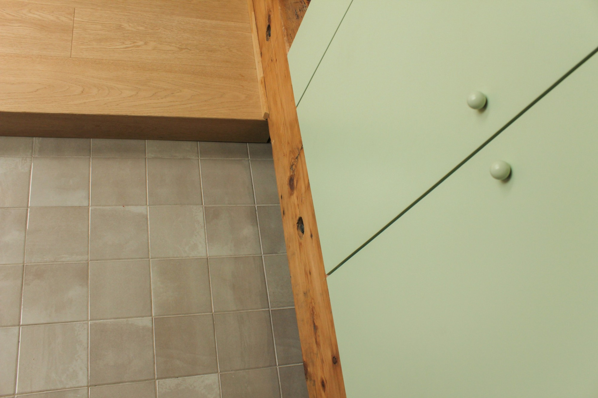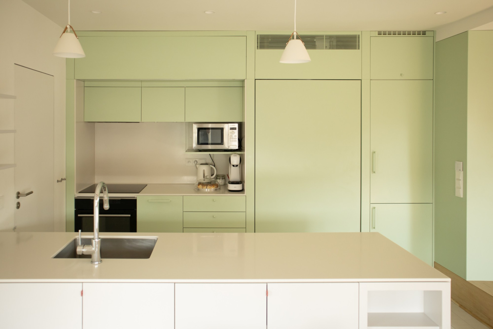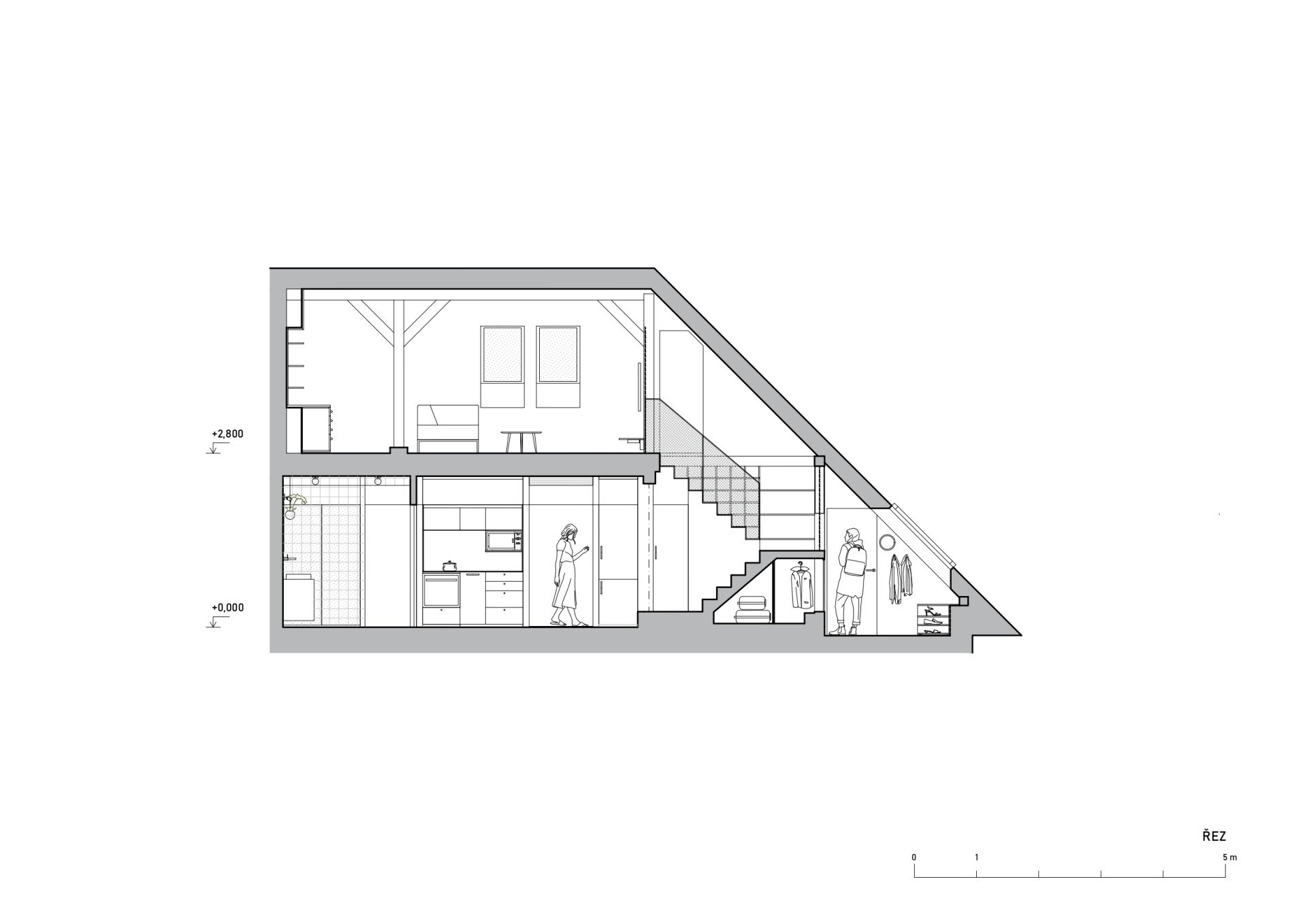 Uvnitř této kostry krovu, kterou tvoří mohutné dřevěné trámy s příjemnou patinou, architekti rozšířili a redefinovali původní byt. Patrně největším zásahem je odstranění střední nosné zdi, takže se k bytu připojil někdejší nevyužívaný sklad. Dále přibylo vložené schodiště, díky němuž bylo možné expandovat o patro výš na zmíněnou půdu. Namísto harampádí je tu teď obytný prostor s pracovnou. Vložené schodiště obsahuje úložné prostory. Volně navazuje na kuchyňskou linku ve stejném odstínu světle zelené, čímž společně vymezují společenský prostor bytu.