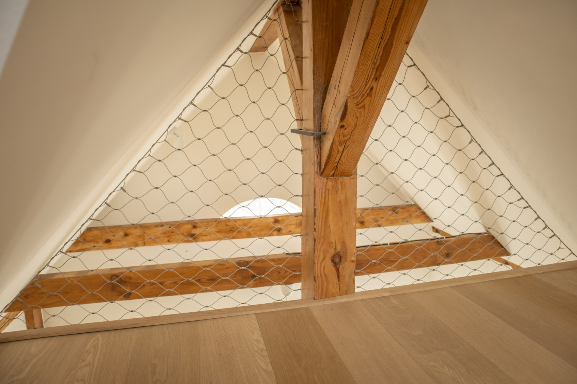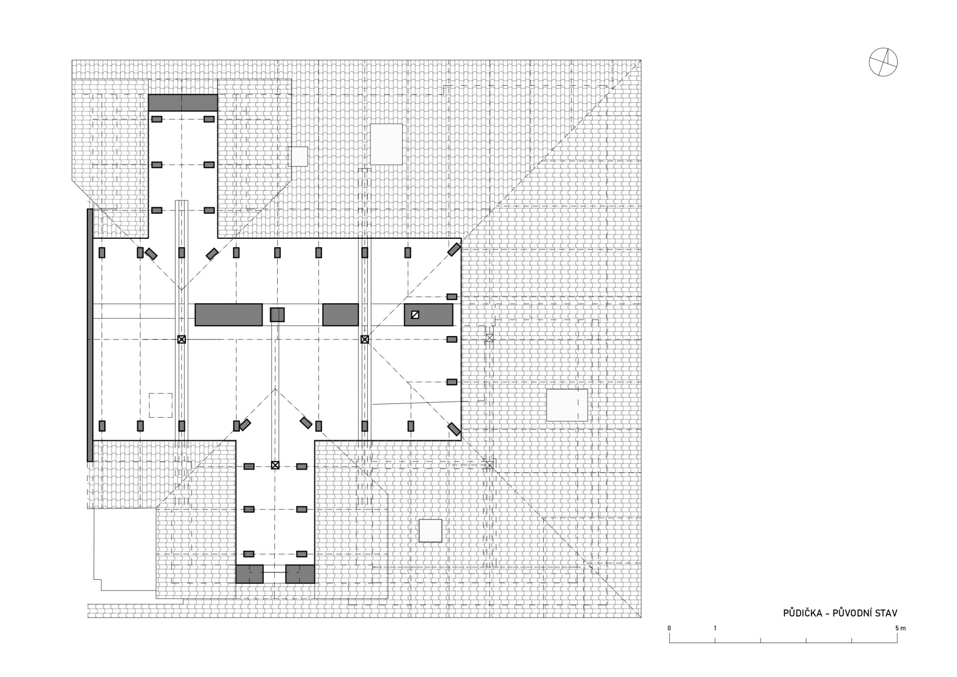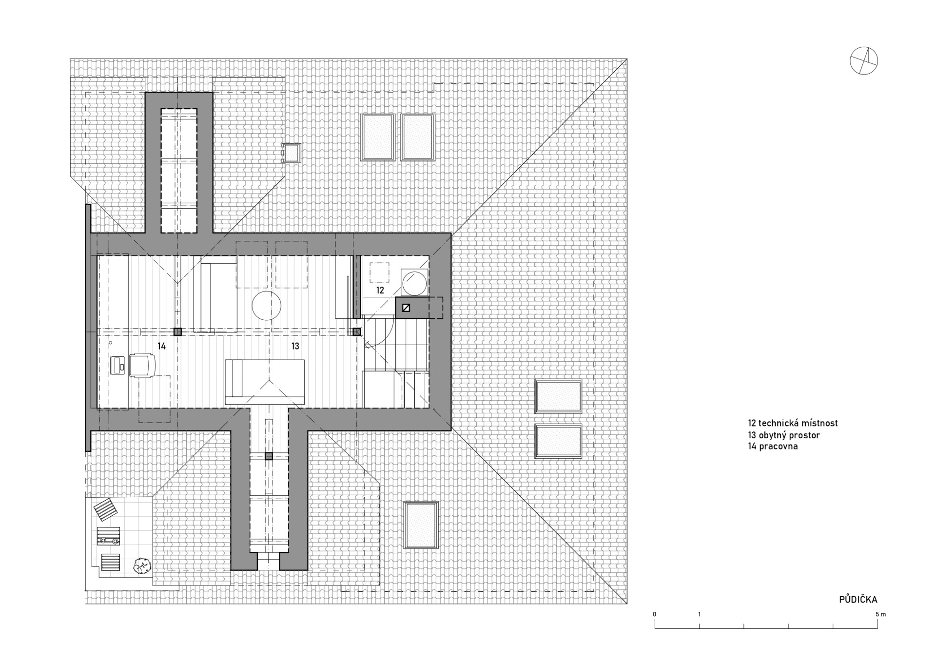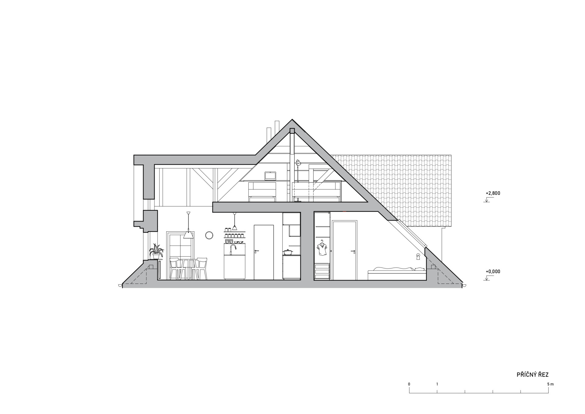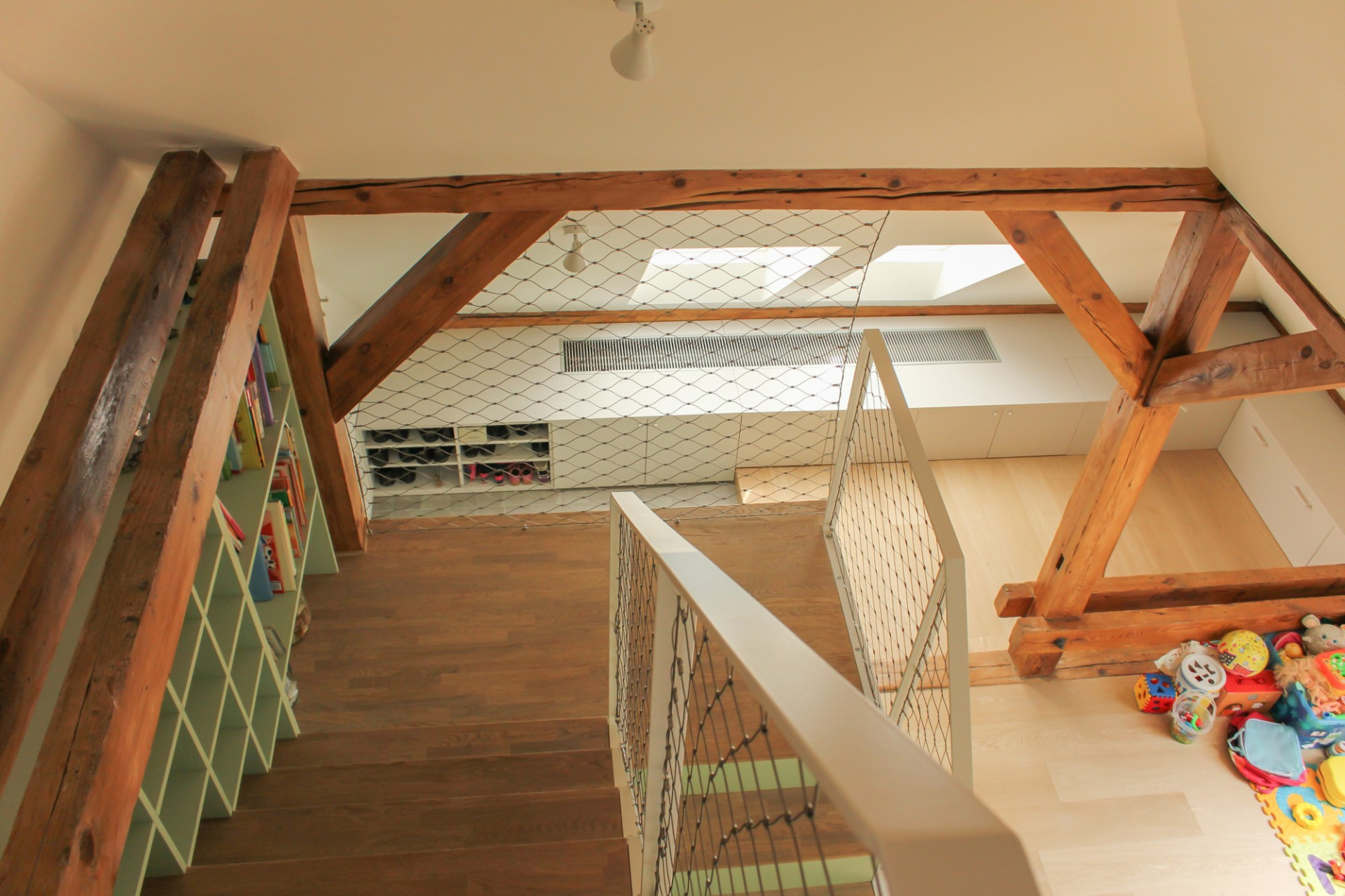 Celý prostor podkroví musel projít komplexní rekonstrukcí. Hlavní ideou již od začátku projektu bylo nechat krov maximálně otevřený a přiznaný, aby se stal hlavním a dominantním prvkem celého bytu. Kompletně odkryt byl také původně zabedněný prostor vikýřů. Nosné prvky, které omezovaly pohyb v prostoru byly nahrazeny skrytými ocelovými konstrukcemi.