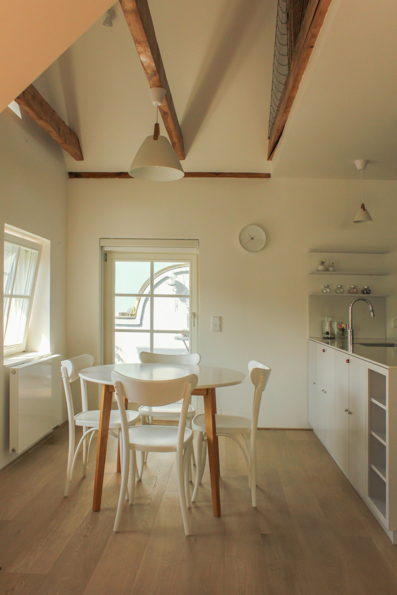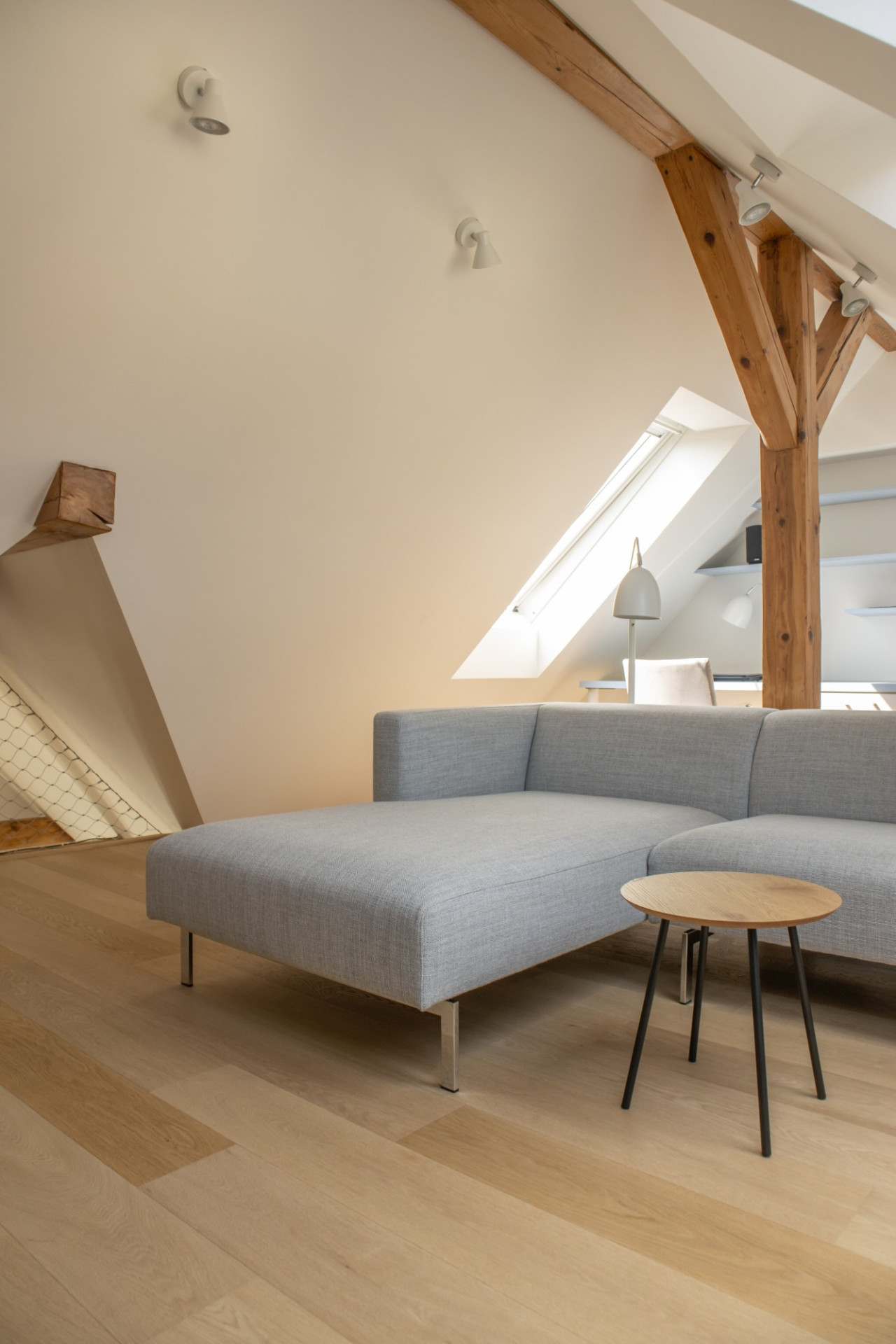 Celý interiér hraje příjemným kontrastem starého přiznaného krovu v přírodním odstínu dřeva a nových interiérových prvků světlých odstínu. Nové prvky dodávají interiéru svěžest a vzdušnost, odkrytý krov zase patinu minulosti, oba vytvářejí harmonický celek nového prostředí pro rodinný život, který působí vzdušně, přívětivě a vizuálně větší, než je reálná velikost bytu.
