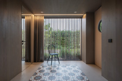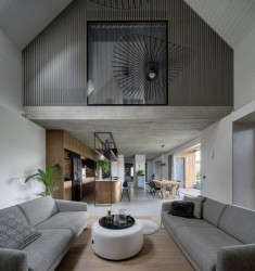 Interiér domu je charakteristický svou střídmostí. Tlumená paleta barev nechává vyniknout kombinaci betonu a dřeva, dvou materiálů, které spolu vytvářejí pevný, a přesto velmi příjemný rámec každodenního života. Monolitický betonový strop nese stopu bednění a dává prostor pro lehkou industriální linku, kterou vyvažuje přirozenost dubového dřeva.