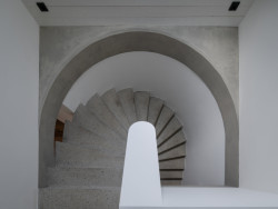 Výrazné točité schodiště vnáší do interiéru jemnou křivku, která přirozeně vyvažuje pravoúhlé linie okolního prostoru. Stává se nejen funkčním, ale také subtilním uměleckým prvkem. Minimalistická kresba surového betonu na jeho povrchu dodává schodišti charakter, který prostor dále kultivuje.