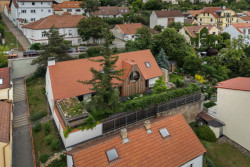 V pražských Střešovicích ještě zbylo pár malebných domků z 19. století. Tenhle byl v havarijním stavu, ale na jeho základech a sklepě vznikl nový dům s podobnou atrmosférou. Má červenou střechu z pálených tašek a bílou vápennou omítku, zároveň i současný výraz a elegantní detaily.