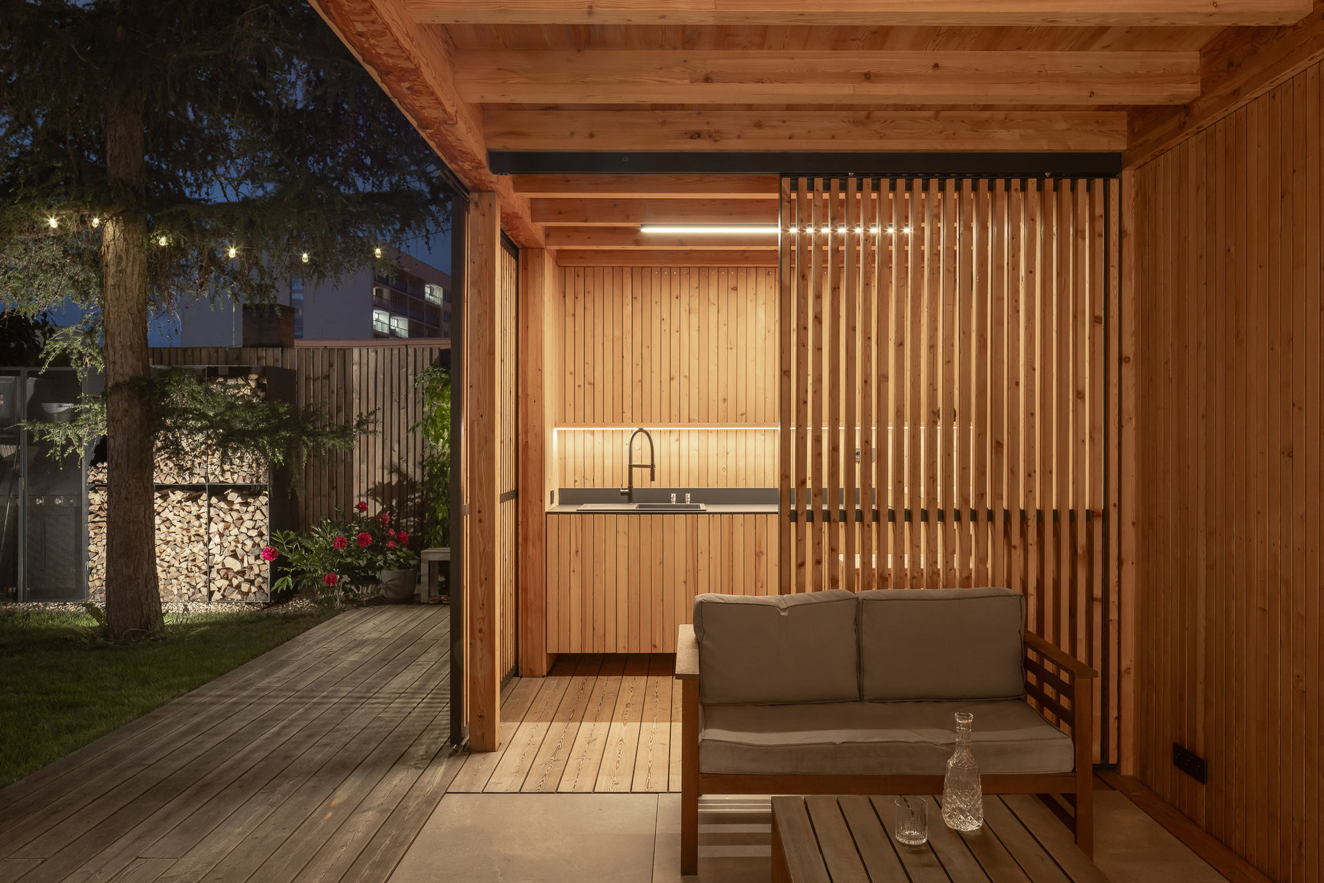 Korunou zrekonstruovaného domu je dřevěný balkón, jehož kruhový otvor rámuje výhled na město a propojuje interiér s exteriérem. Balkón je tvořen úzkými dřevěnými latěmi, které dotvářejí charakter domu a současně se uplatňují při realizaci stěn venkovních prostor, například sprchy či terasy.